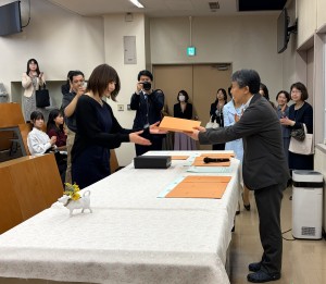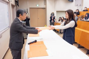 本学内の七十年館にて表彰式が行われました。通信教育部長の飯田先生をはじめ、食物学科長の新藤先生、特任教授である浅野先生や同学科の先生方もご出席され、談笑を交えながら式は和やかに進みました。