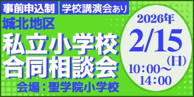 城北地区私立小学校合同相談会に参加いたします。 2026年2月15日(日)10:00~14:00 会場:聖学院小学校 ※事前申込み制 詳細・お申し込みは下記バナーのリンク先からお願いいたします。