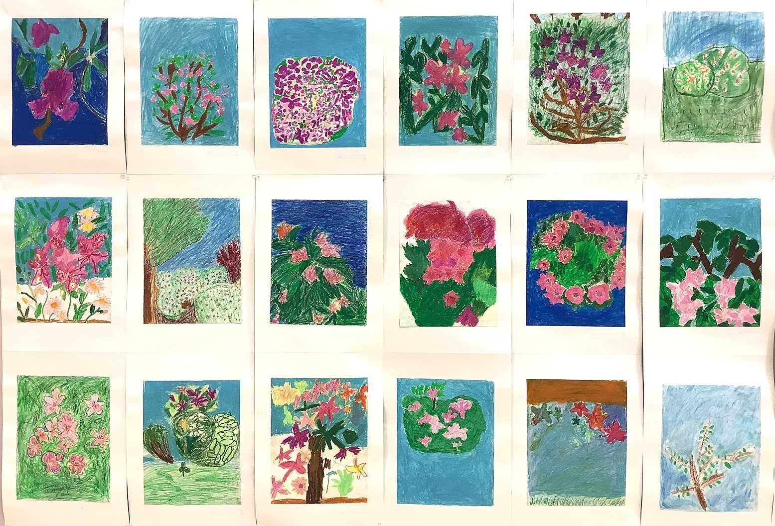 4月26日から29日まで、写生会作品展が行われました。1年生がはじめて図工の授業で描いた作品も、渡り廊下の豊明ギャラリーに展示しました。ずらりと作品が並ぶと、その景色がよみがえってきます。苑内を散歩するように各学年の絵を見ていると、春風が頬をなでたような気がしました。