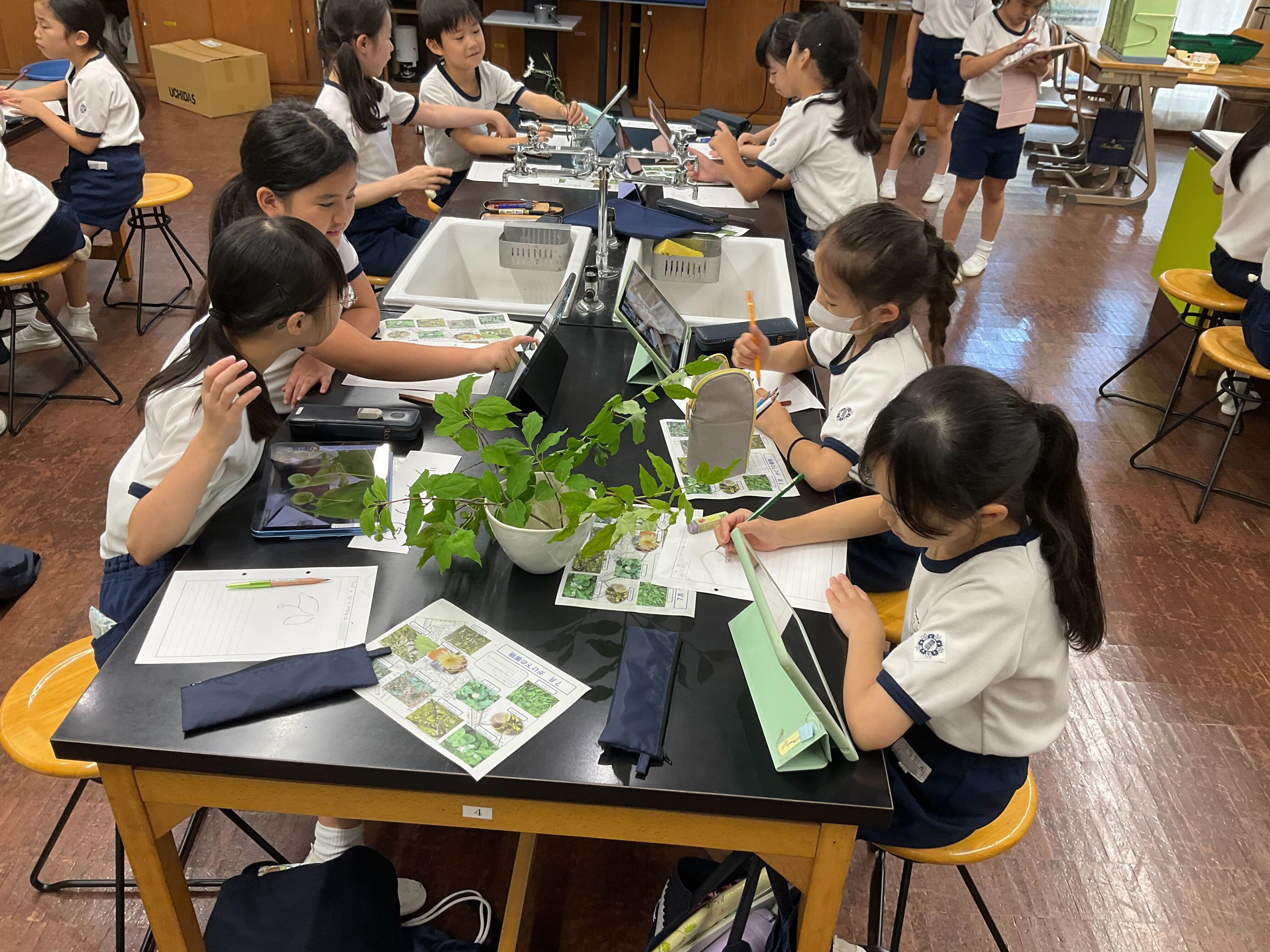 理科教員が、朝のうちにがけ下教材園から植物を採集し、理科室にセッティングします。児童は、iPadで写真を撮り、細かなつくりを拡大して観察したり、香りや触った感じ、大きさなどは実物を使って調べていました。