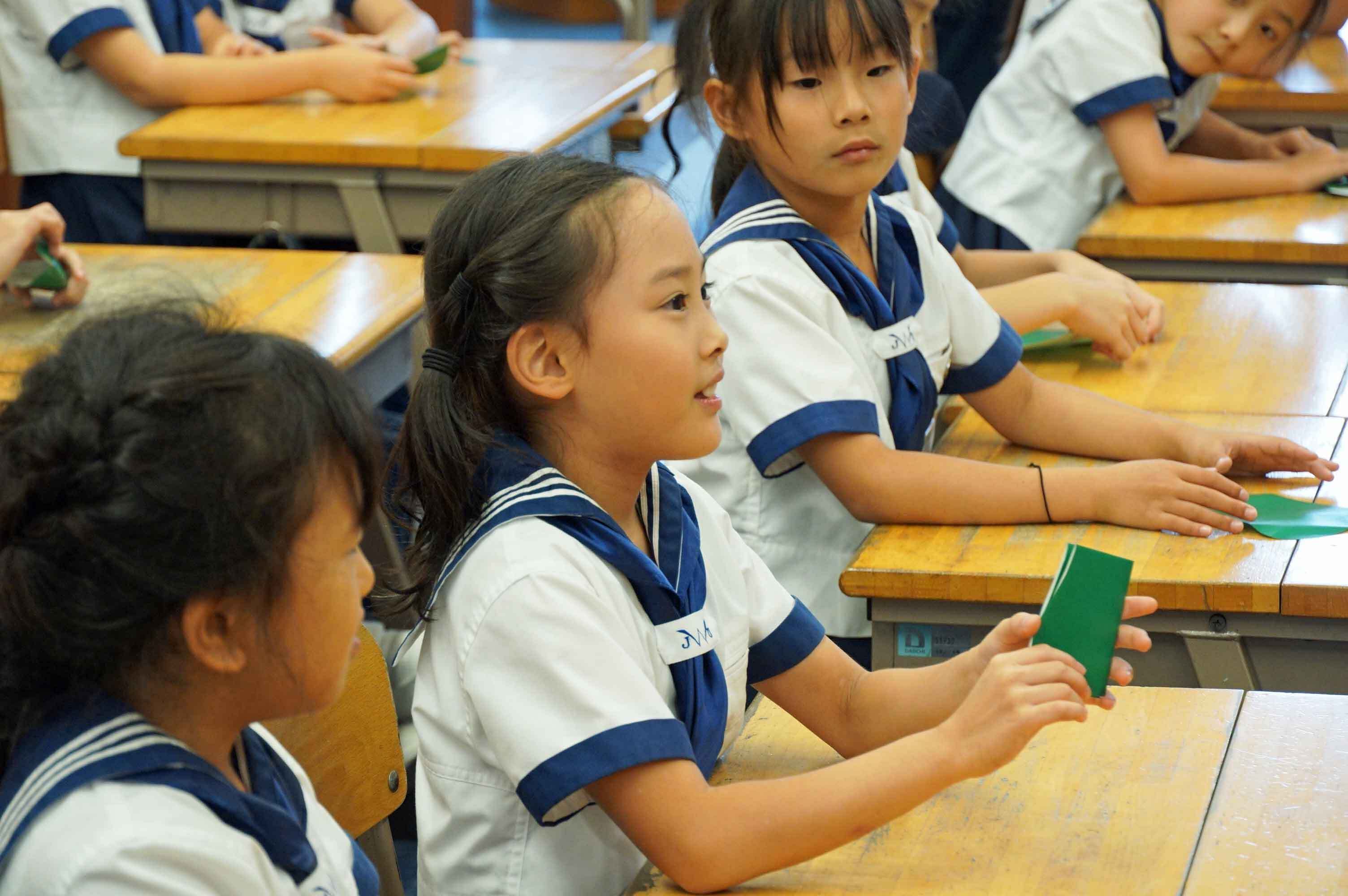 次は、なるべく少ない回数折って「角」を作ろうということになりました。みんな試行錯誤しながら、手を動かして探っていきました。そのうち「分かったかも!」「分かった!」「できた!」の声。「角」を作るには2回折らなくてはいけないことを発見しました。