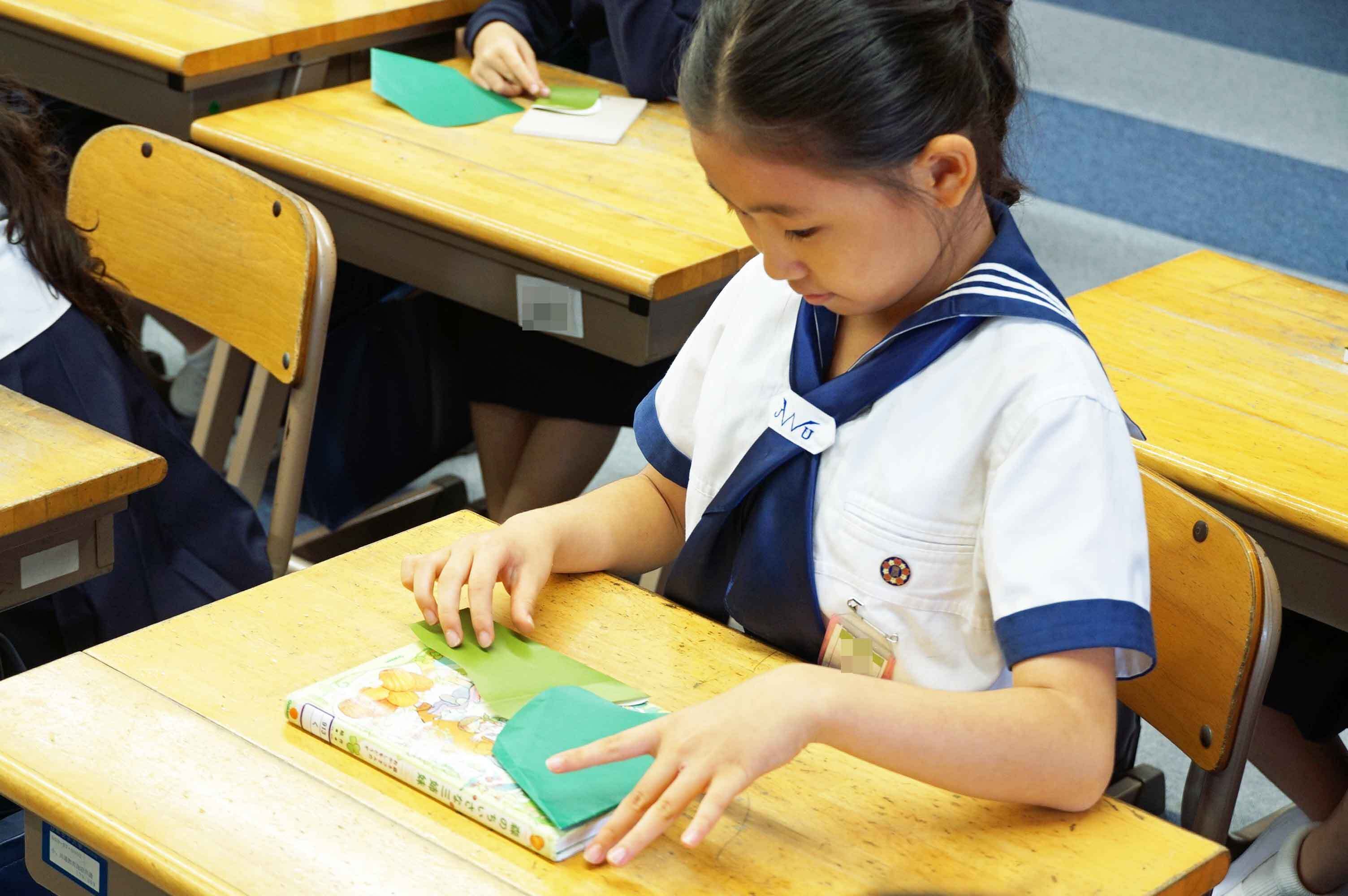 そしてその中から「マジック角」を作った子が出てきました。「マジック角」というのは「直角」のことのようです。どうやって作ったのか、みんなの前で発表して、クラス全員が実際に作ってみることになりました。真ん中で2つに折って、折り目の辺をきっちり合わせてもう一度折って…… 出来た直角を、机の中の本や教科書・ノートなどの角に合わせて確認しました。すると身のまわりにたくさんの直角が!というところで、この時間は終了です。