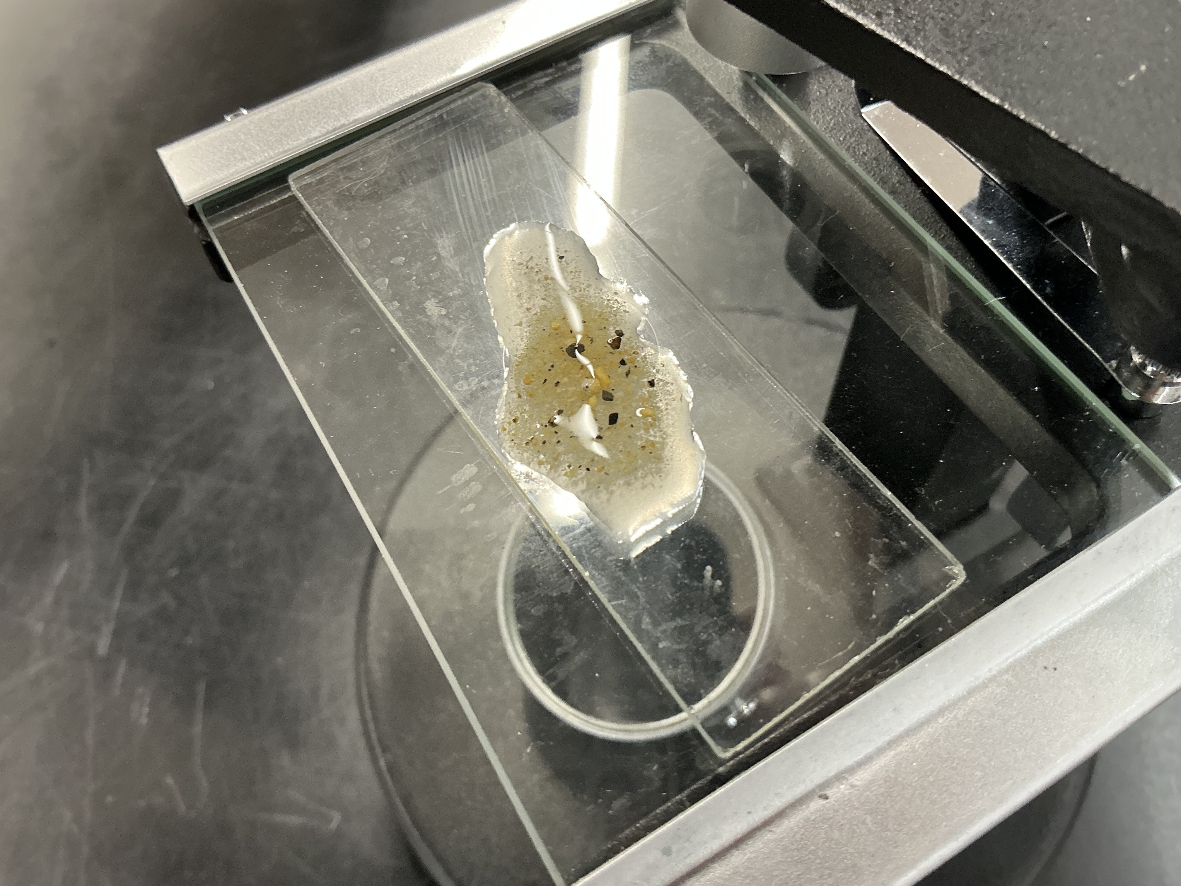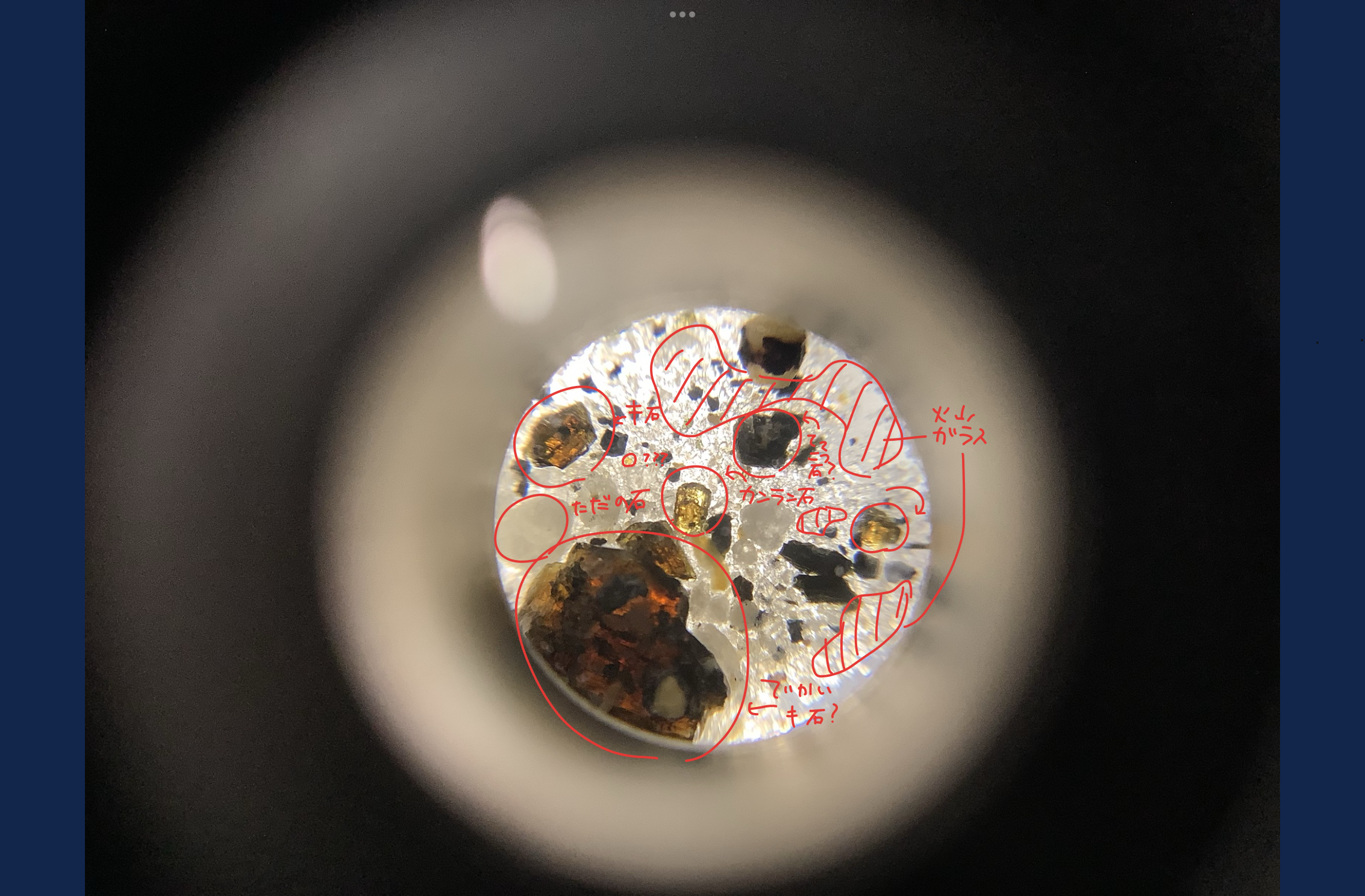 その部分をスライドガラスに乗せ、顕微鏡で観察するとマグマからできた様々な種類の結晶「鉱物」を見つけることができます。