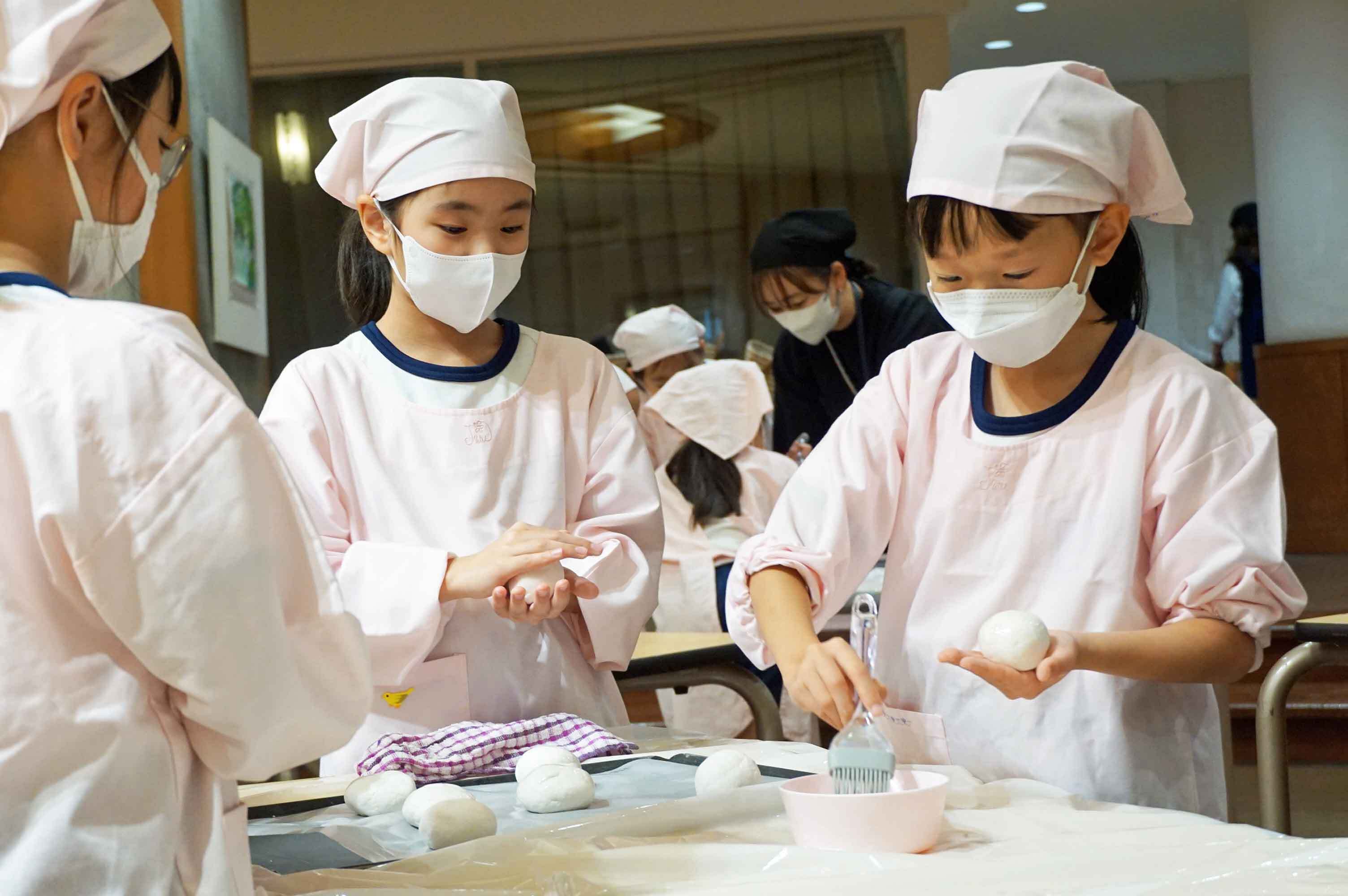 来月に食品工場の見学を控えた2年生が、パン作りにチャレンジしました。工場の大量生産と手作りとの比較を、実際の体験を通して学びます。