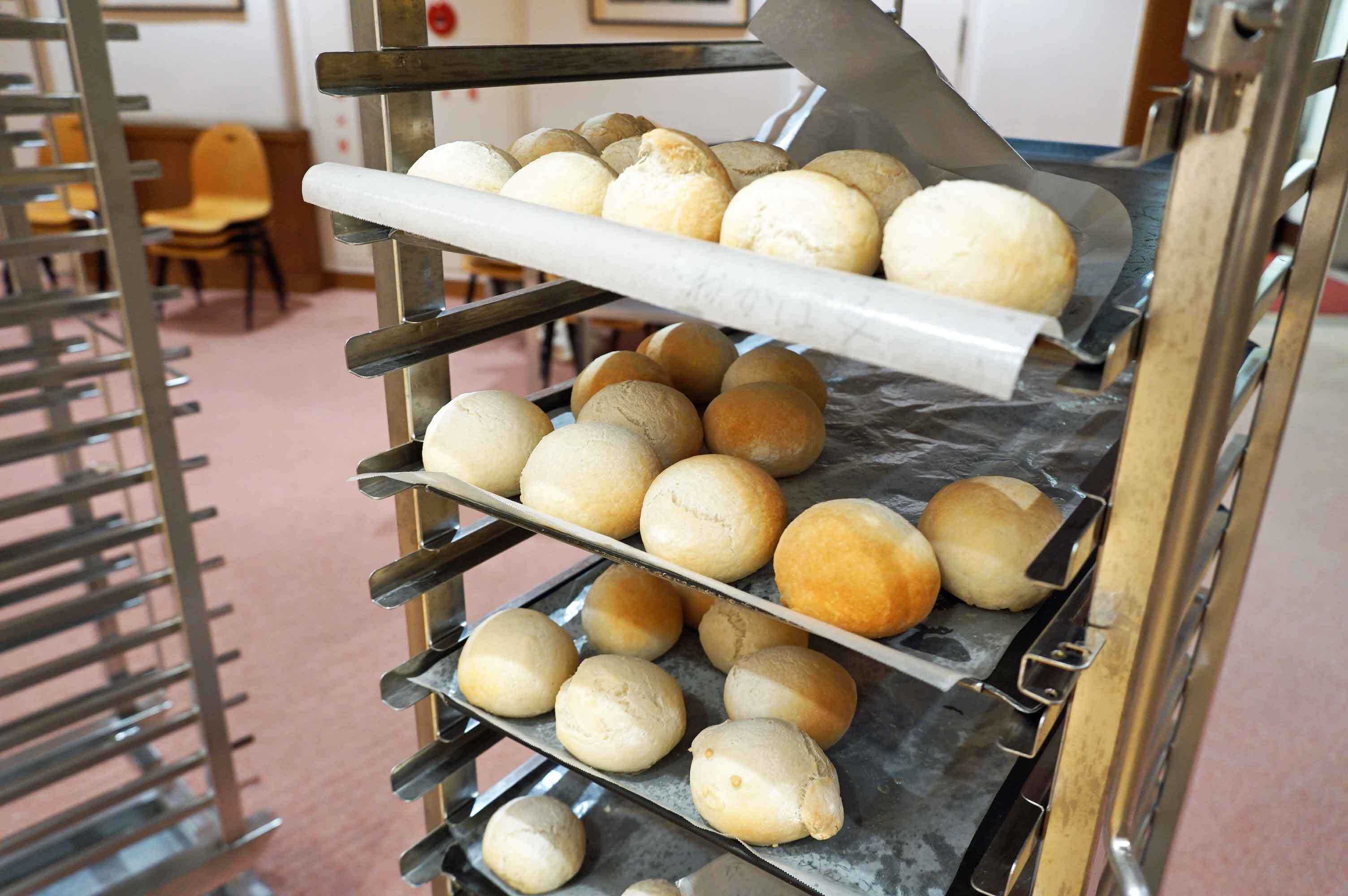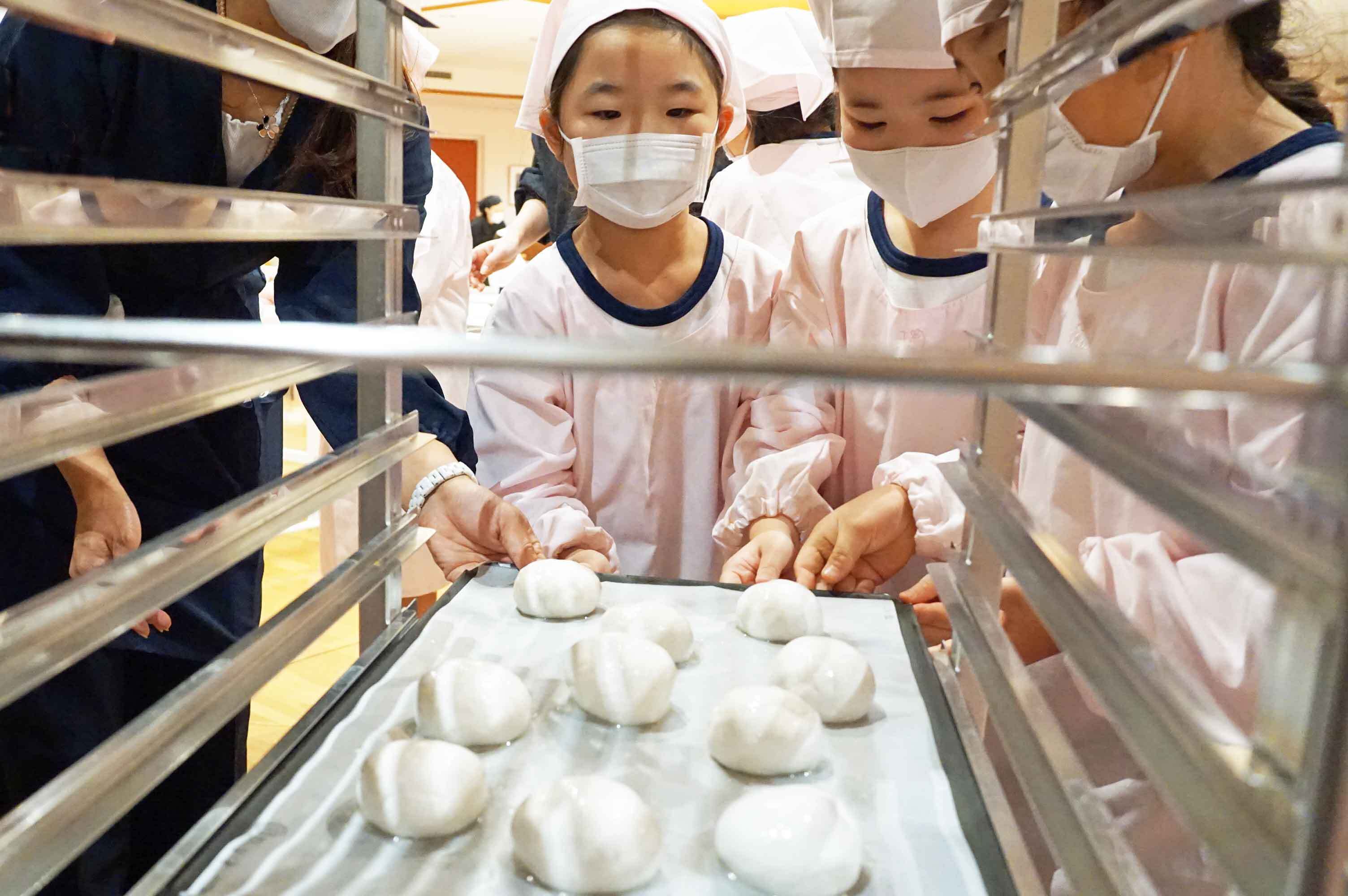 給食室のオーブンで焼いた出来たてのパンは、ほっかほかのモッチモチです。教室でおいしくいただきました。