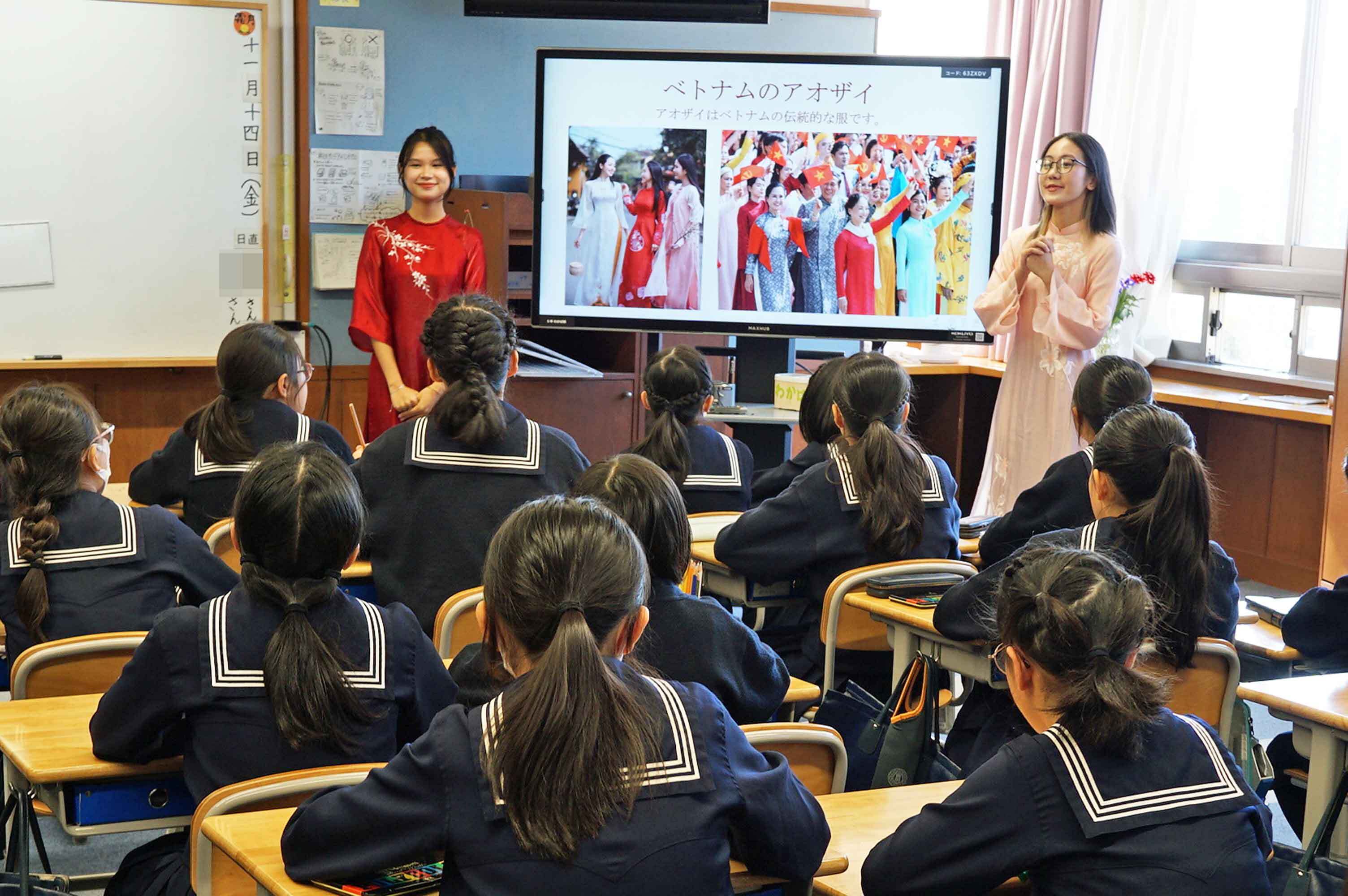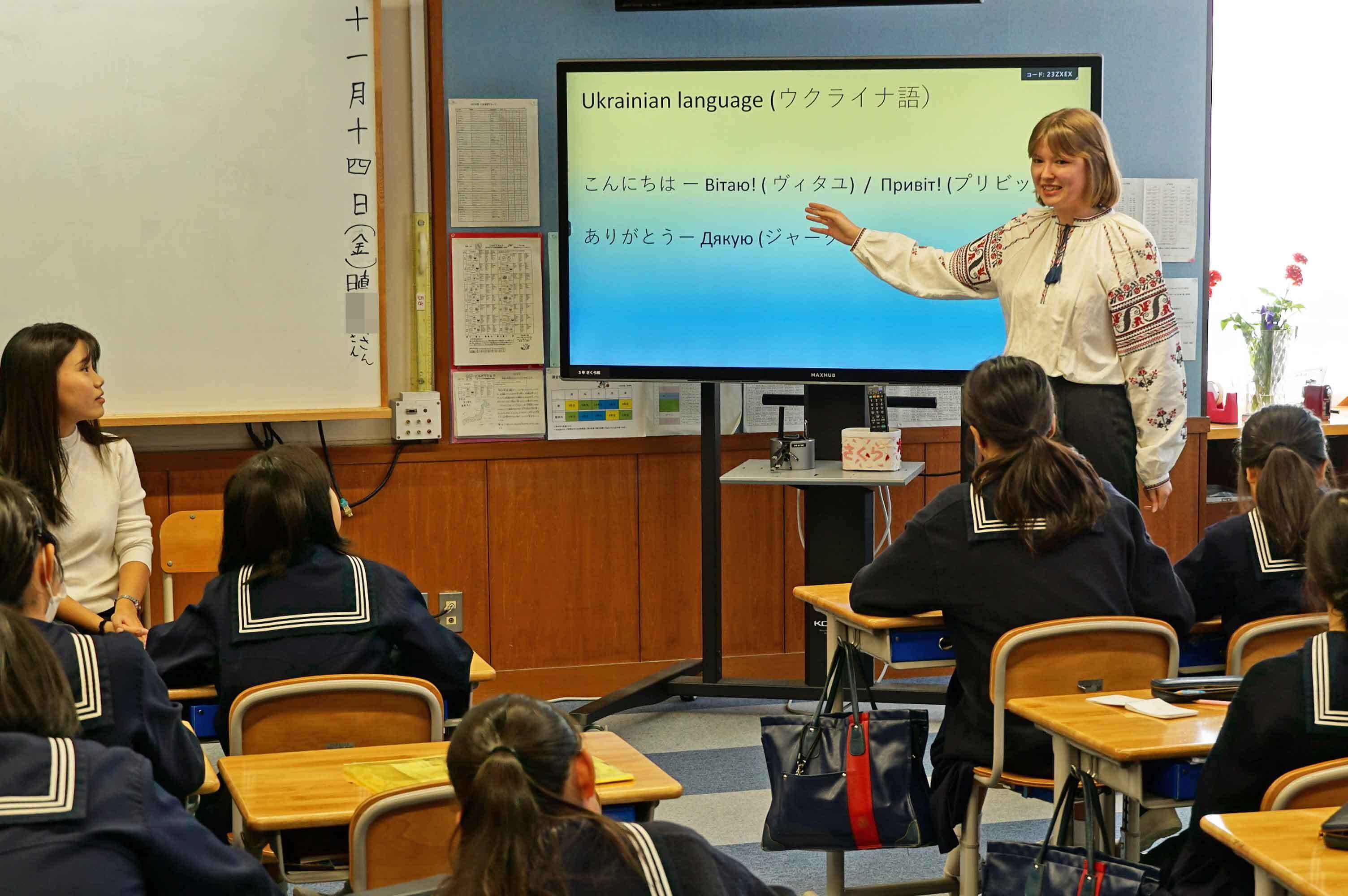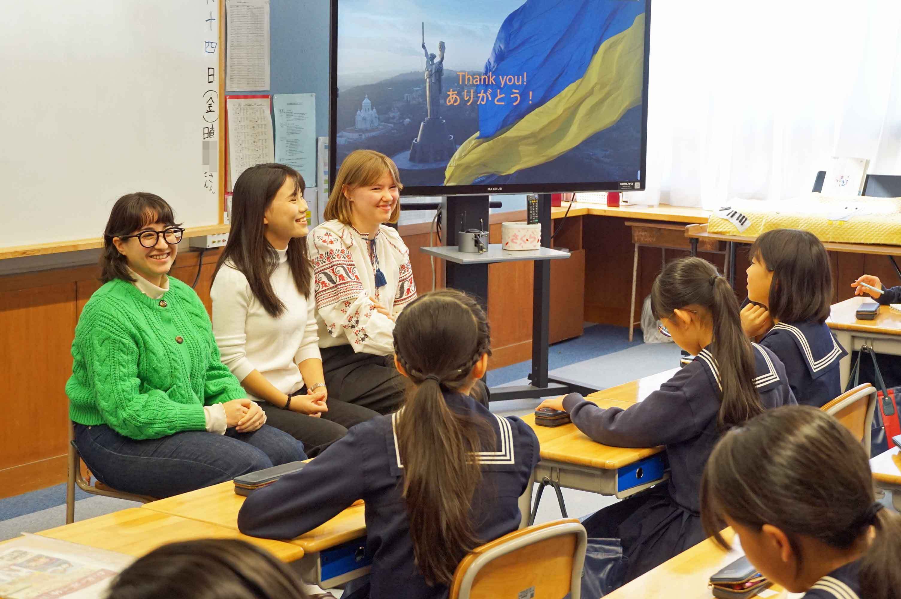 今年は日本女子大学で学ぶ留学生のお話です。ウクライナ、オランダ、韓国、スウェーデン、台湾、中国、トルコ、フィリピン、ベトナム(50音順)…9つの国と地域出身の皆さんが3クラスに分かれ、それぞれの文化や暮らしについて、英語や日本語でプレゼンテーションをしてくれました。初めて知ることや驚くことがたくさんあって、子どもたちは目を輝かせて聞いていました。