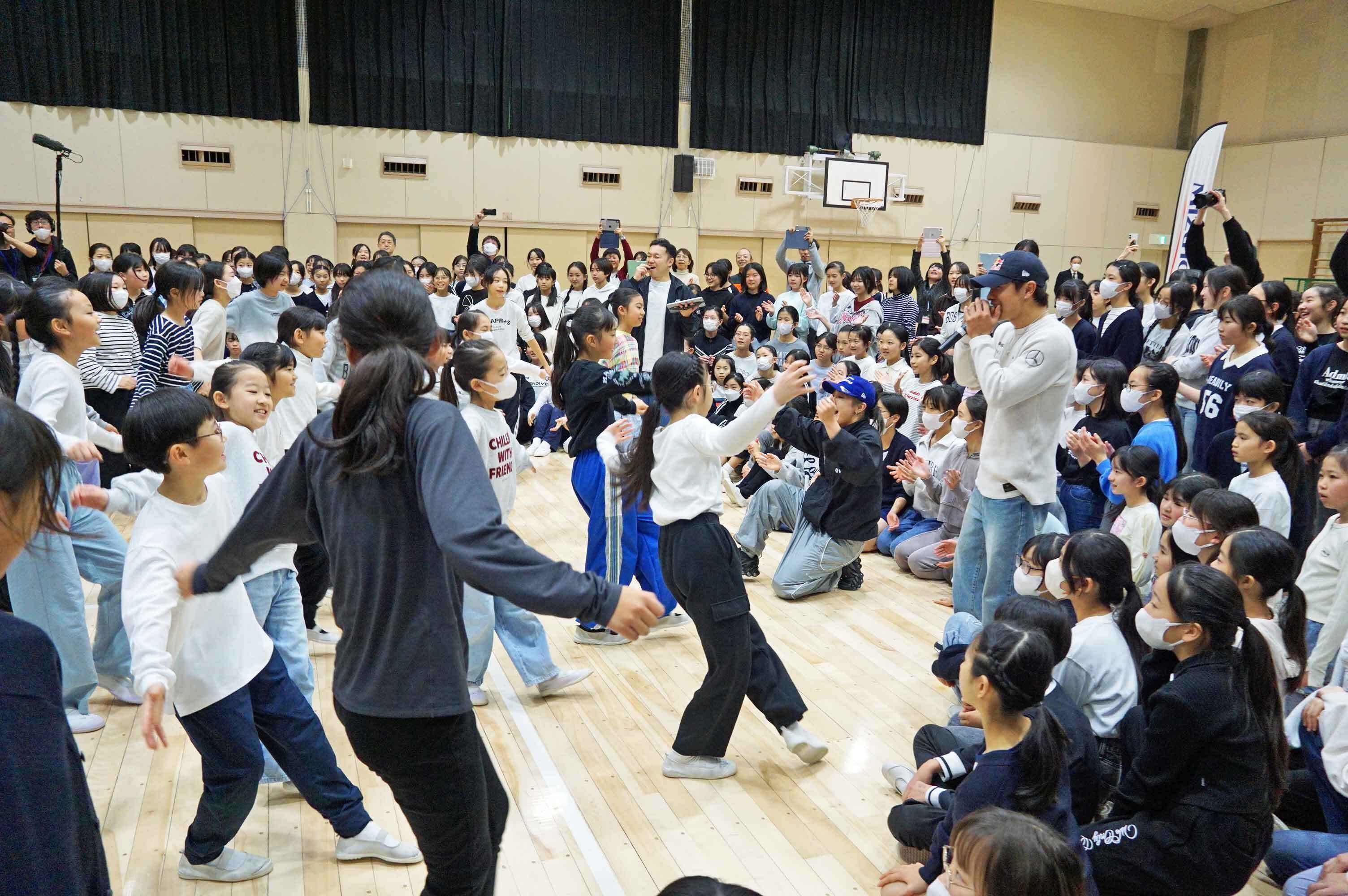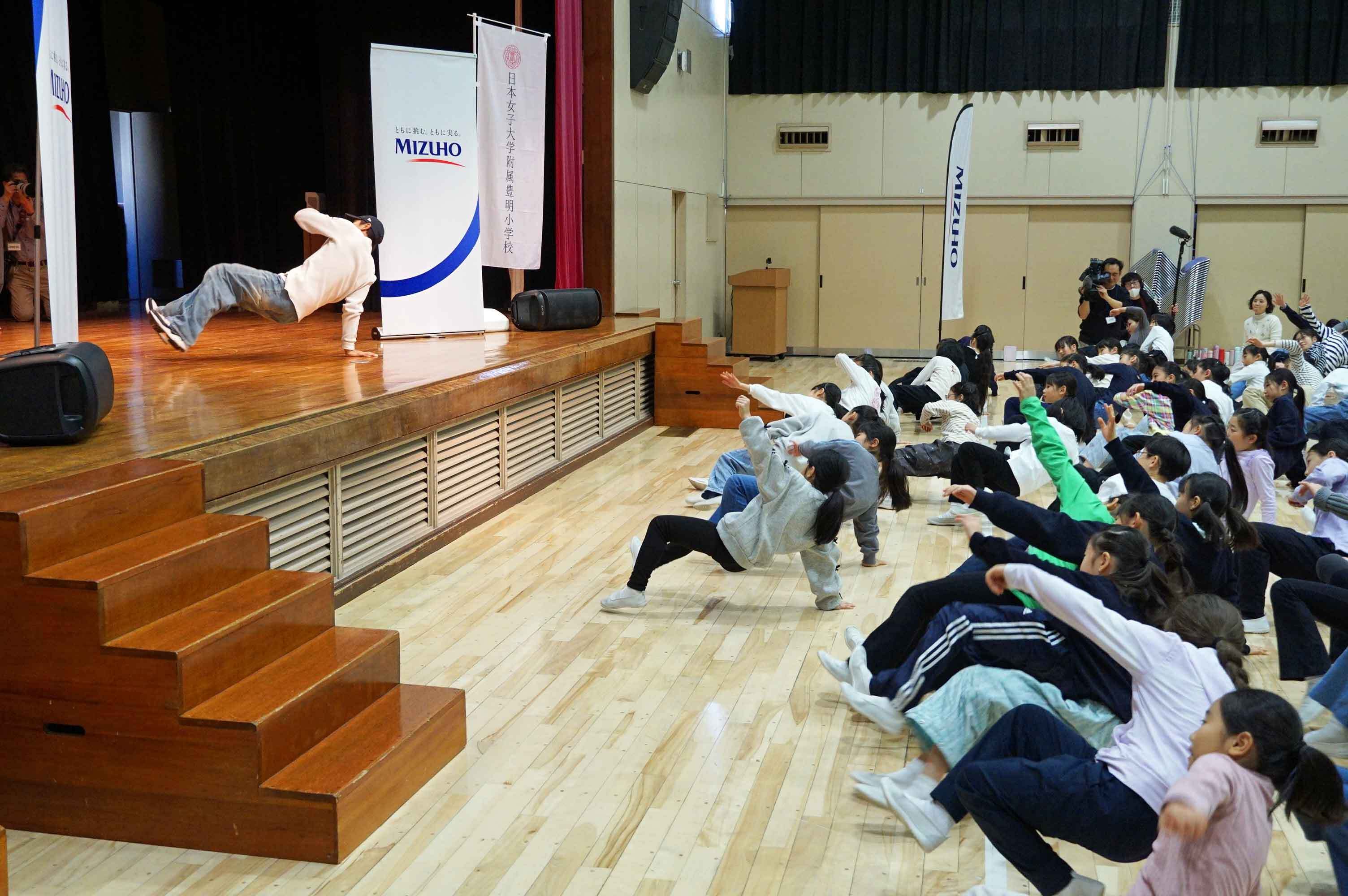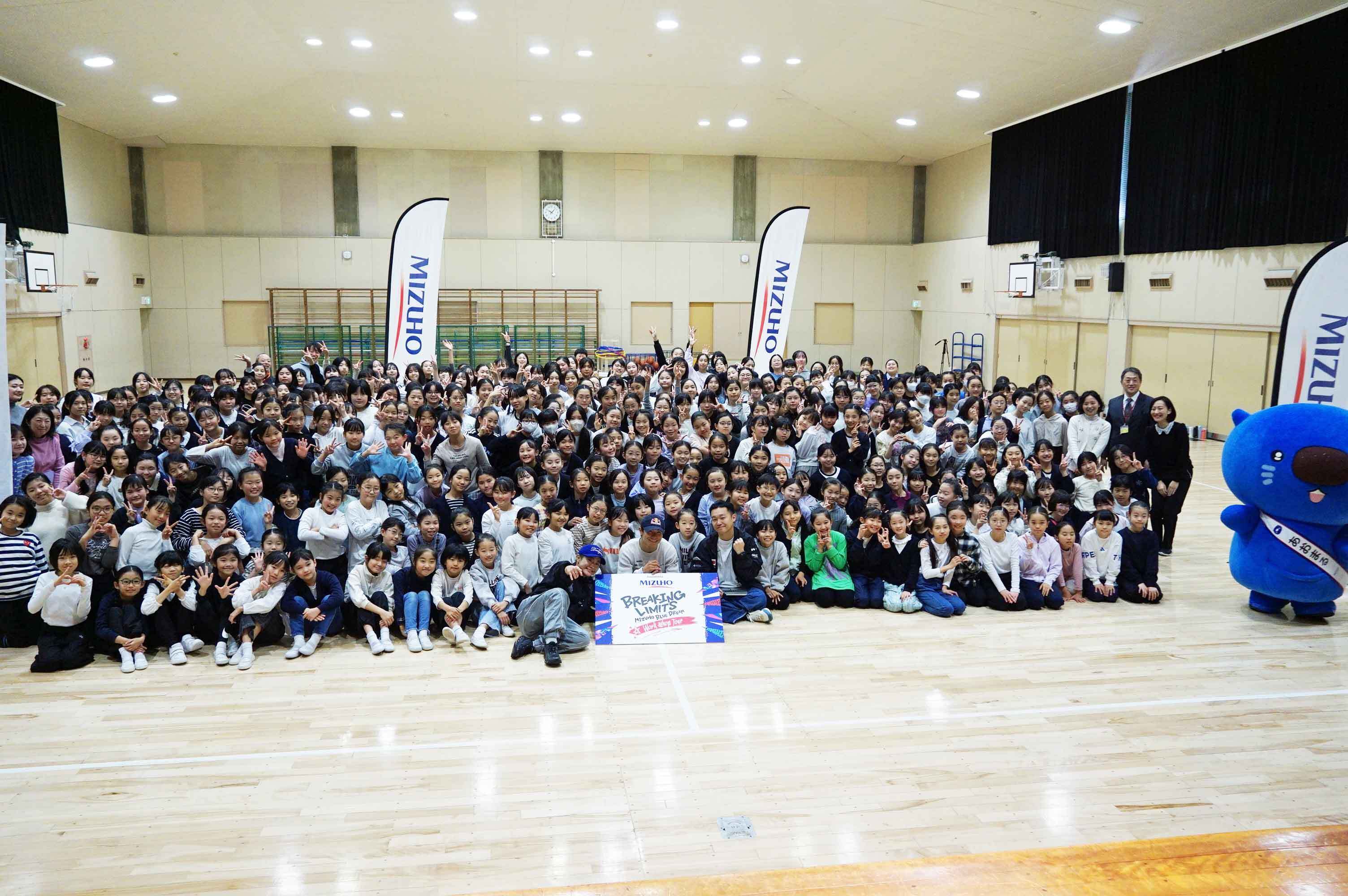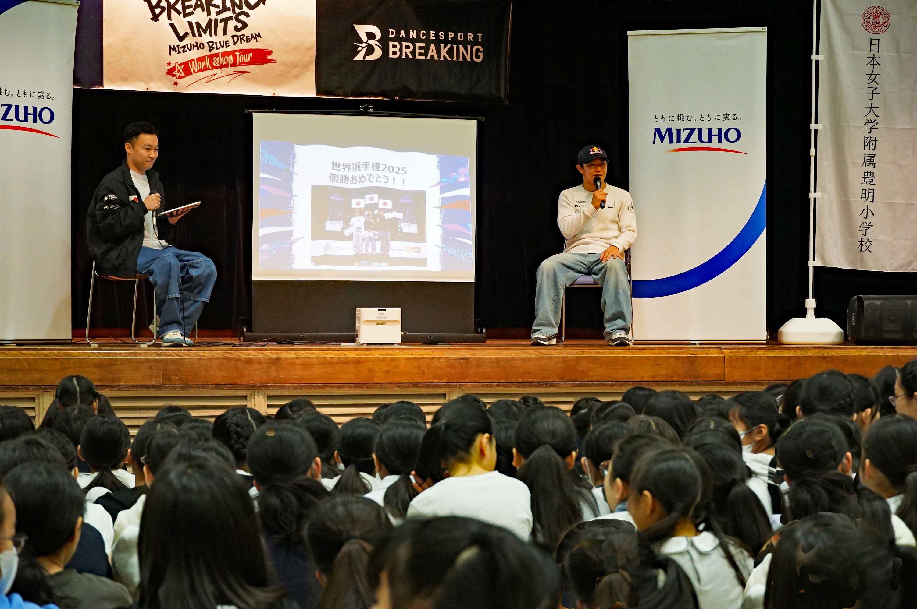 今回はMIZUHO BLUE DREAM BREAKING LIMITS ワークショップツアー2025の一環として、豊明小学校で4~6年生全員を対象にトークセッションとブレイキン体験会を開いて下さいました。