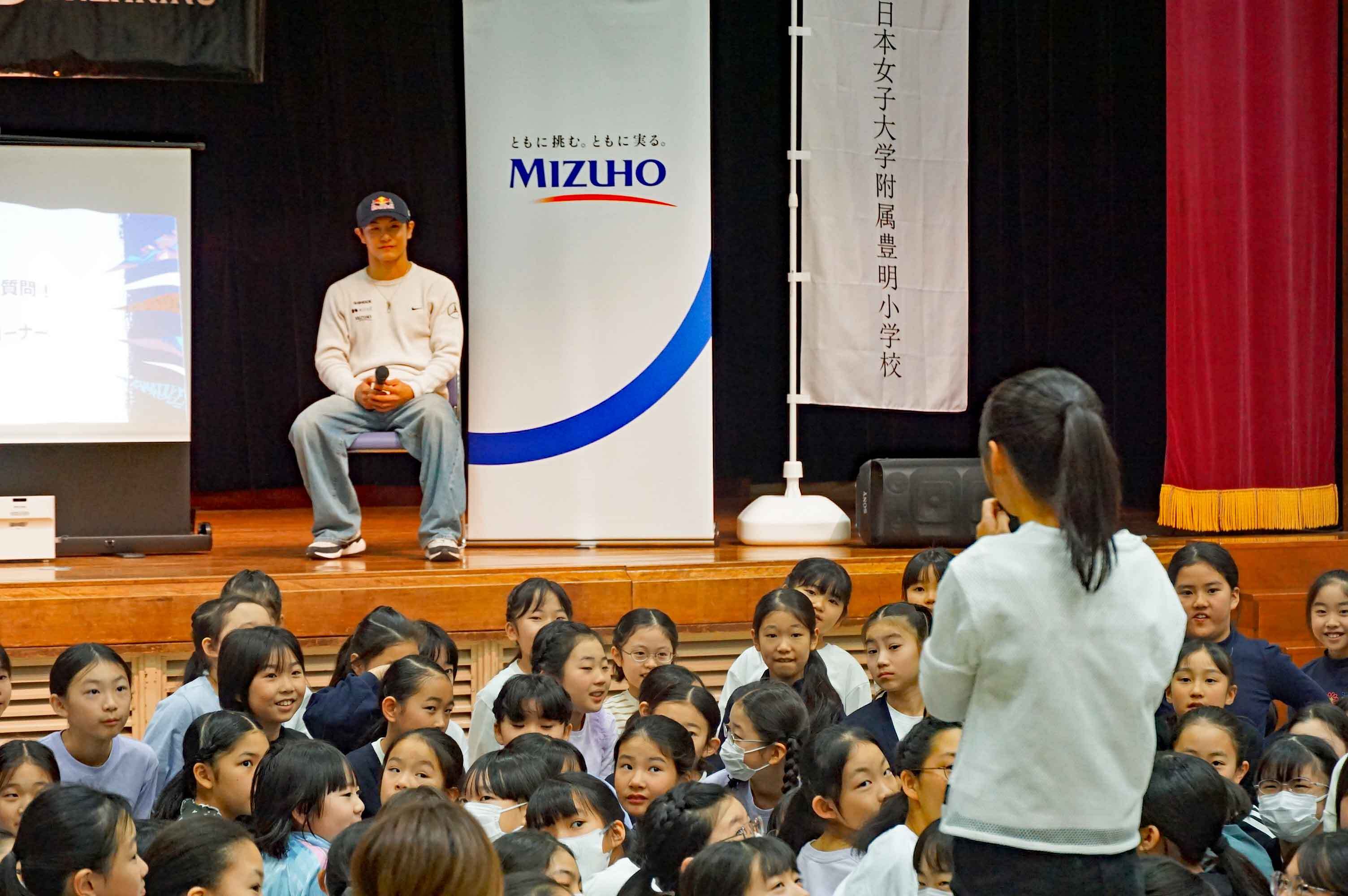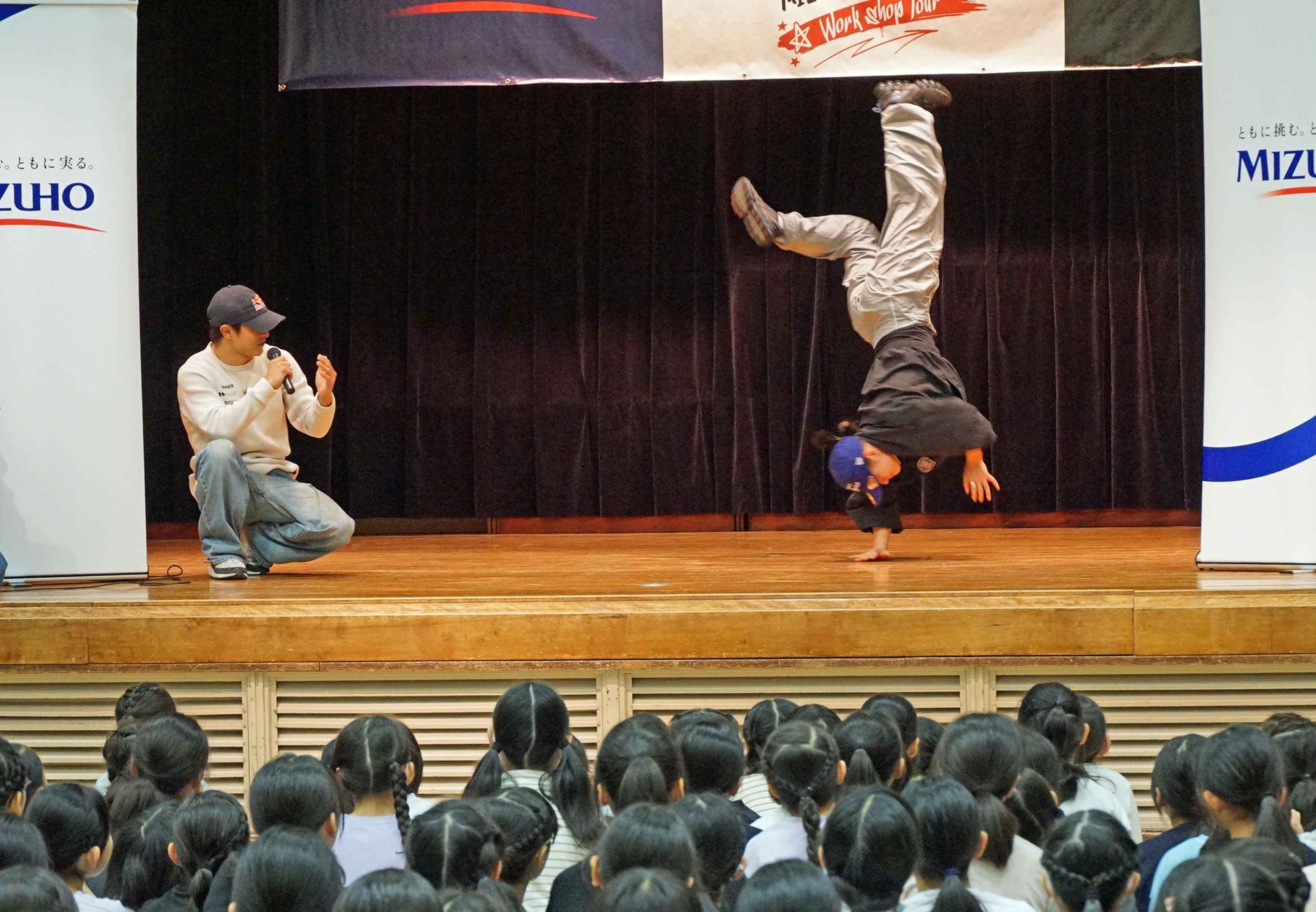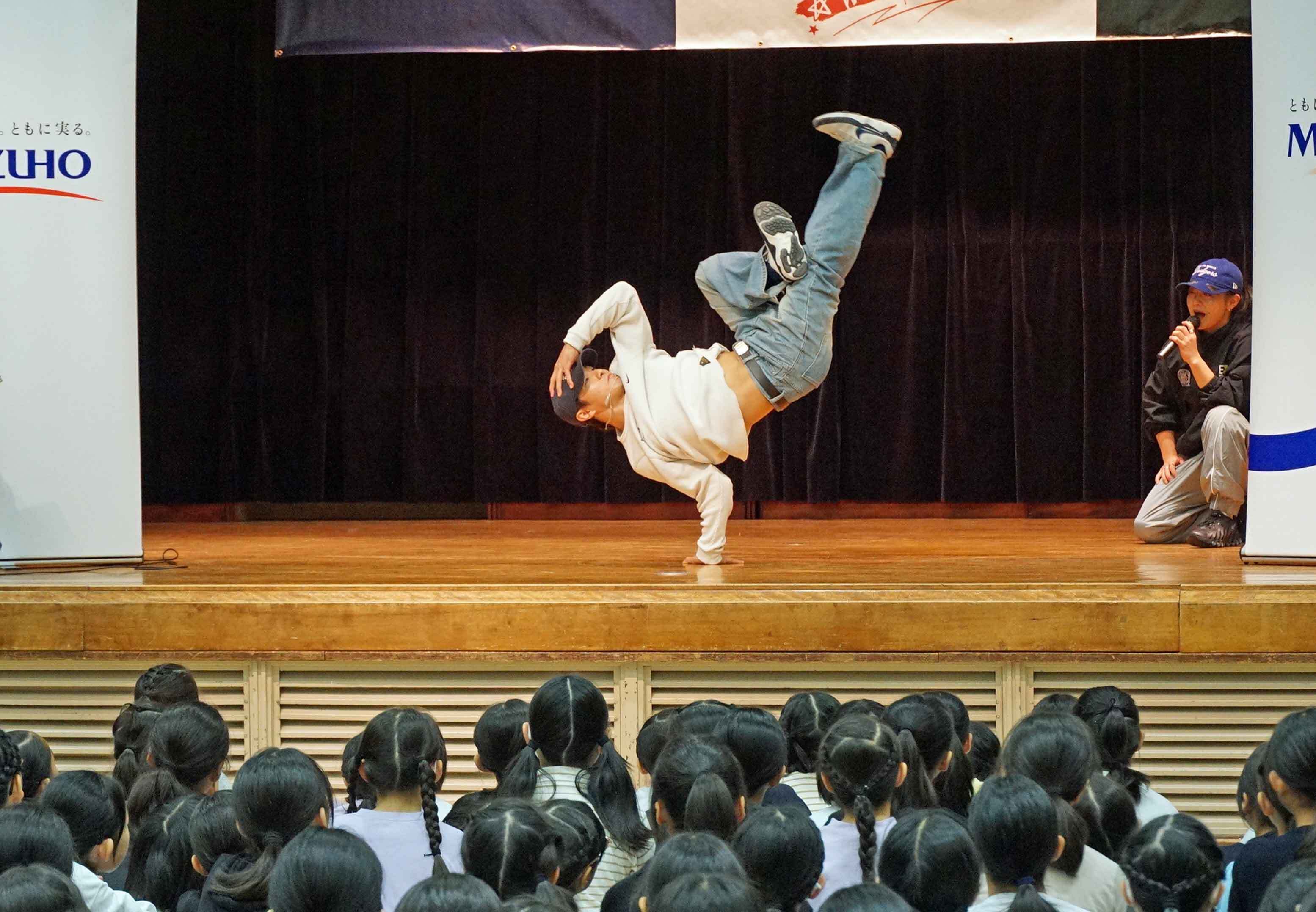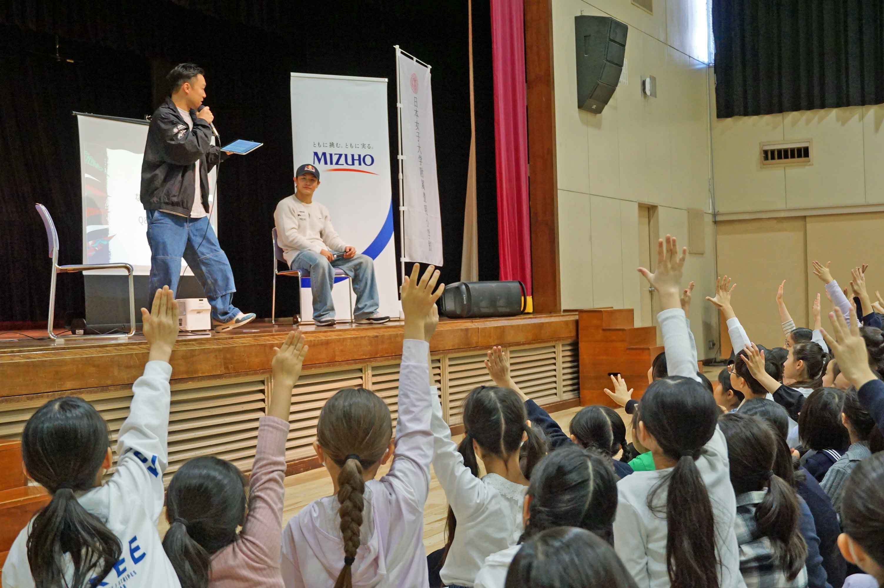 今回はMIZUHO BLUE DREAM BREAKING LIMITS ワークショップツアー2025の一環として、豊明小学校で4~6年生全員を対象にトークセッションとブレイキン体験会を開いて下さいました。