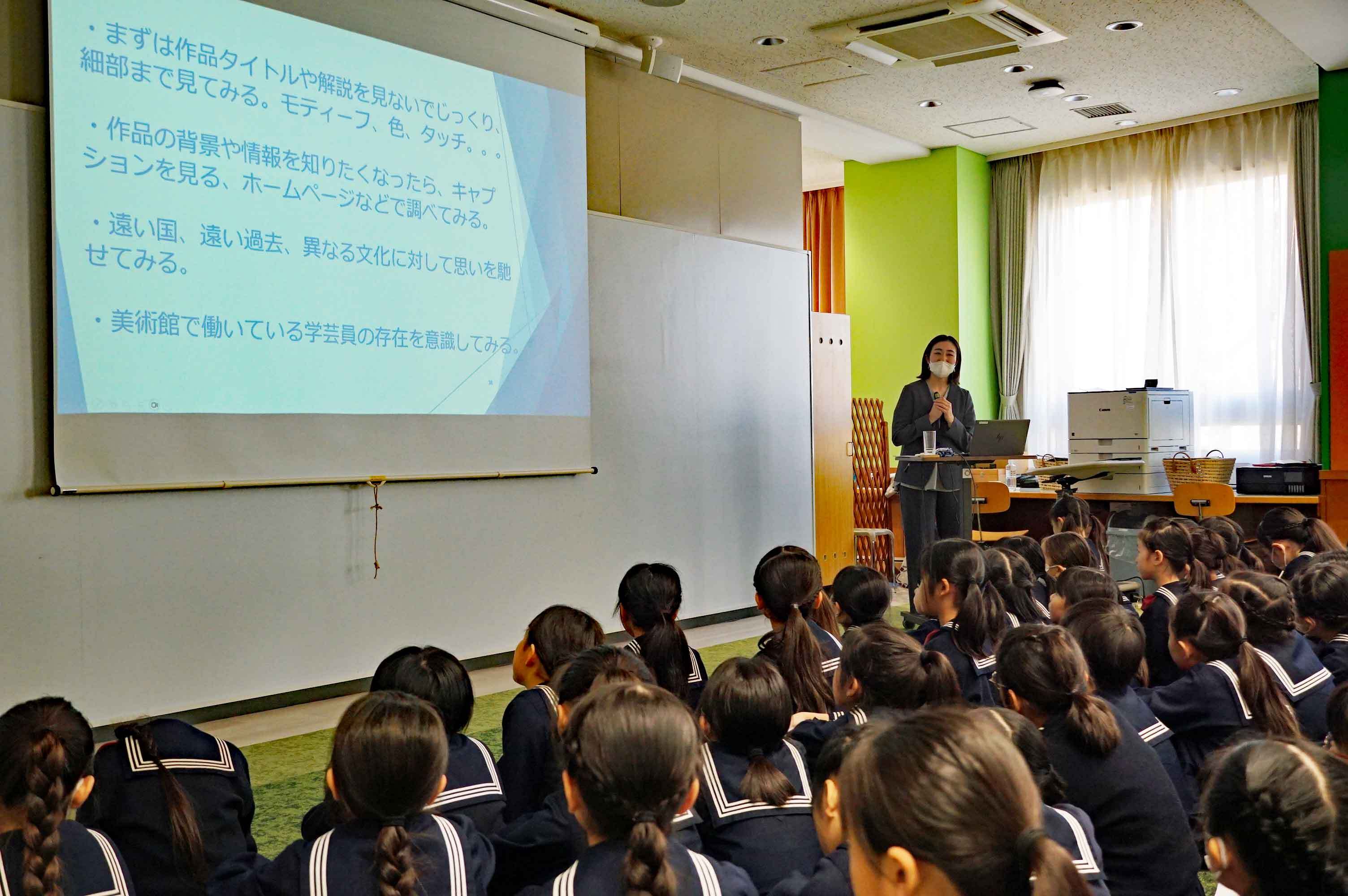 先日、上野の国立西洋美術館を見学したばかりの4年生に、同館のキュレーター(学芸員)として第一線で活躍されている久保田有寿さんが、「美術館の仕事とこれまでの歩み」と題してお話をして下さいました。久保田さんは本校の卒業生。ピカソをはじめとする20世紀西洋美術研究の専門家として、これまで様々な展覧会を担当されました。
