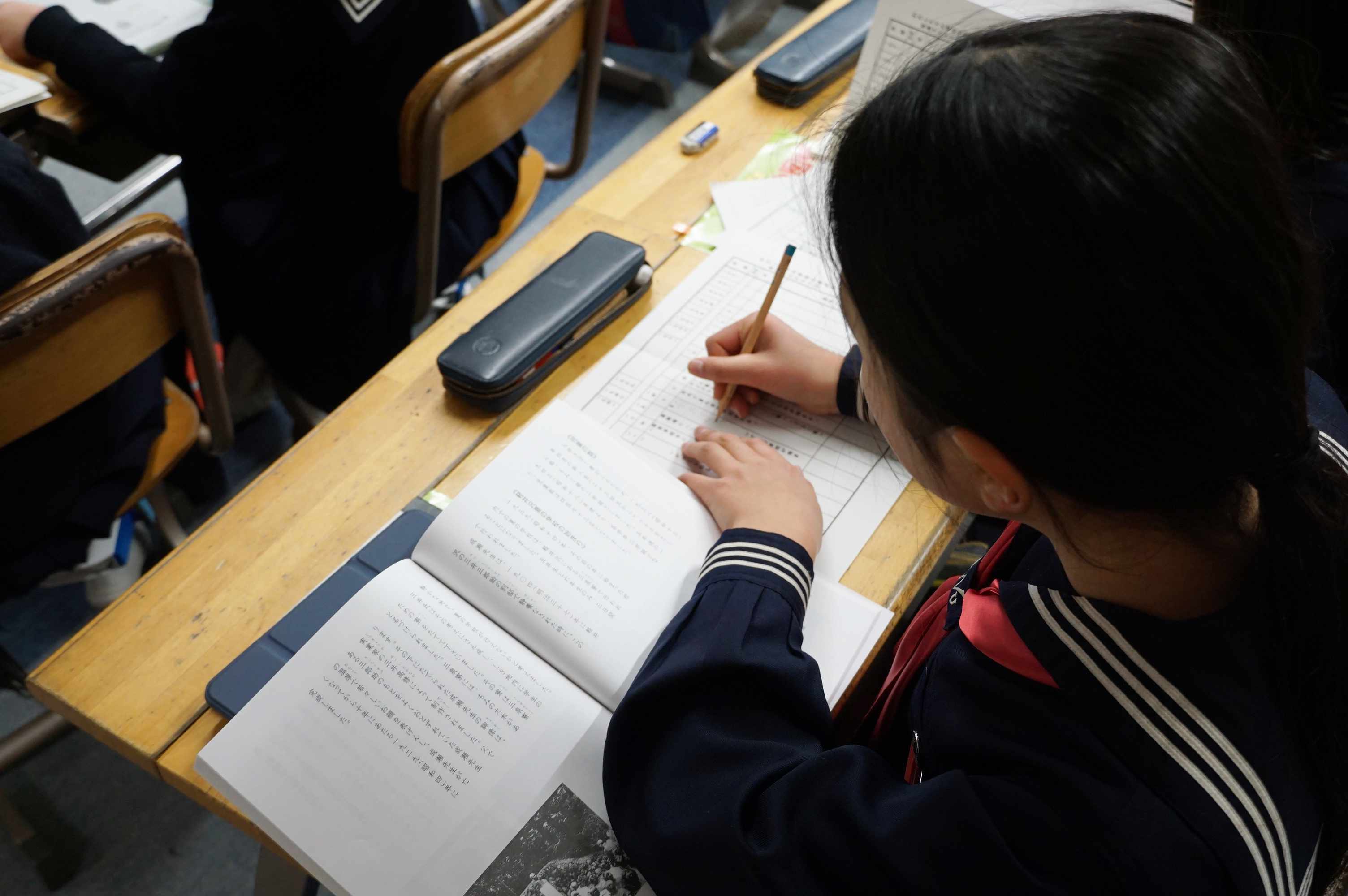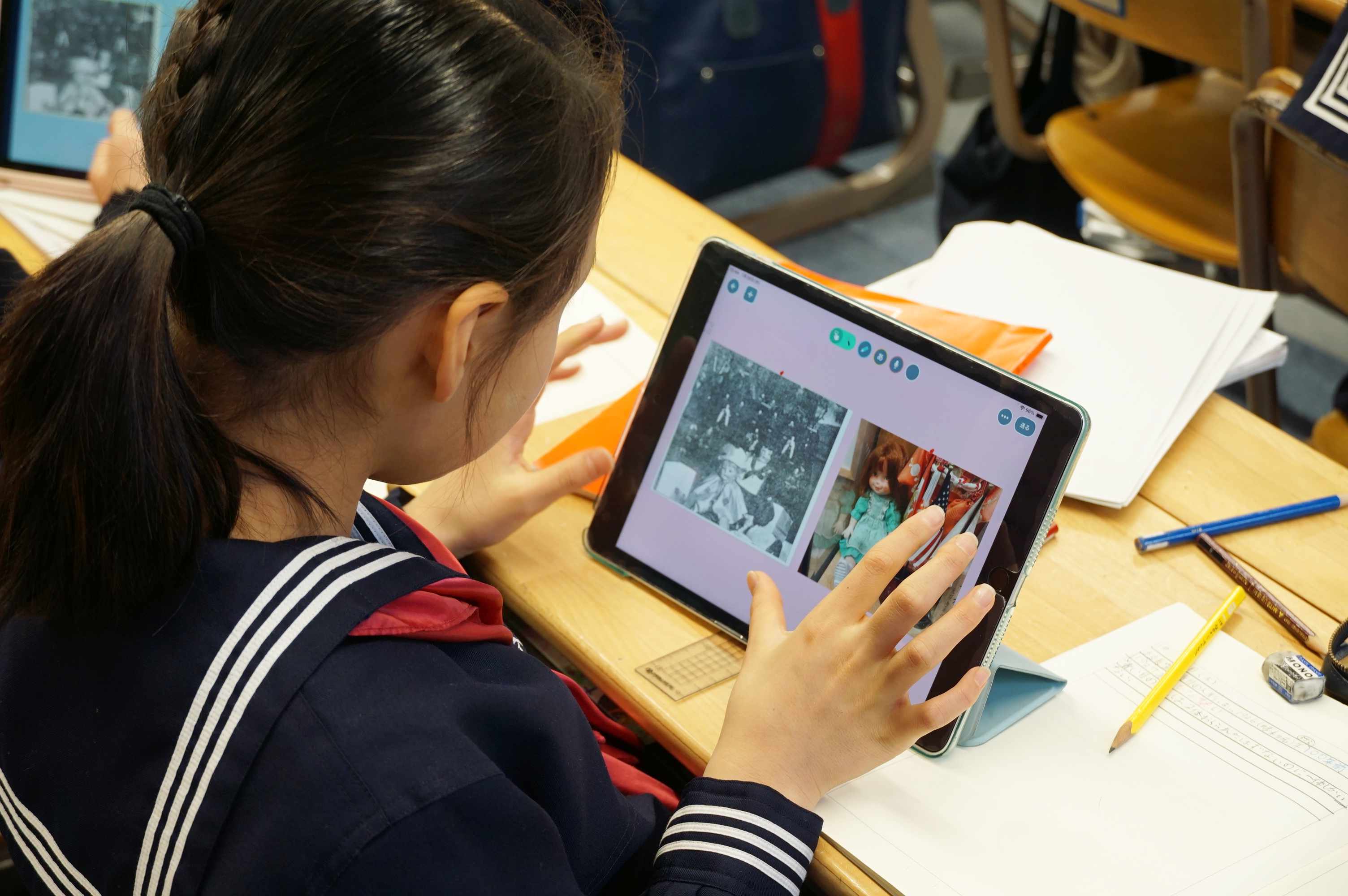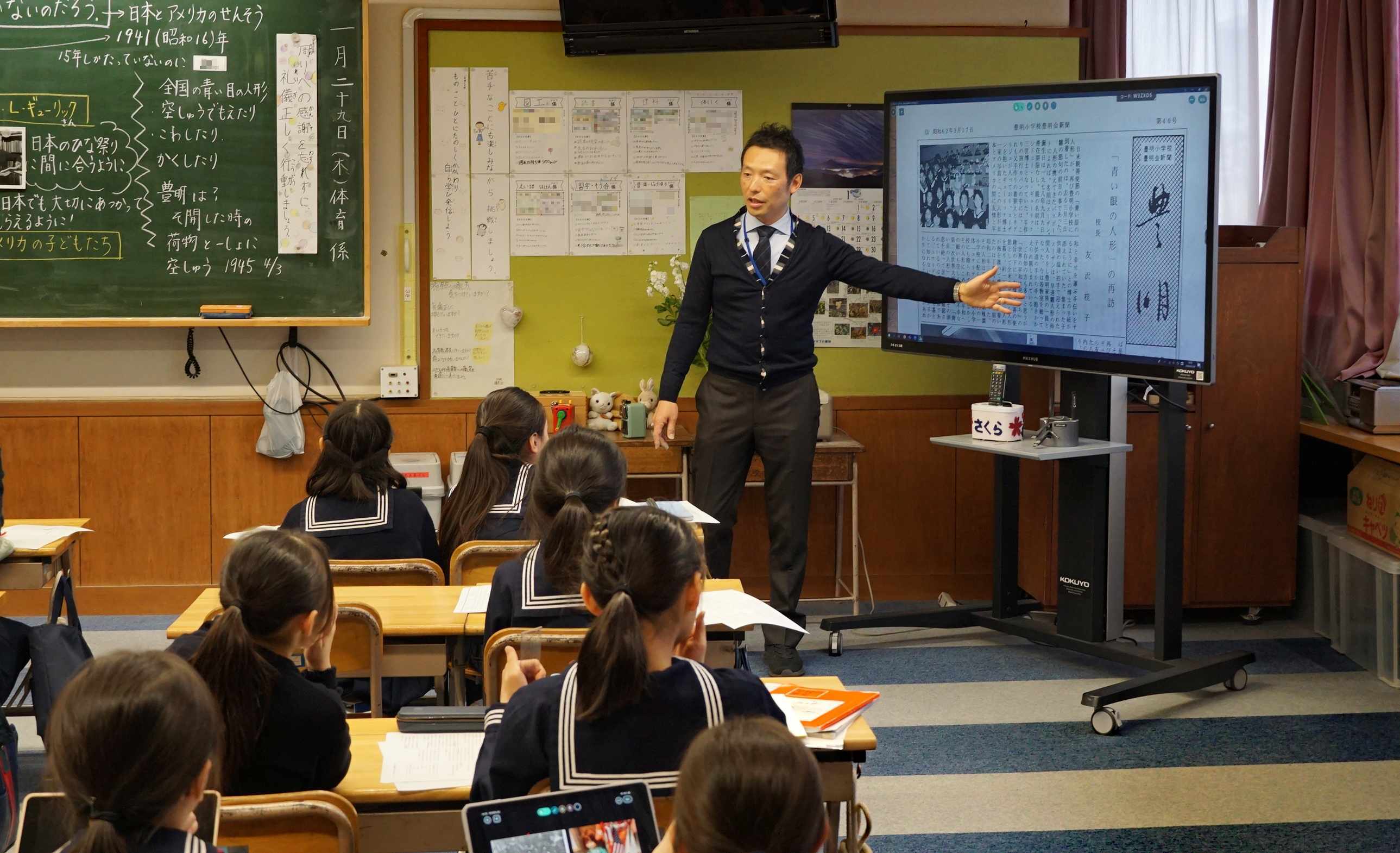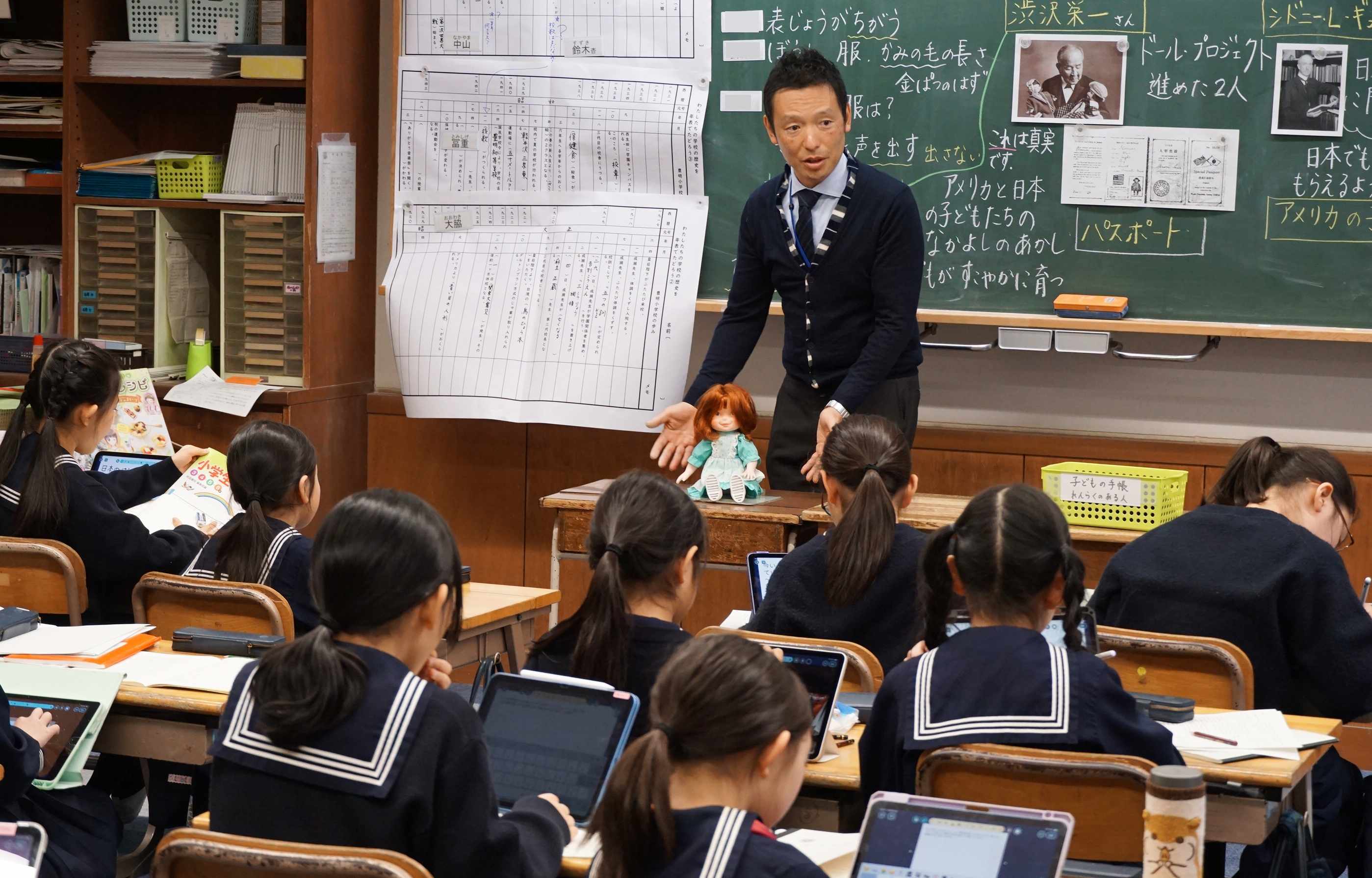 この日は3年生の社会科の授業がOpenClassとして設定されました。「学校の歴史」をテーマに時代の移り変わりを学ぶこの日の授業は、校長室にある人形(通称青い目の人形)の歴史を紐解きながら進みました。