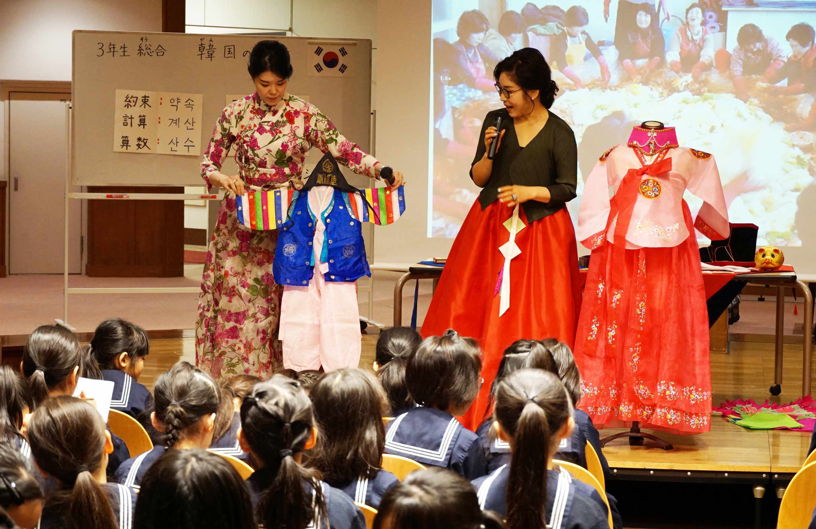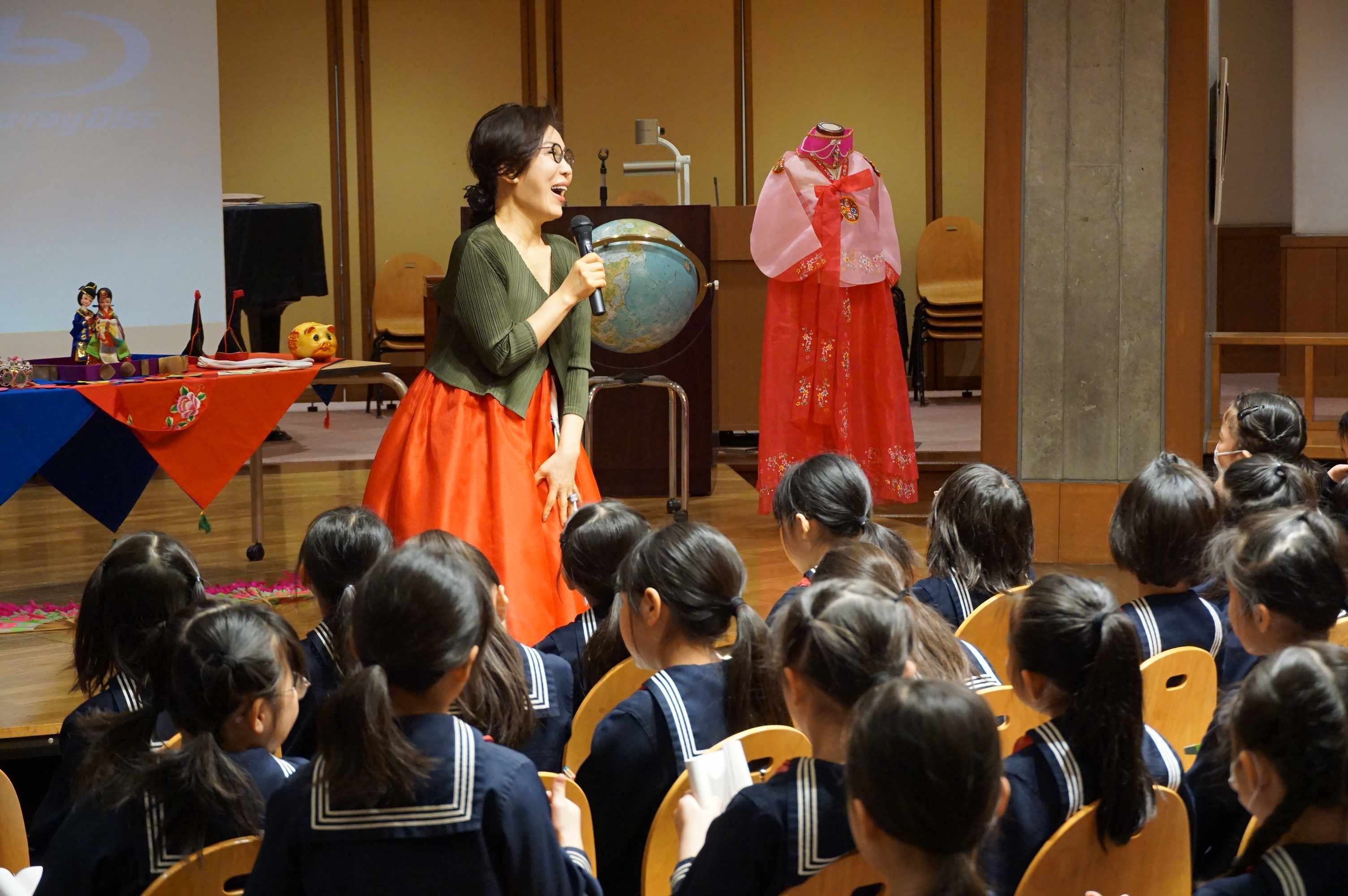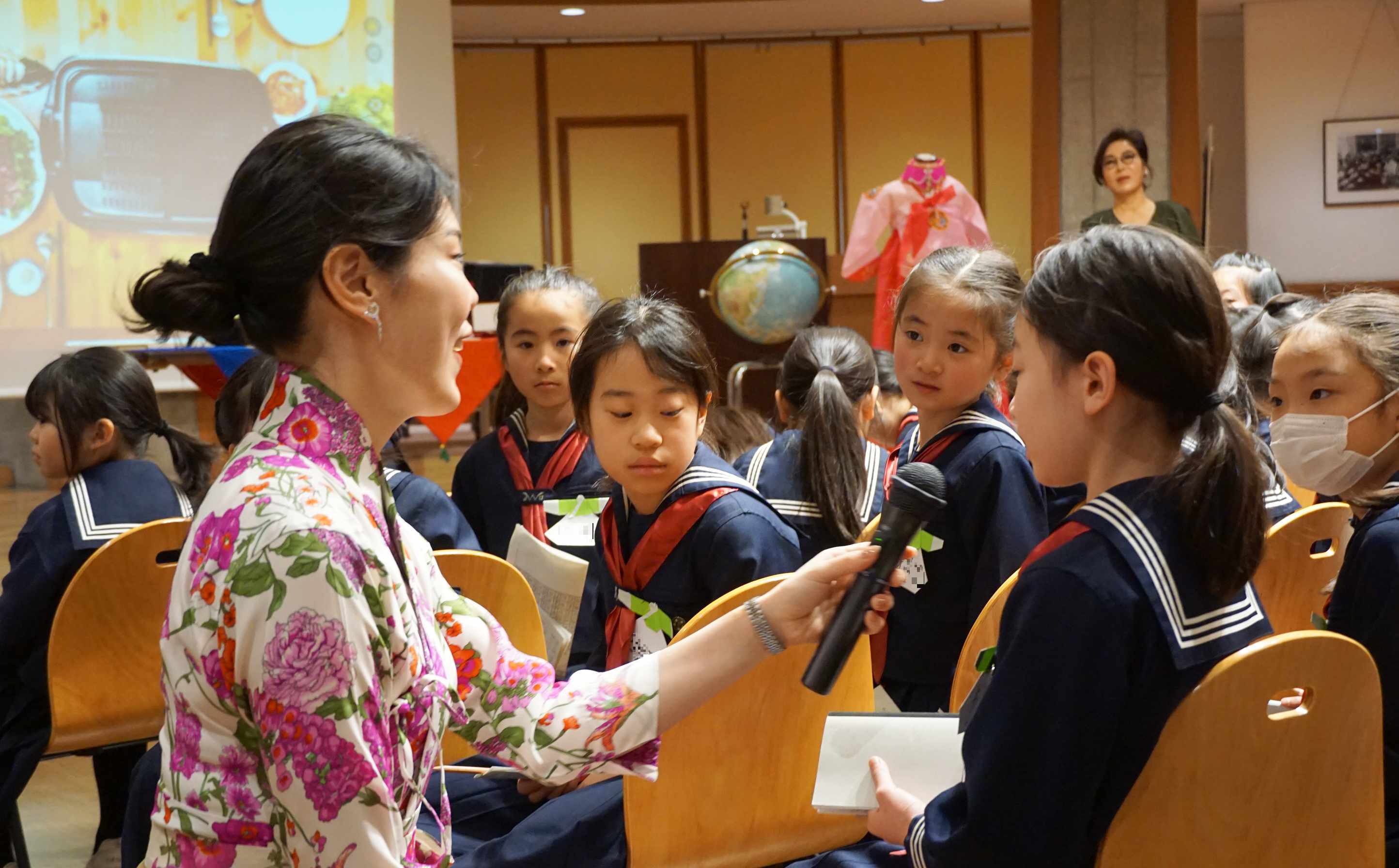 続いて子どもたちの質問に答えながら、韓国の伝統的な服装やそれを活かした現代の服についてのお話、おいしい食べ物やご近所さんが集まって行うキムチ作りのお話、韓国人と日本人の感情表現の違い、韓国語と日本語の似ている点などなど、多岐にわたるお話をうかがいました。