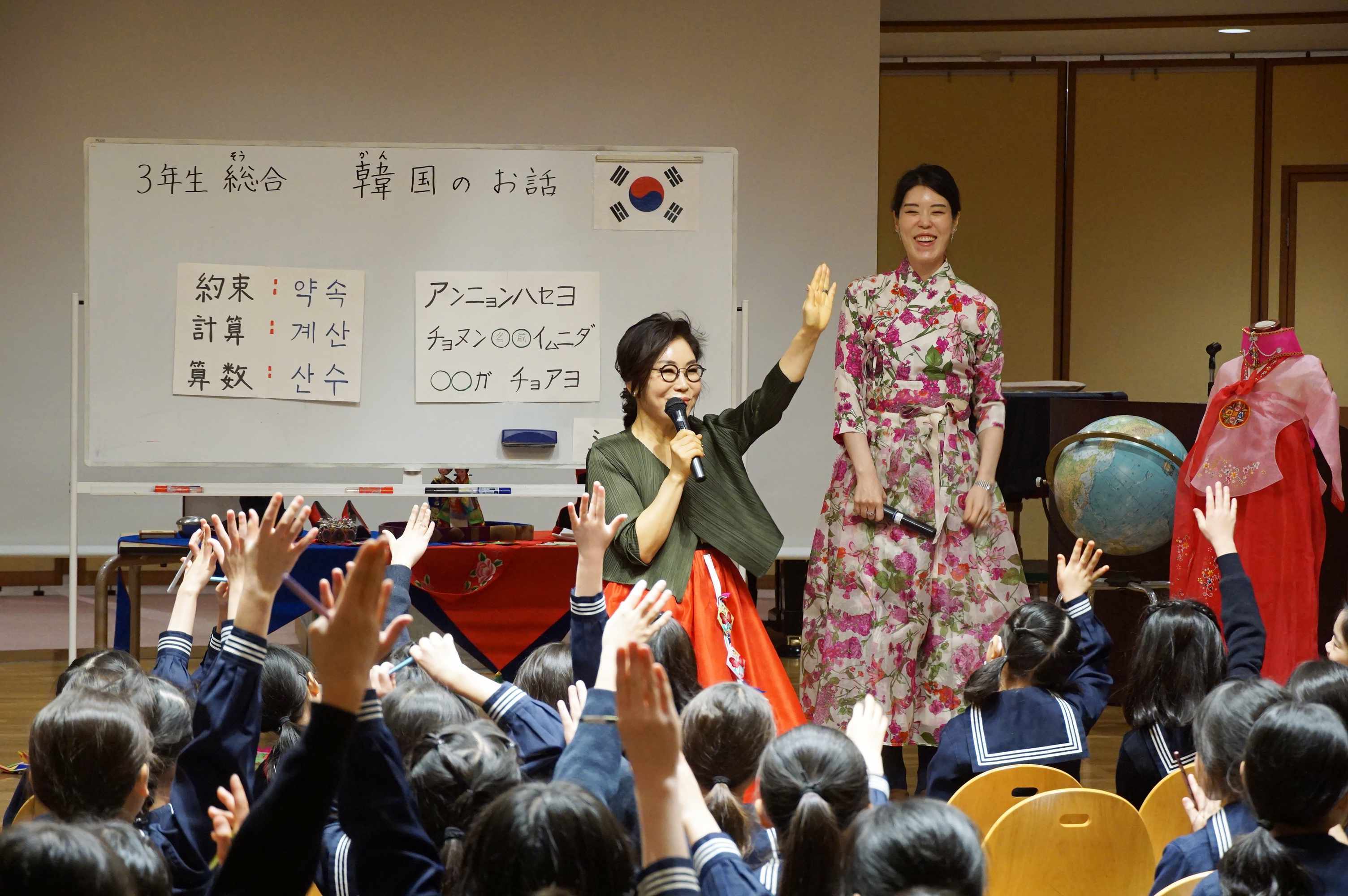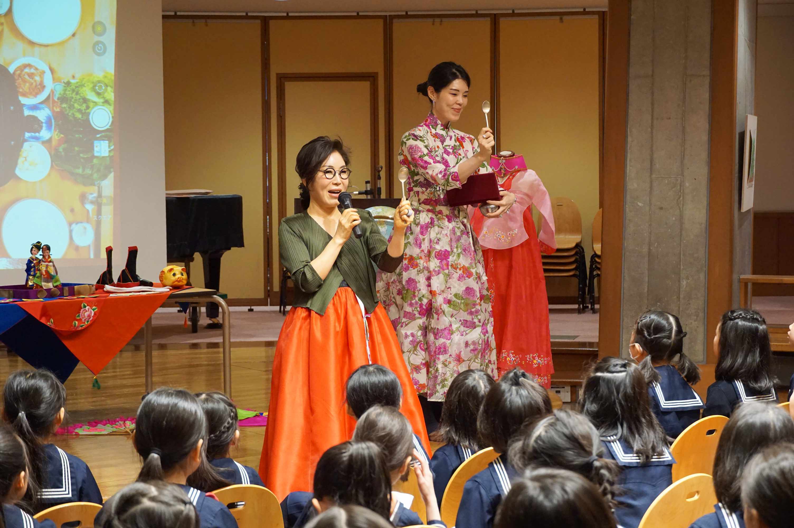 子どもたちからは、「韓国の人はどうしてそんなにお肌がきれいなのですか?」「子どもも辛いキムチを食べるのですか?」「韓国の小学生はどんな服を着ているのですか?」など、質問がたくさん出てきました。