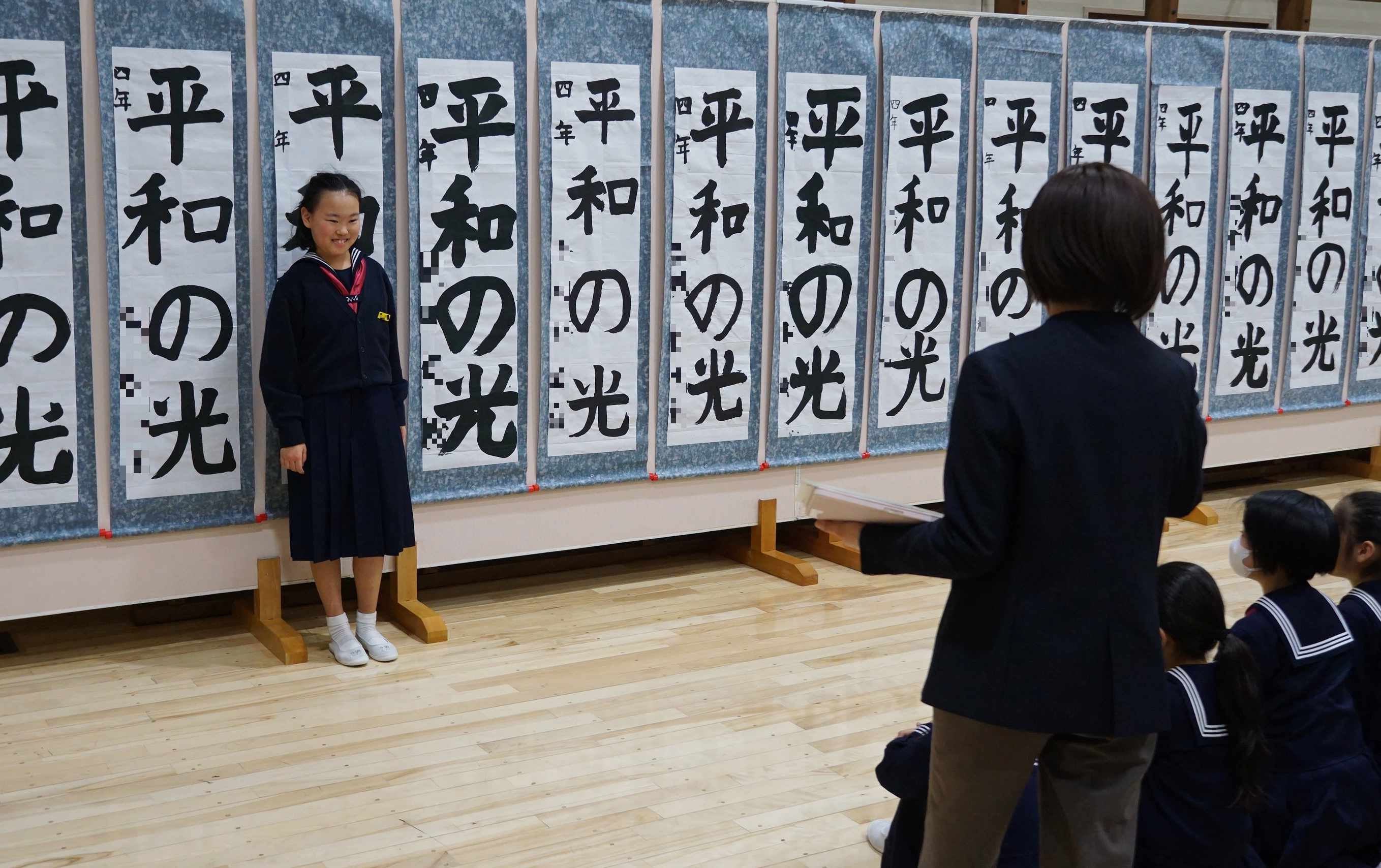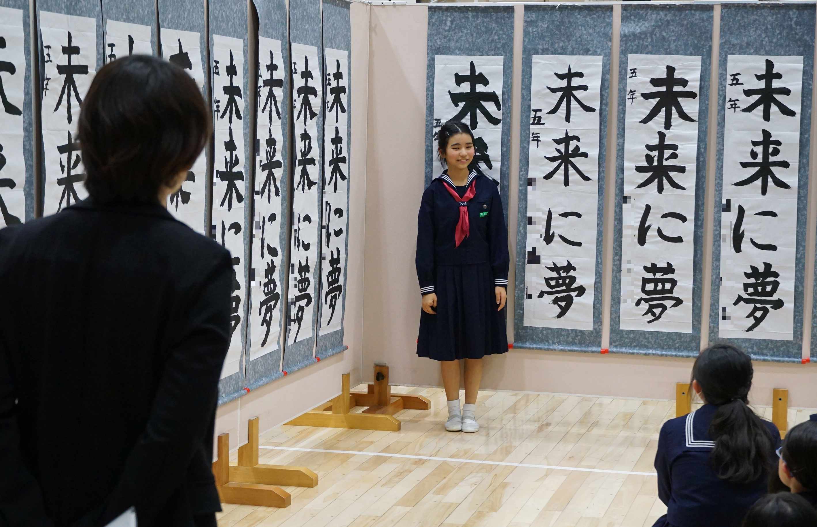 子どもたちは1人ずつ自分の作品の脇に立って、習字担当の先生から講評の言葉をいただきます。