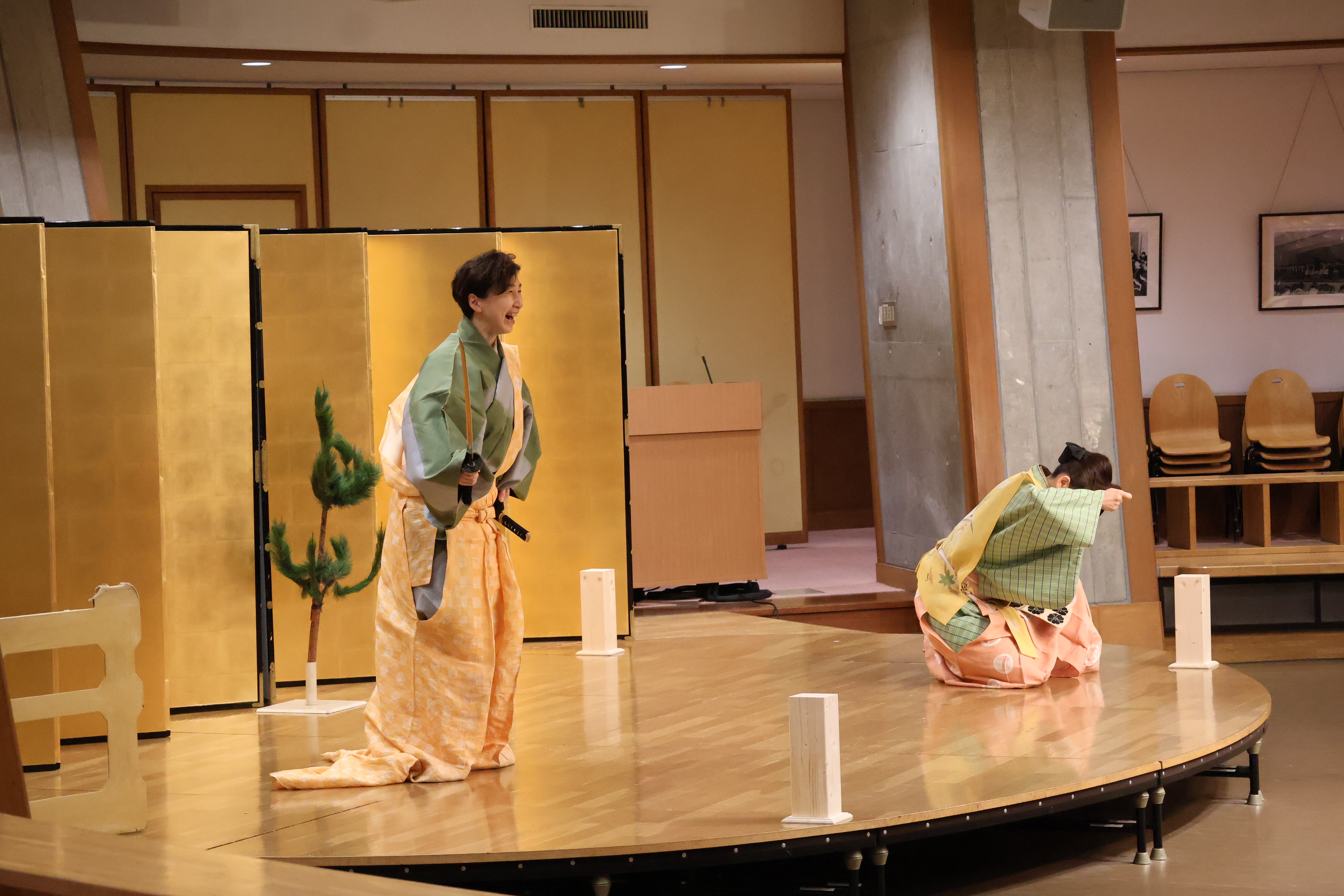 古語で演じられる伝統の舞台ですが、滑稽なやりとりが繰り広げられるたびに会場には自然と笑いが広がります。初めて狂言に触れる児童も多い中、一人ひとりが物語の世界に引き込まれ、楽しみながら鑑賞していました。
