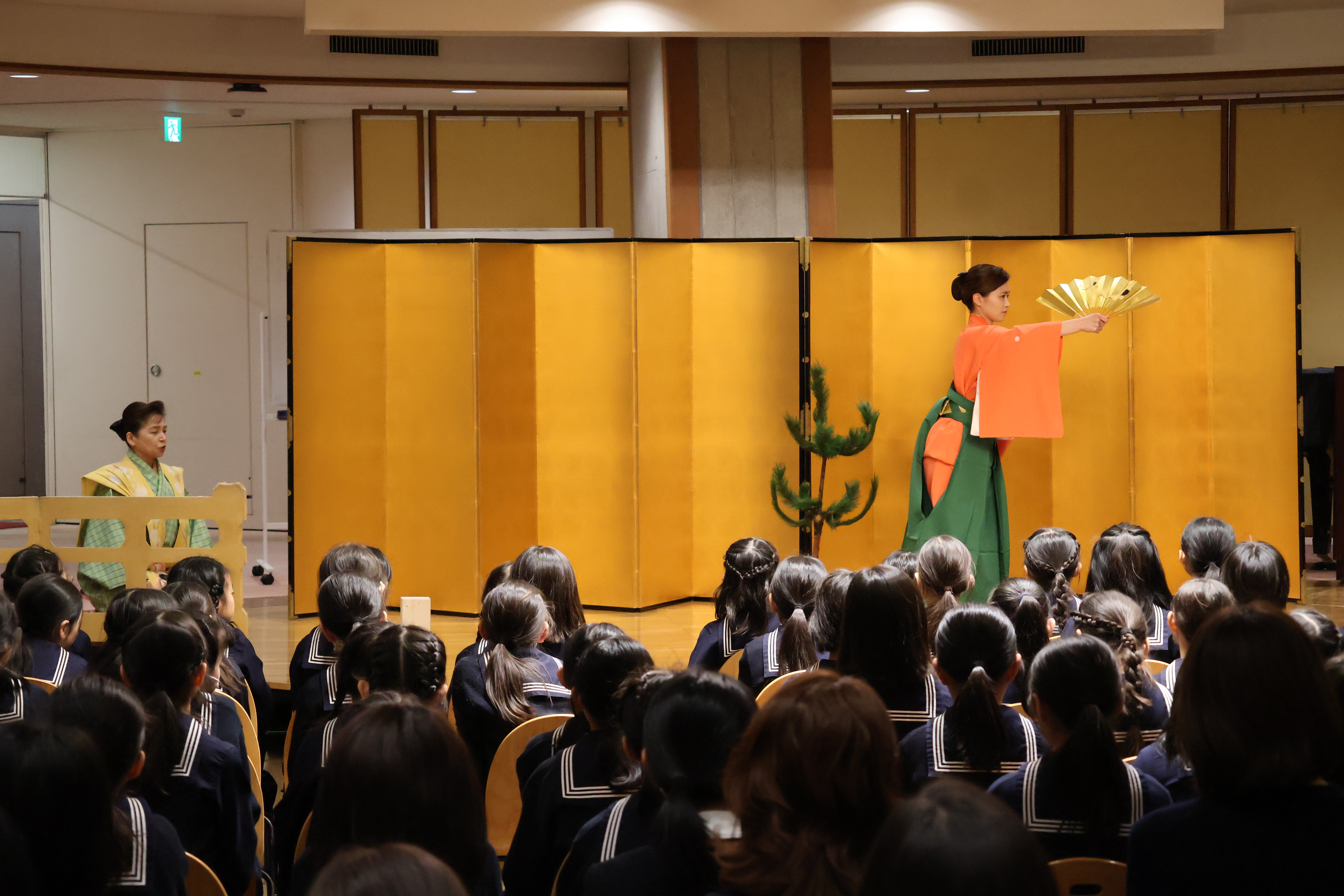 この日は、女性狂言師の和泉淳子さん、三宅藤九郎さん、和泉慶子さんをお招きし、狂言についてお話をうかがいました。和泉淳子さんと和泉慶子さんは本校の卒業生です。