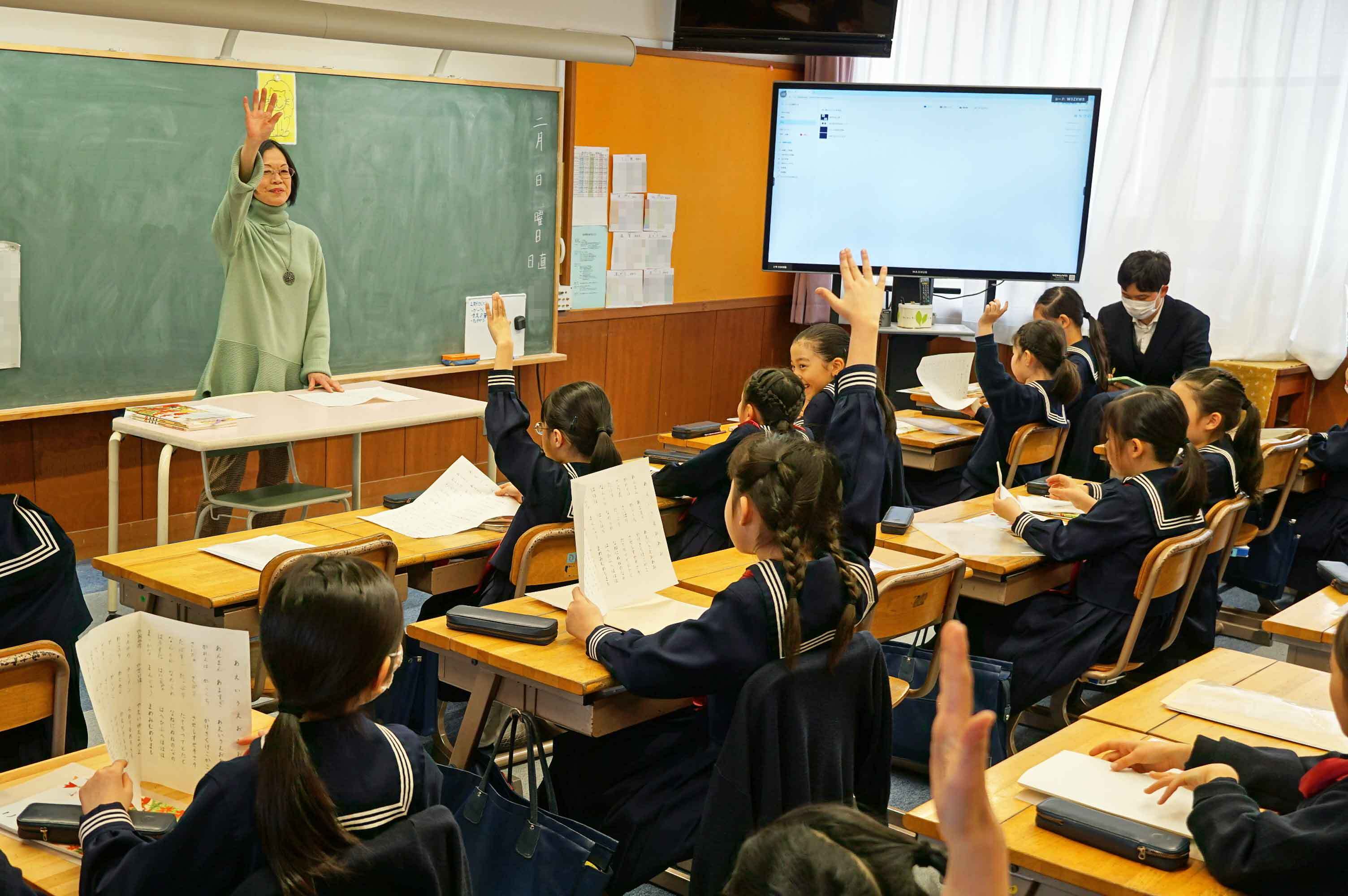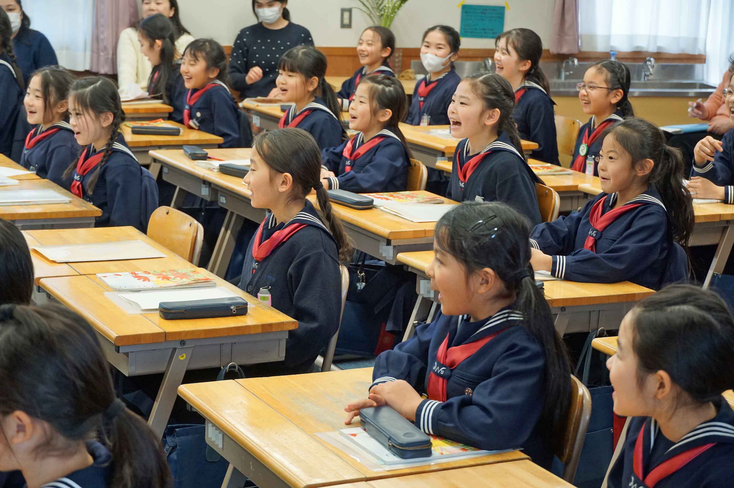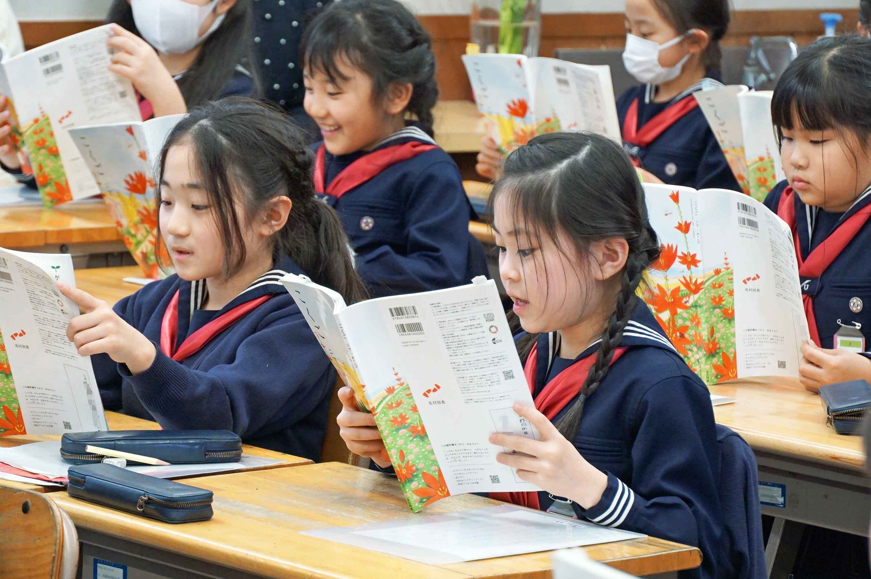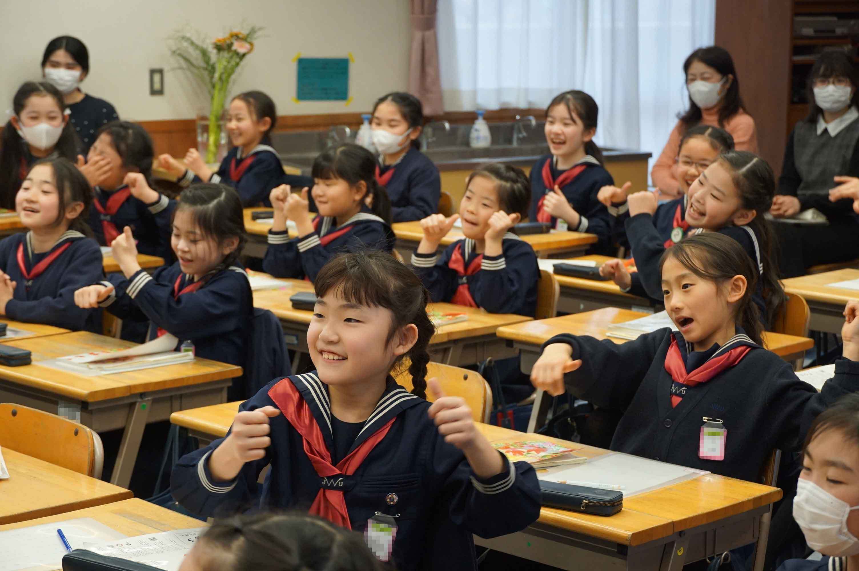 最後は読み聞かせです。先生が『よかったね ネッドくん』(レミー・シャーリップ作、やぎたよしこ訳)を朗読すると、子どもたちは主人公の「よかった!」と「困った!」に合わせて全身で感情を表現します。参観の先生方も一緒に体を動かして、教室が一つになって盛り上がりました。