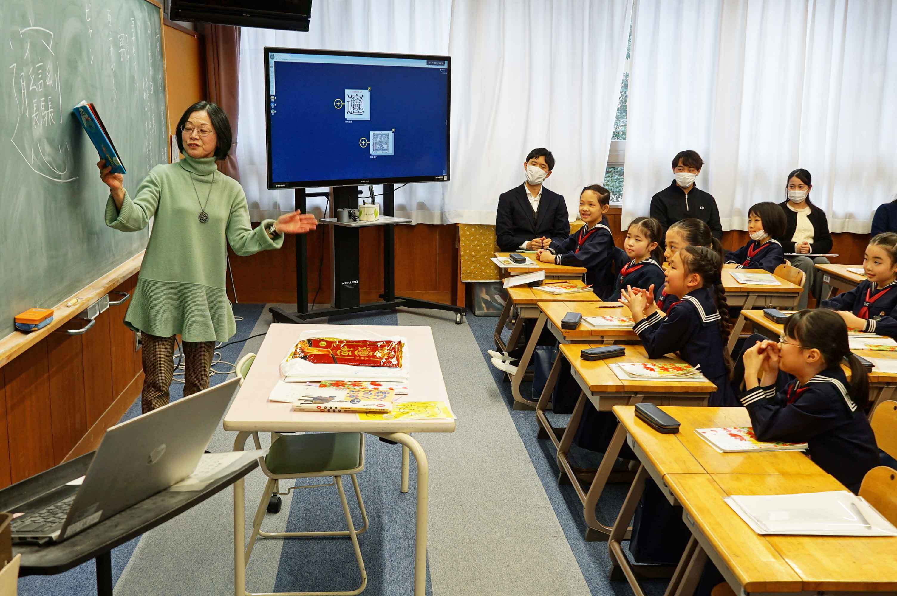 その次は漢字の勉強。とんでもなく複雑な形の漢字が電子黒板に映し出されました。その画数は何と58画! それを「漢字は足し算」を合言葉に、分解していきます。どんな漢字も知っている要素に分けて考えられることを理解している子どもたちは、あっという間に構成をつかんでしまいました。