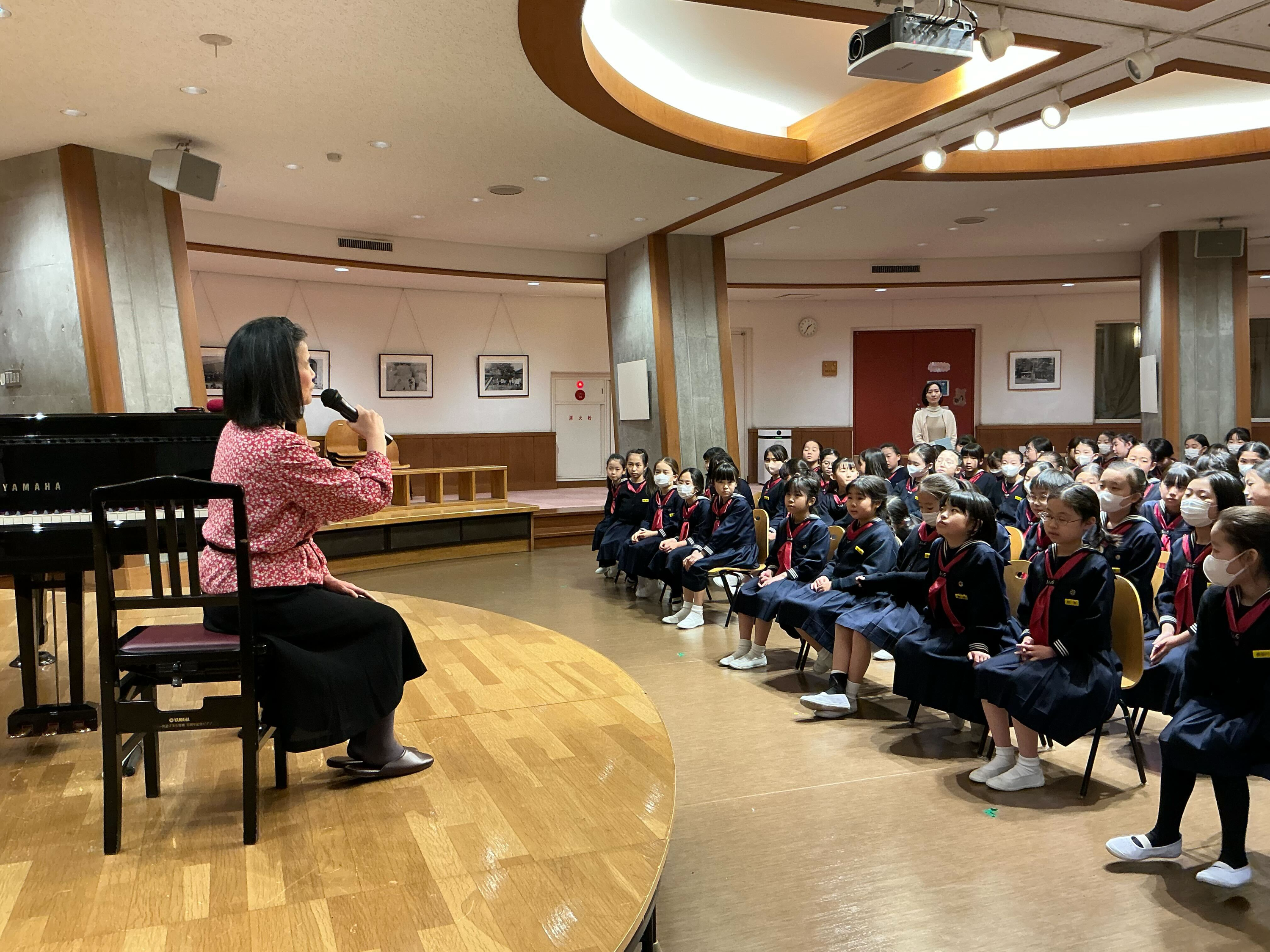 4年生は、道徳授業の一環で日本女子大学人事課の足利様をお招きし、ピアノ演奏とお話をしていただきました。