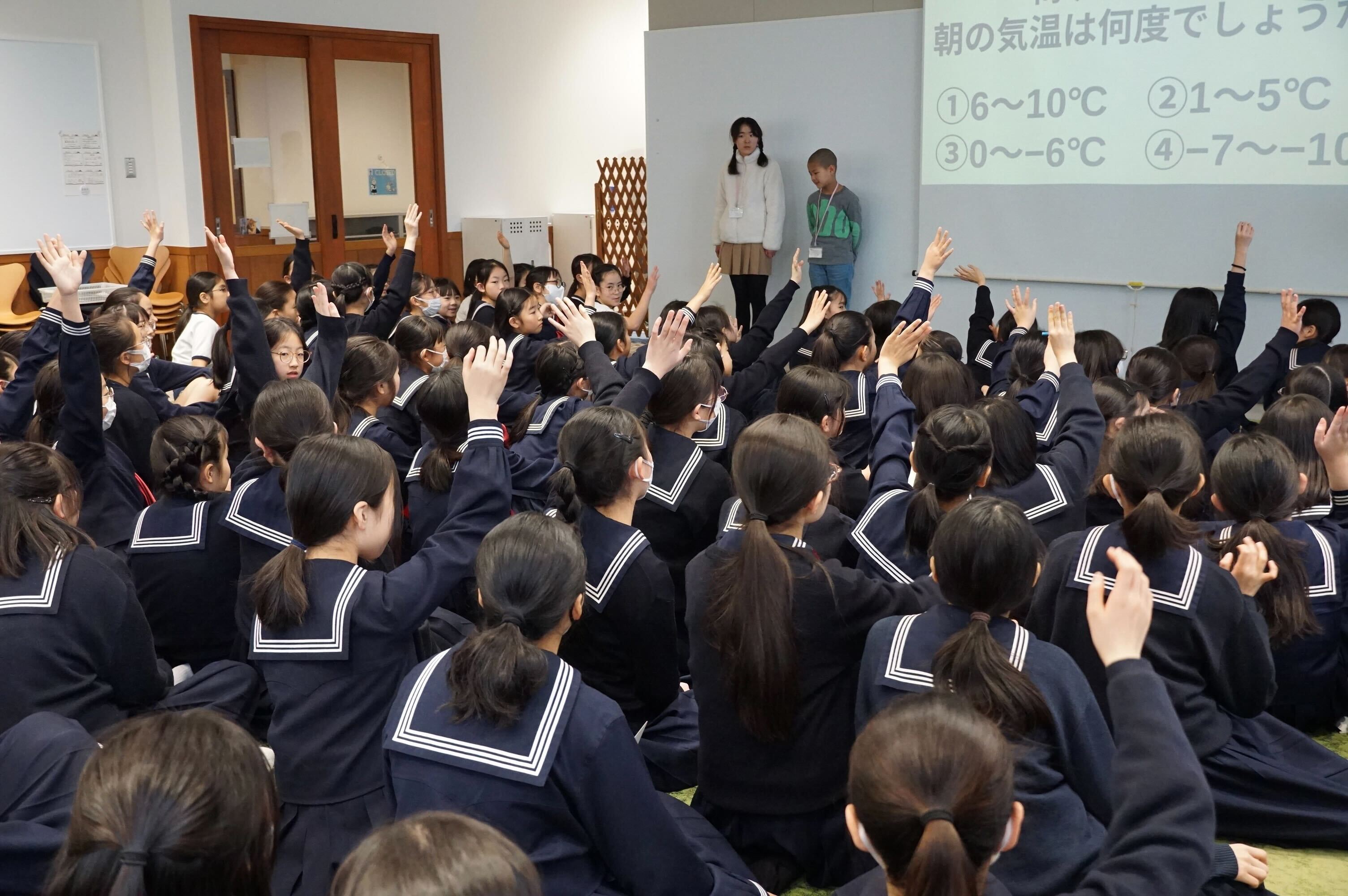 はじめに、梅ケ島の児童の皆さんが自己紹介とスライドを使った学校紹介をしてくださいました。梅ケ島小中学校の歴史や自然環境などをクイズを交えながら教えてくださいました。124年の歴史がある学校であること、運動会には児童生徒だけではなく保護者や地域の方々も参加すること、また学校にはカモシカやサルがやってくることもあるなどを聞いて、豊明の子ども達は驚きの声を上げていました。