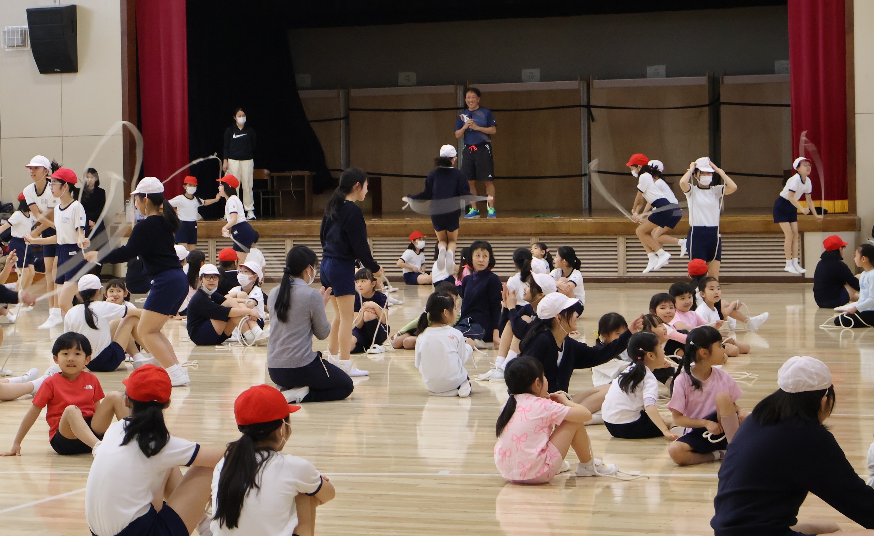 講堂に入ってきた年長組の子どもたちは、広い空間や小学生の姿に少し緊張した様子も見られましたが、5年生が「いっしょにやってみよう」とやさしく声をかけながら、縄の持ち方や跳び方を丁寧に教えていきました。