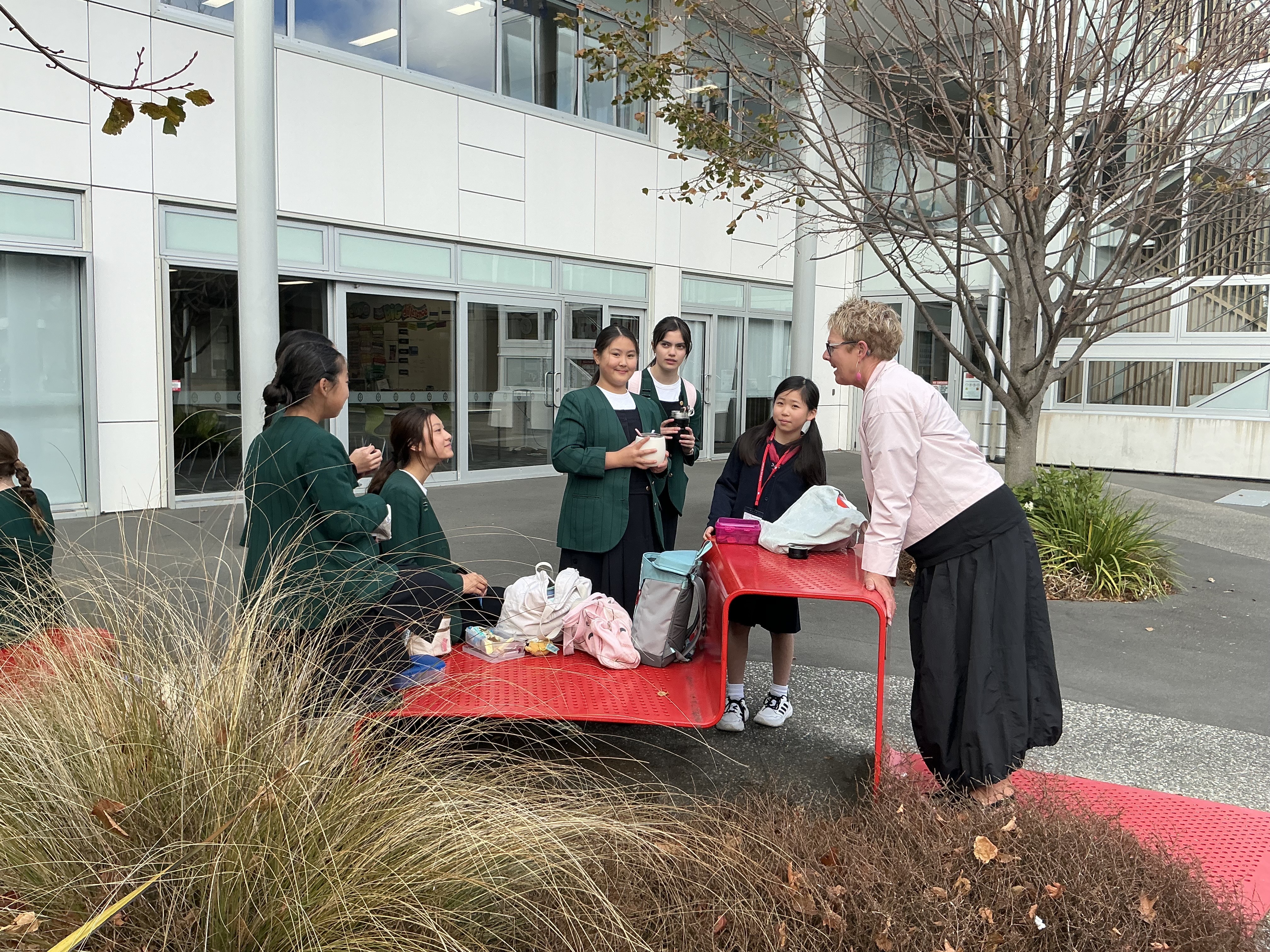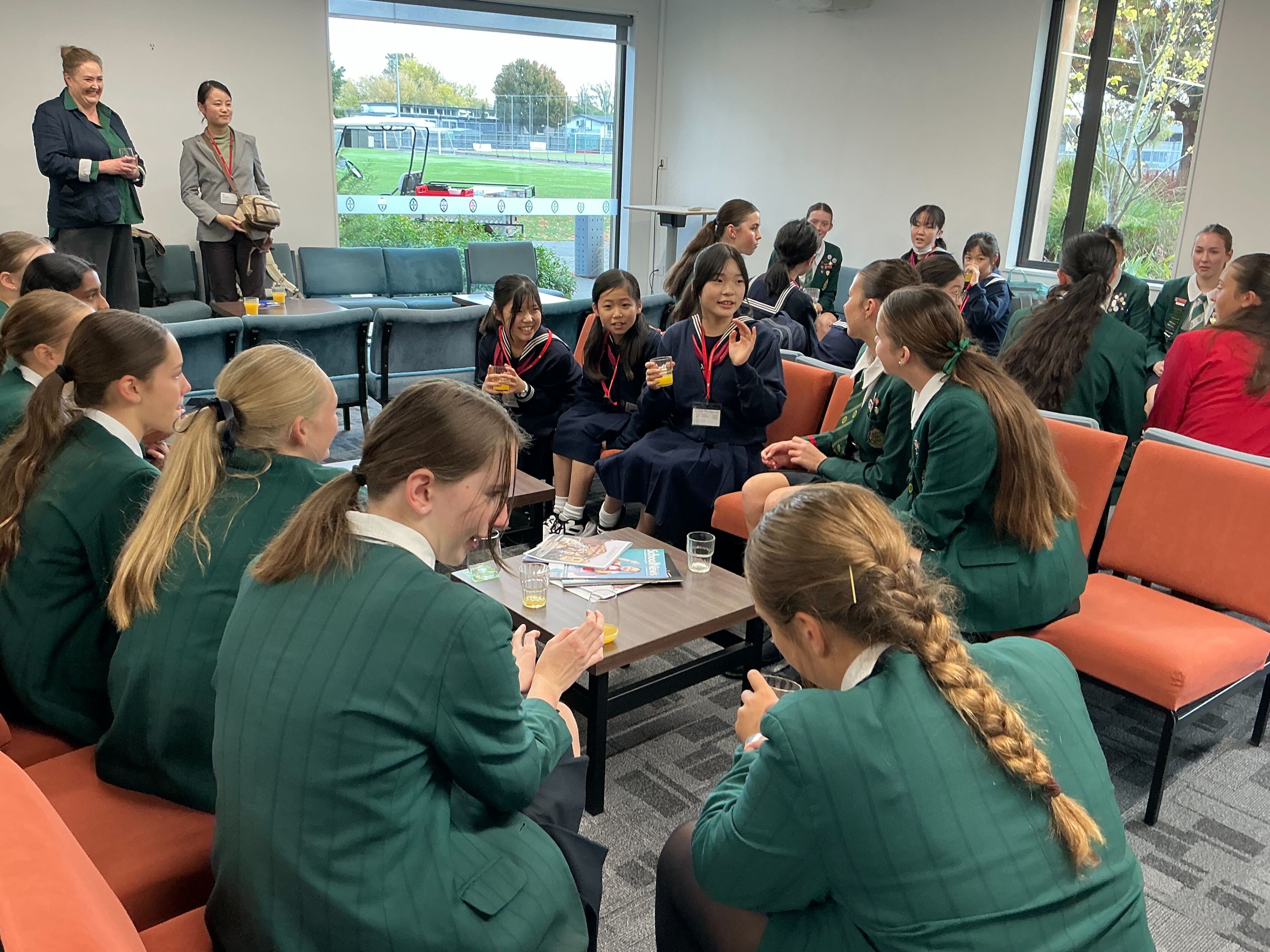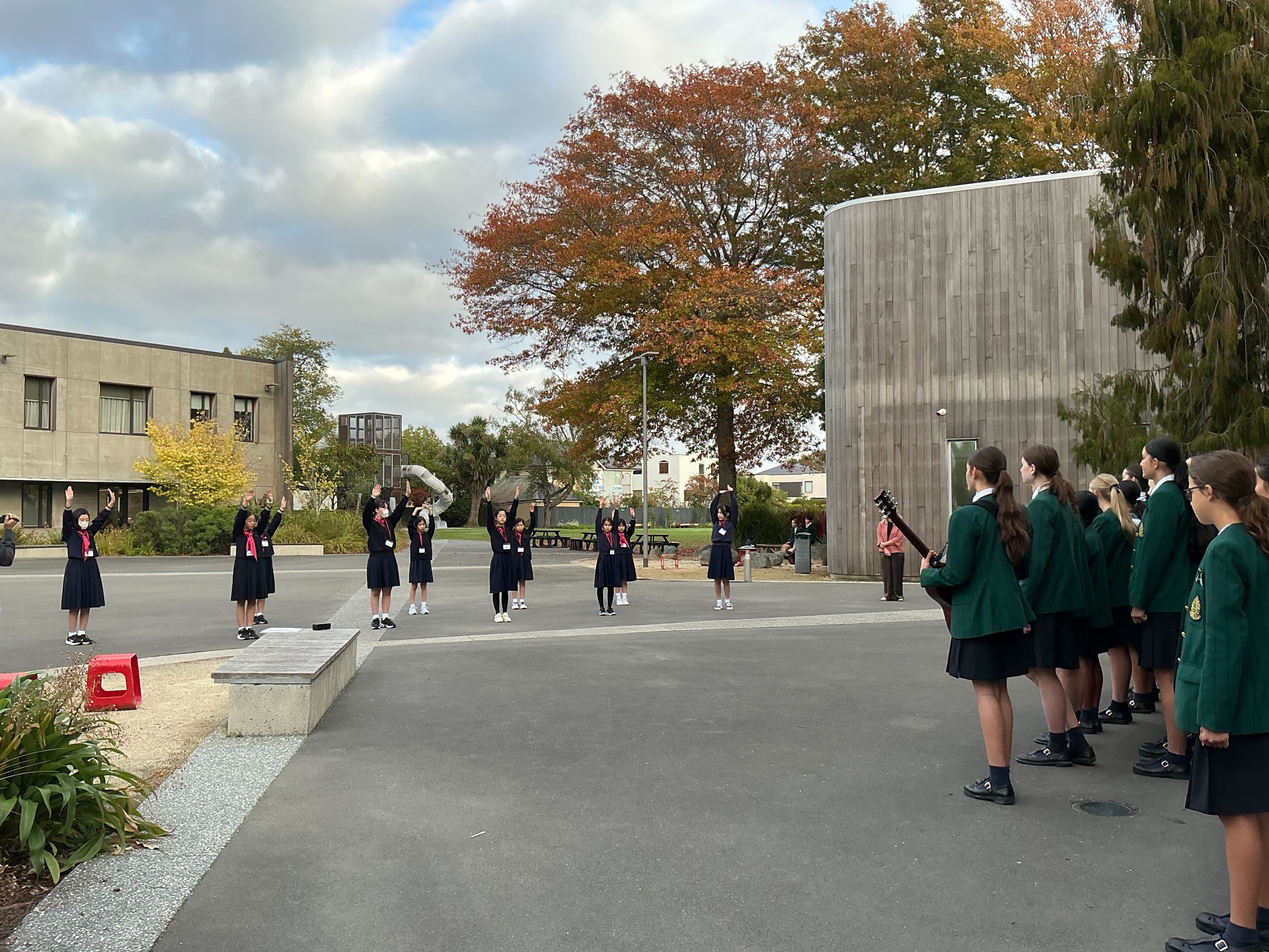 まずはウエルカムセレモニー。マオリの挨拶「the Mihimihi」で迎えてくださいました。披露したラジオ体操は大変好評で、その後の懇談でも「私たちに教えて!」と生徒たちに人気でした。