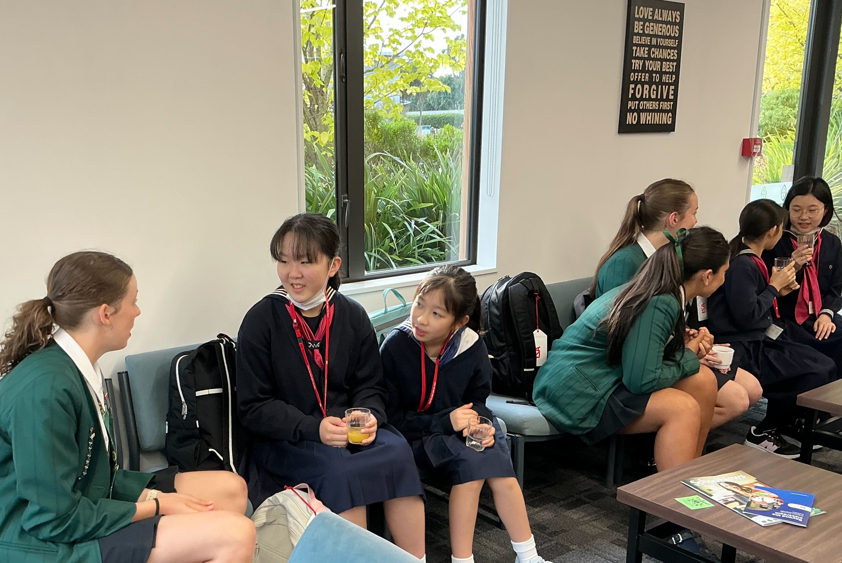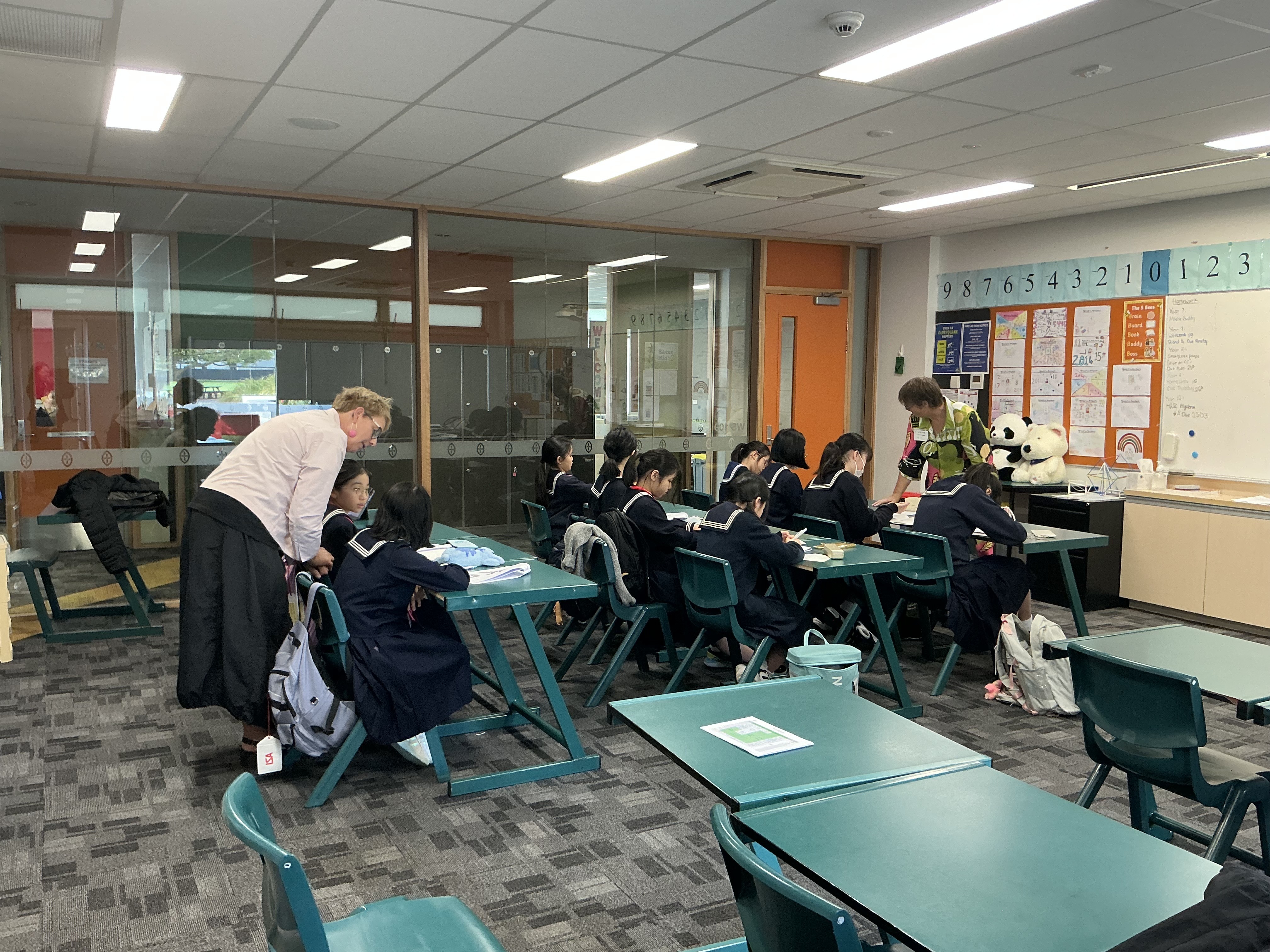 その後は、St Margaret校のバディと校内のいろいろな場所でモーニングティータイムの時間を過ごしました。バディの友達がいつの間にか集まってきて、大勢の中に豊明の児童が一人、という状況でしたが、たくさんの人に囲まれながらもコミュニケーションを取ろうと頑張っていました。