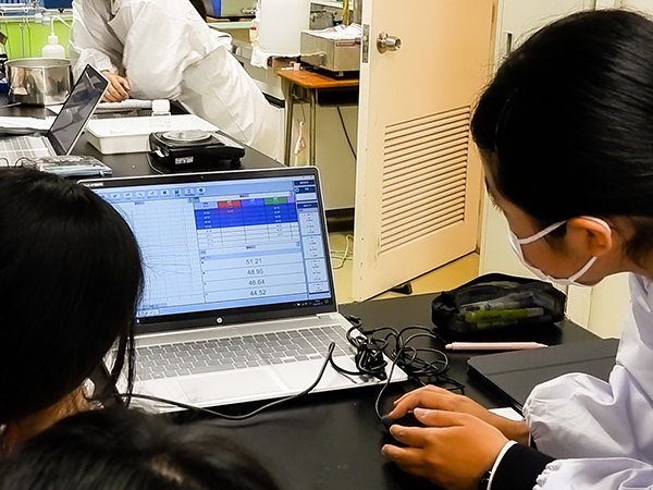 必修科目として学習指導要領に定められた内容を学習するだけでなく、「教科横断型集中授業」として、データサイエンスへの理解を深め様々な場面で実際に活用する能力を獲得できるよう、国語、数学、理科、社会、英語、家庭科などの教科と連携した授業を行っています。例えば、理科ではセンサー、データロガーを用いた実験などを、家庭科ではデータベースを利用した栄養価計算などで学んだ知識を実践的に活用しています。