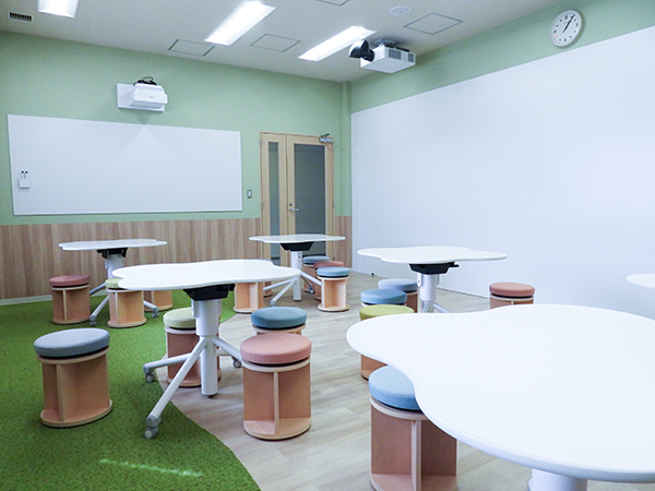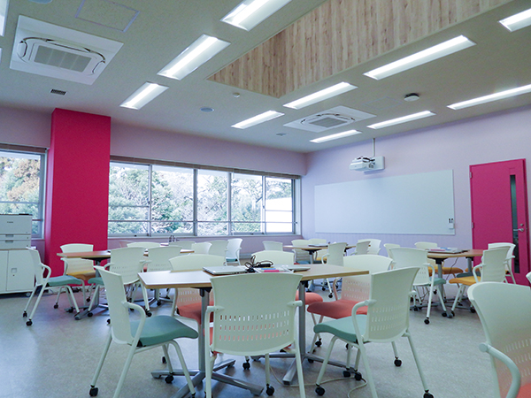 - 中学校・高等学校合わせて4つの演習室を完備。壁一面に投影できるプロジェクターとホワイトボード、アクティブラーニング対応の可搬式デスク・チェア、最先端のノートPCなどを備え、普段の授業や特別講座、自治活動、課外活動などに使用しています。