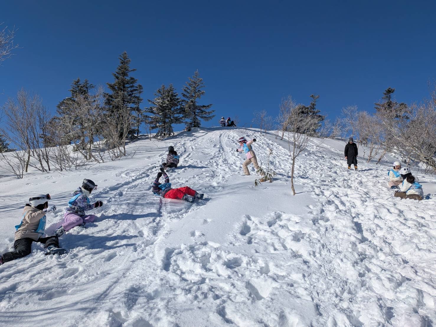 いざ生徒たちや一緒に引率で行ったレジェンドの先生方と雪山へ入りました。多少の恐怖心もありましたが、「いけそう、できそう、できた!」の感覚ではじめはコケながらも楽しむことができました。そしてお天気に恵まれた日は、朝から気持ちよく生徒も滑っており、山頂でしか見ることのできない景色に感動しました。