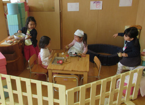 保育室や廊下で友だちや先生と自分の好きな遊びを楽しみます。