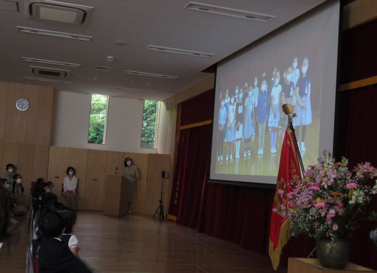 年長組は映像で式に参加し、豊明幼稚園の歌をお兄さんお姉さんが歌う様子をじっと見つめるまなざしはキラキラと輝いていました。