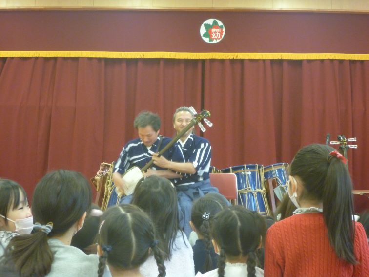 子どもたちは、三味線・和太鼓・チャッパ・篠笛の4つの楽器の力強い音色に、「心臓がドンドンする!」と圧倒されていました。