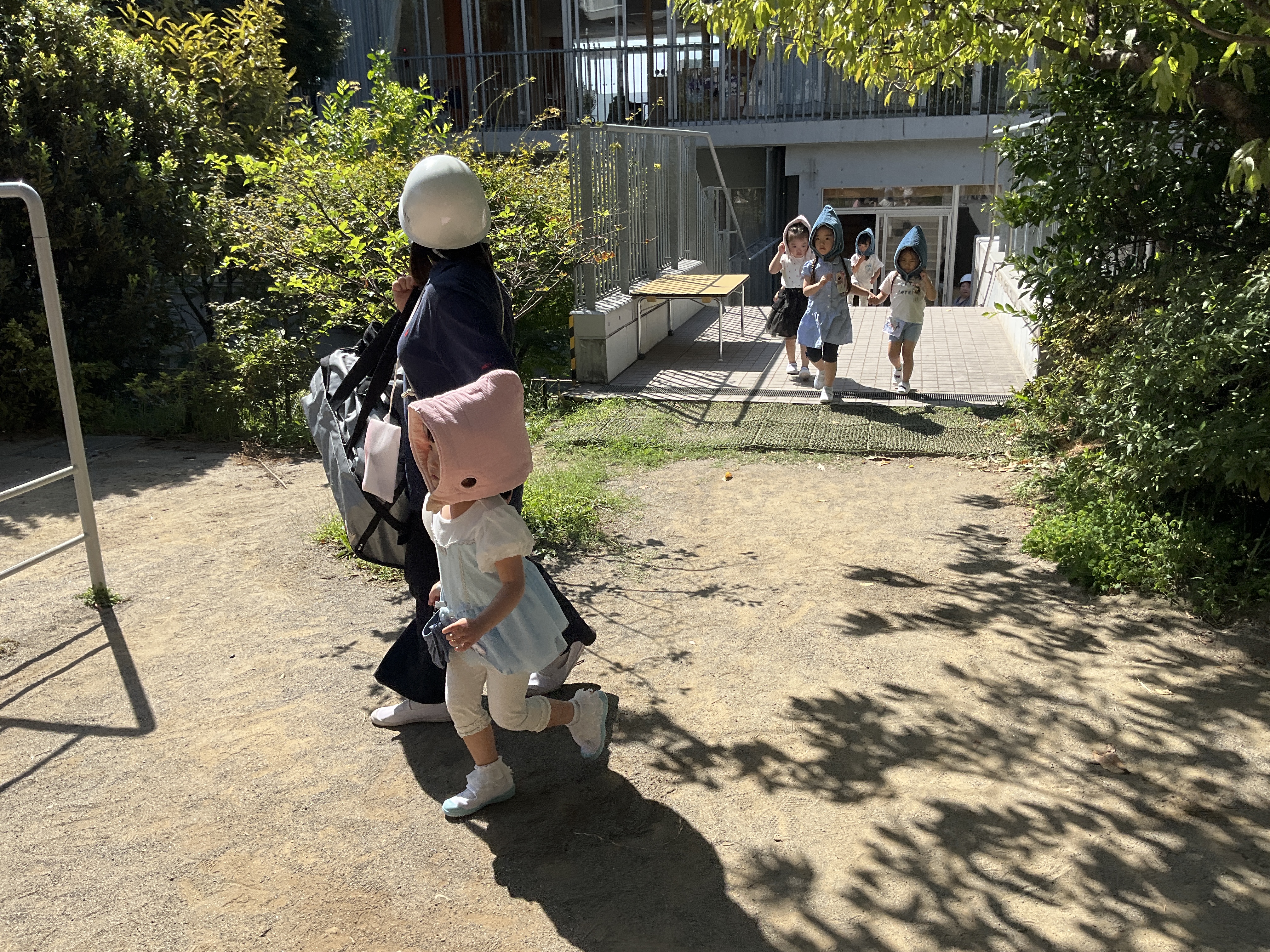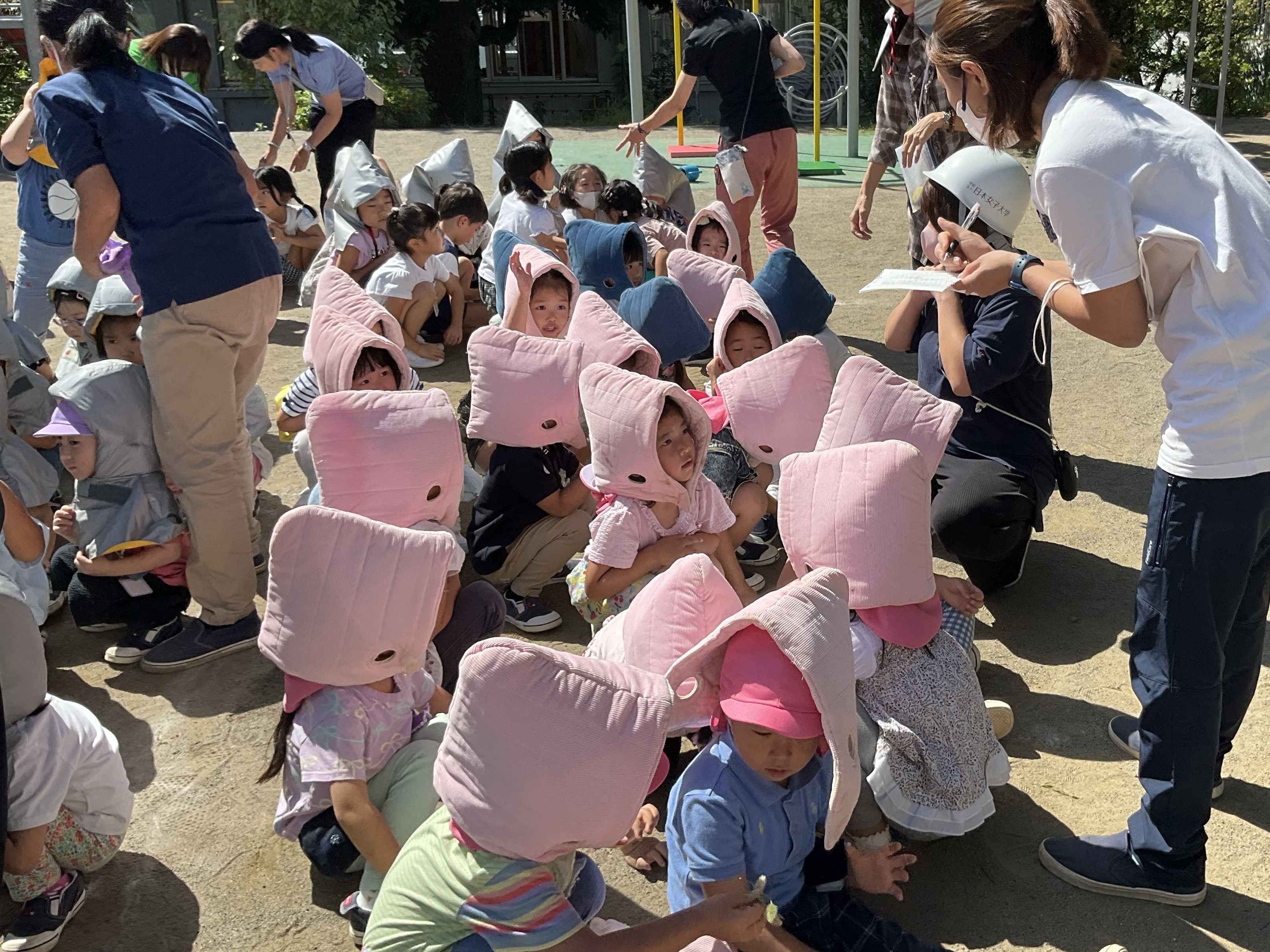 午前10時15分、地震発生の放送が流れると、子どもたちは指示に従い落ち着いて身を守る姿勢をとりました。園庭で遊んでいた子はその場で頭を手で覆いしゃがみ、室内にいた子どもたちは机の下で身を守るなど、それぞれの場所で適切に行動する様子が見られました。揺れが収まった後は、室内にいた子どもたちが防災頭巾をかぶって園庭へ避難。クラスごとに担任が点呼を行って安全を確認する中、みんな真剣に取り組む姿が印象的でした。