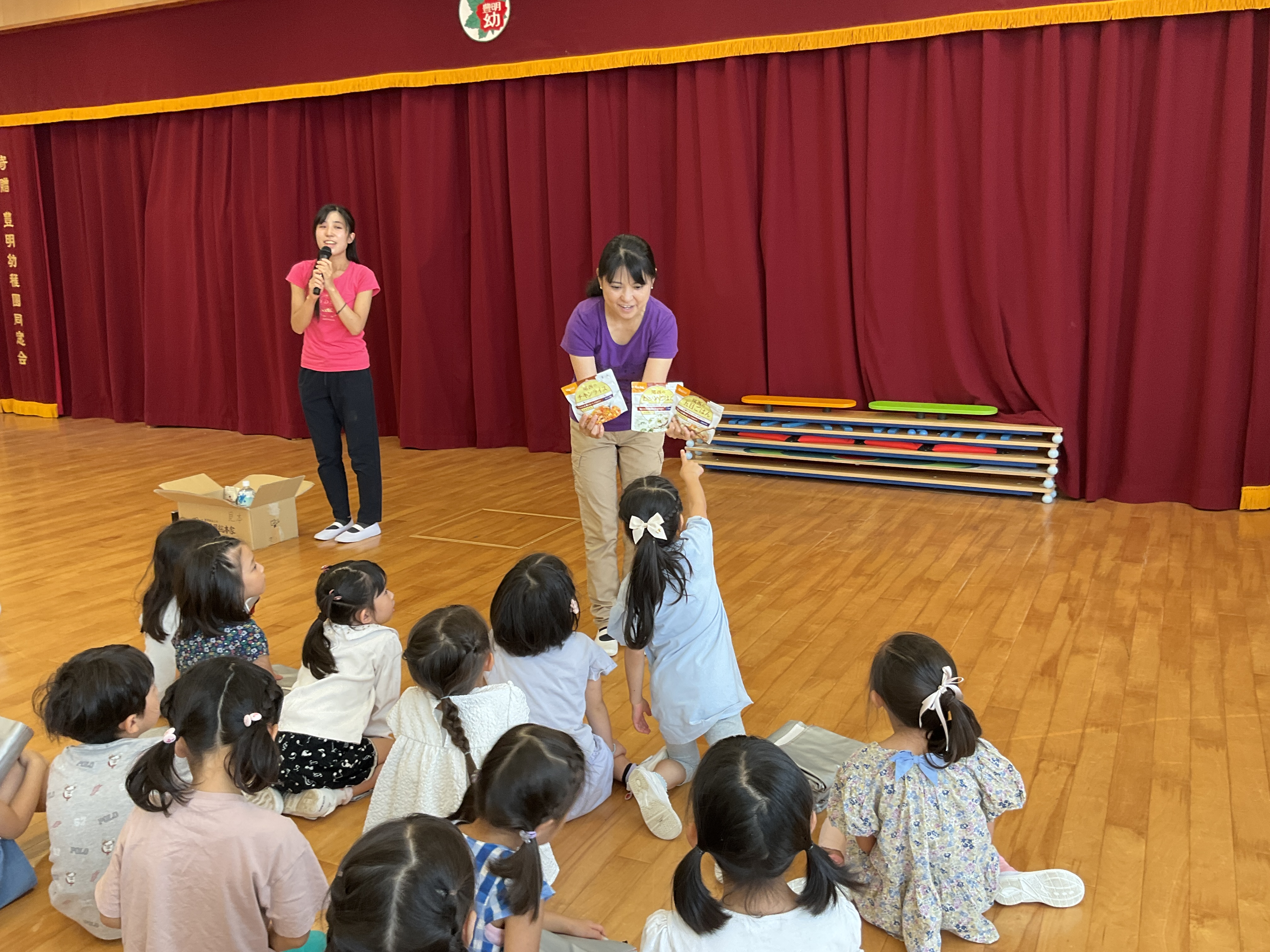 その後遊戯室に移動し、先生方から災害時に備えて準備されている非常食やお水の説明がありました。