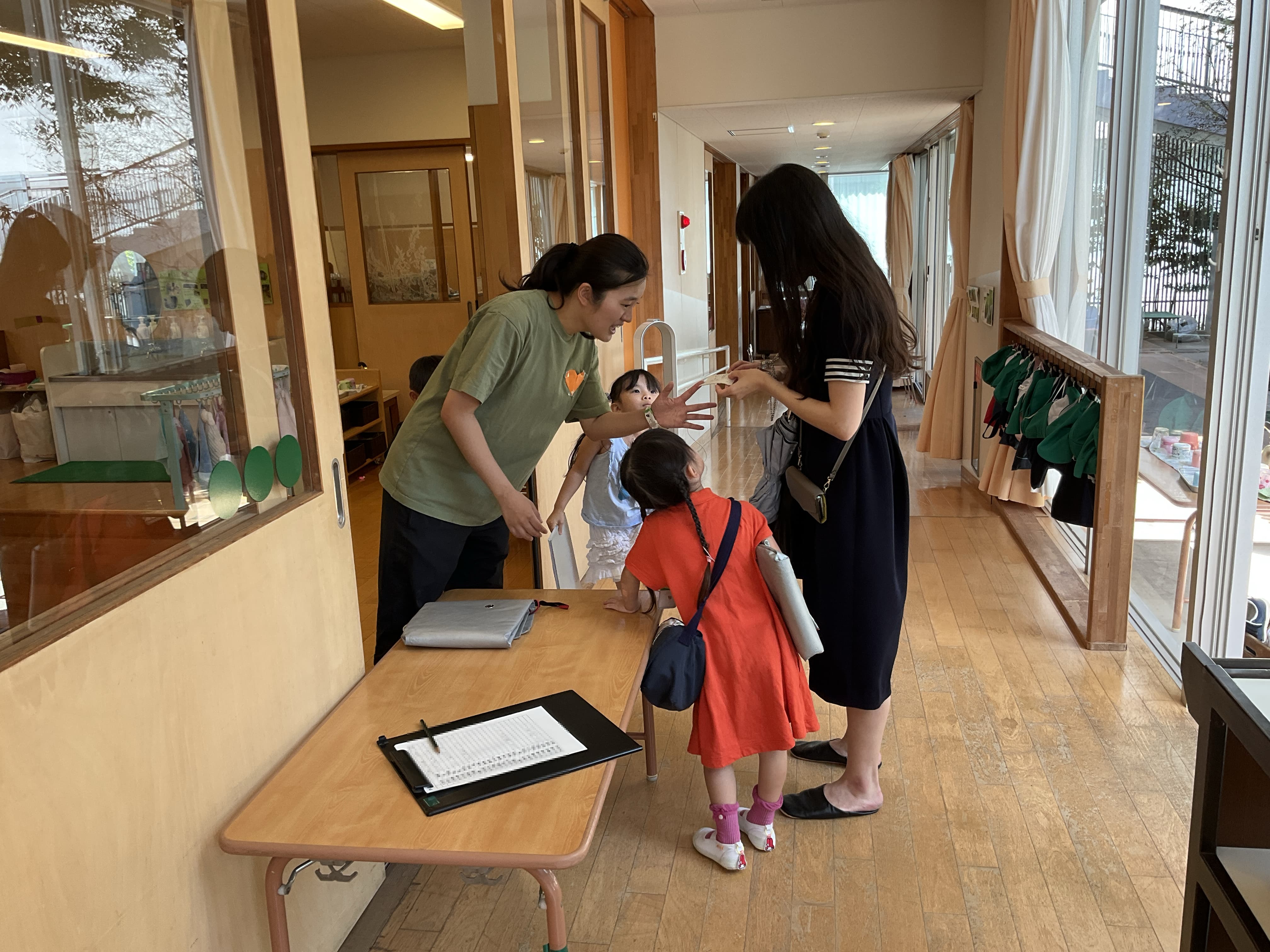 幼稚園から緊急の配信を受けとった保護者の方は、災害を想定した服装や持ち物でお迎えにいらっしゃいました。お迎えの場面では「引き渡しカード」を確認しながら、一人ひとりを確実に保護者に引き渡しました。