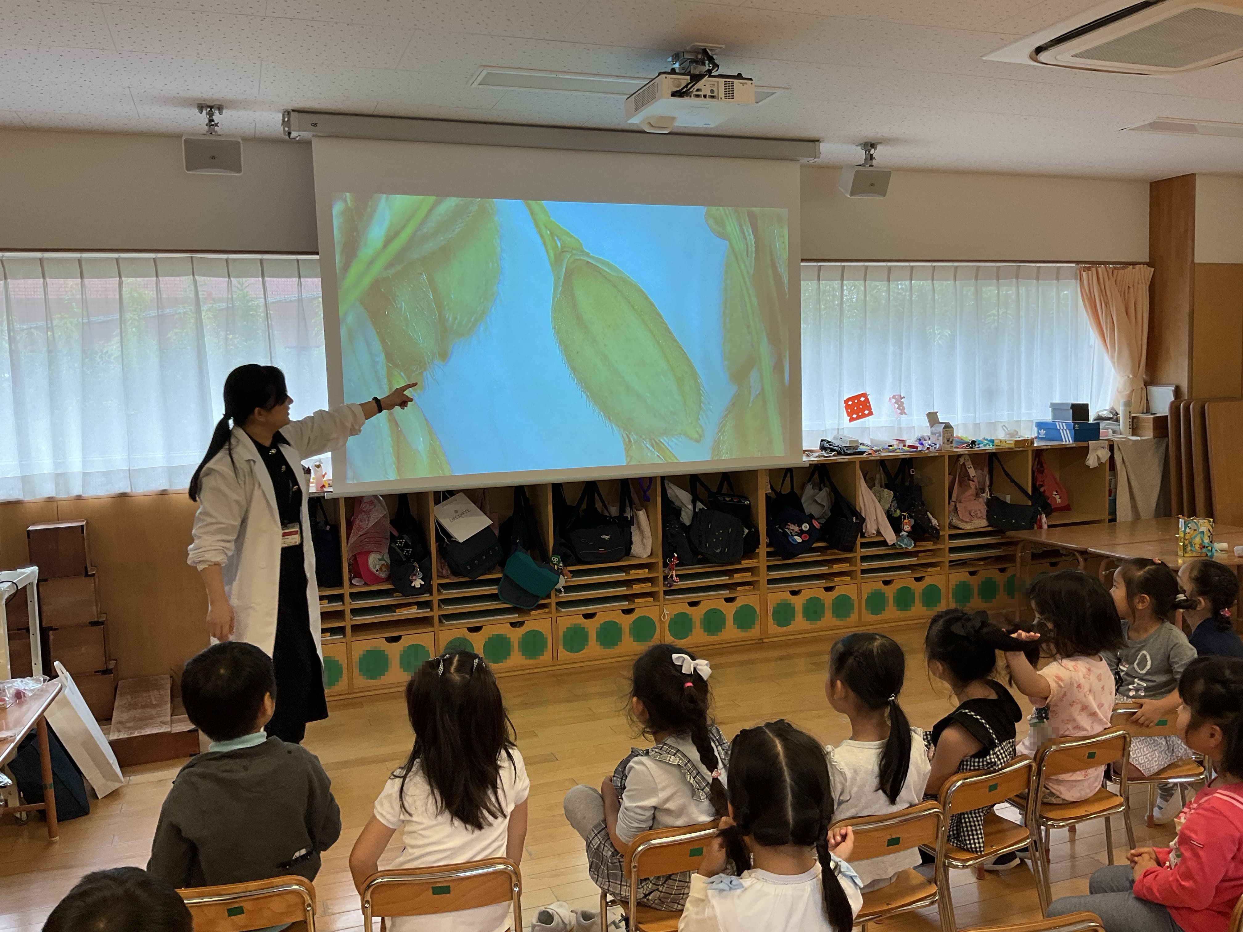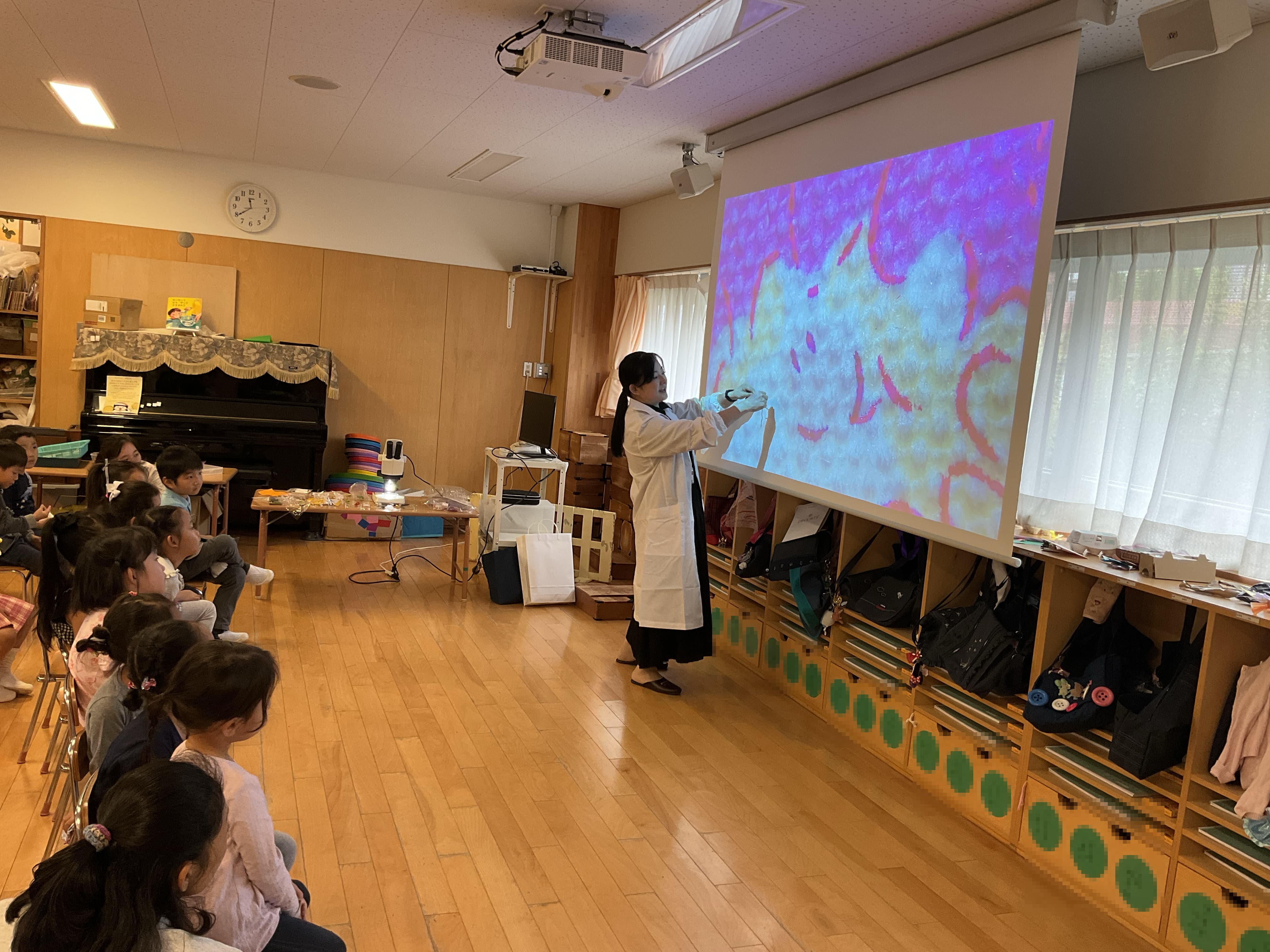日本女子大学理学部化学生命科学科/電子顕微鏡施設の髙木智子先生にお越しいただき、年中組の子どもたちが実体顕微鏡を使って身のまわりのさまざまなものを観察しました。
