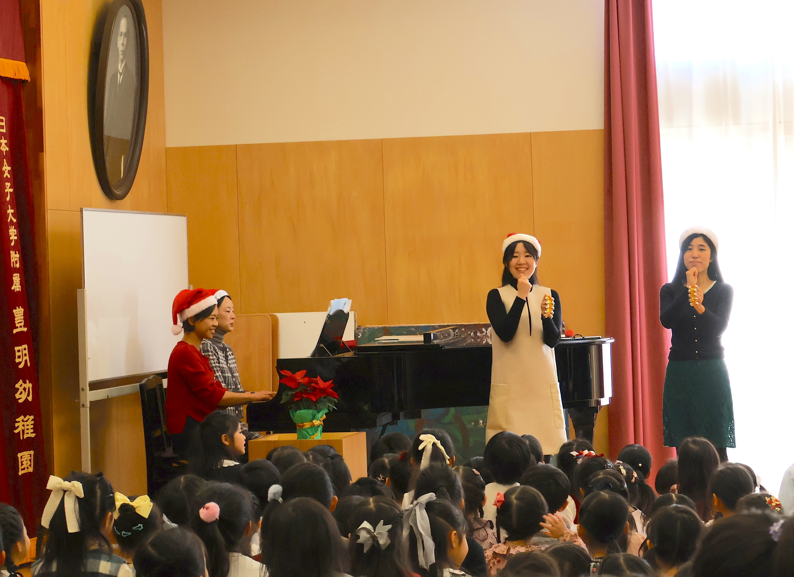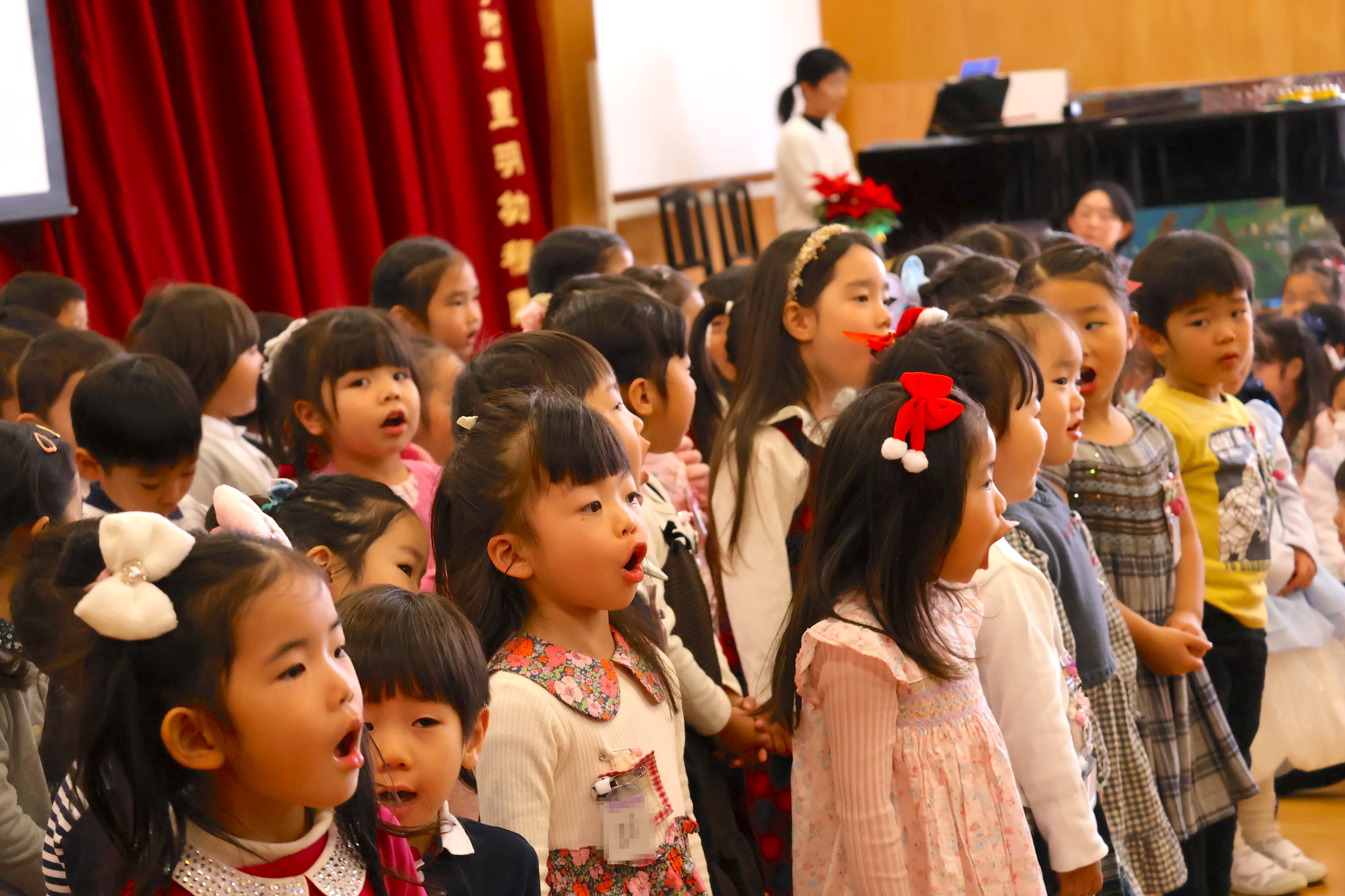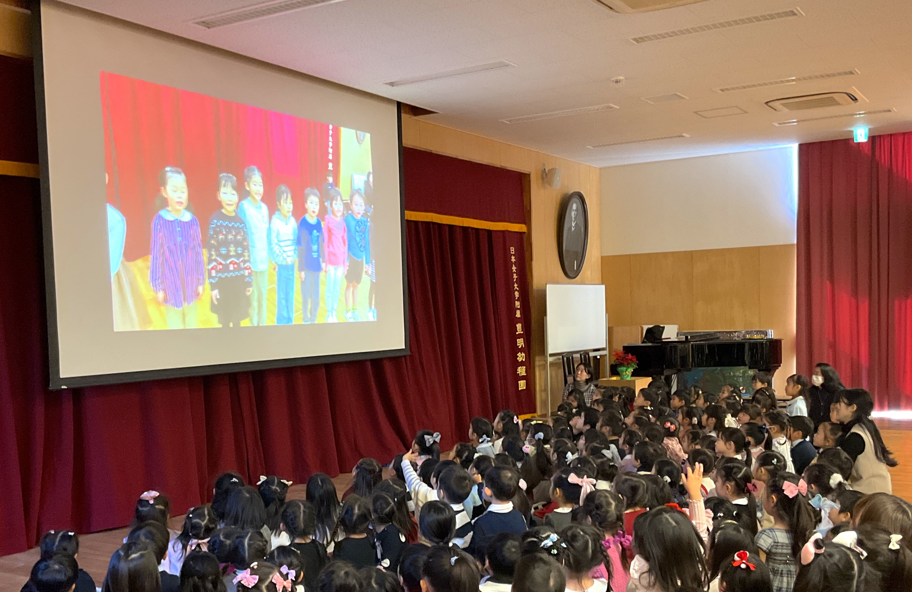 子どもたちは2学期の楽しかった遊びをみんなで振り返り、みんなで『豊明幼稚園のうた』や各学年ごとの歌を披露しました。みんな元気いっぱいで、それぞれの学年らしさが歌を通して生き生きと伝わってきました。
