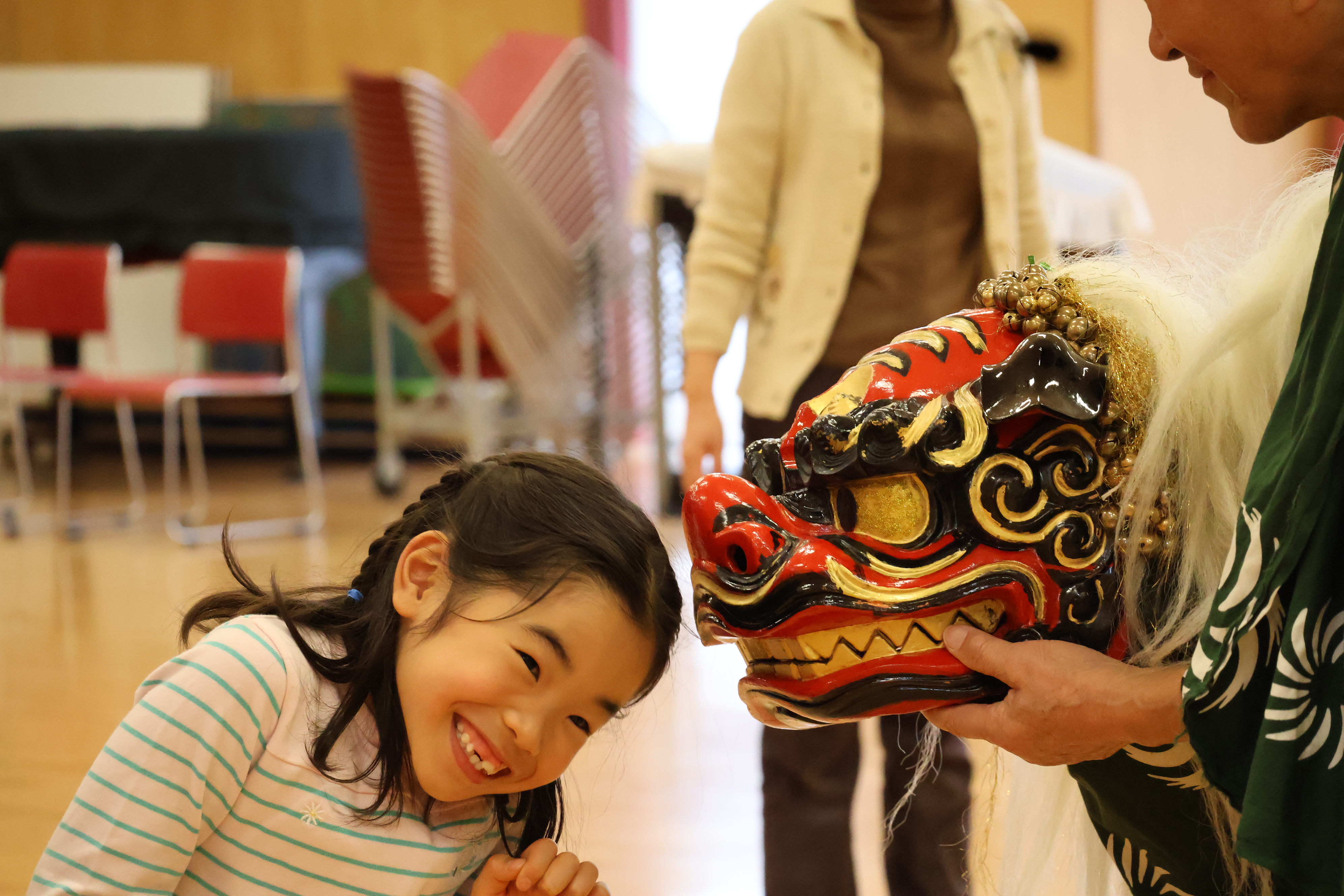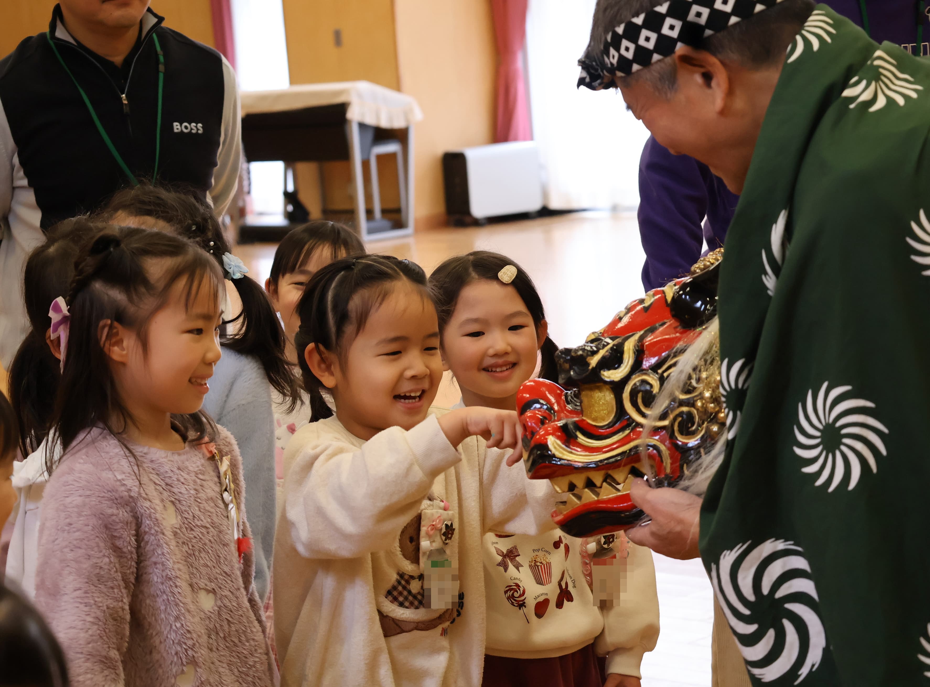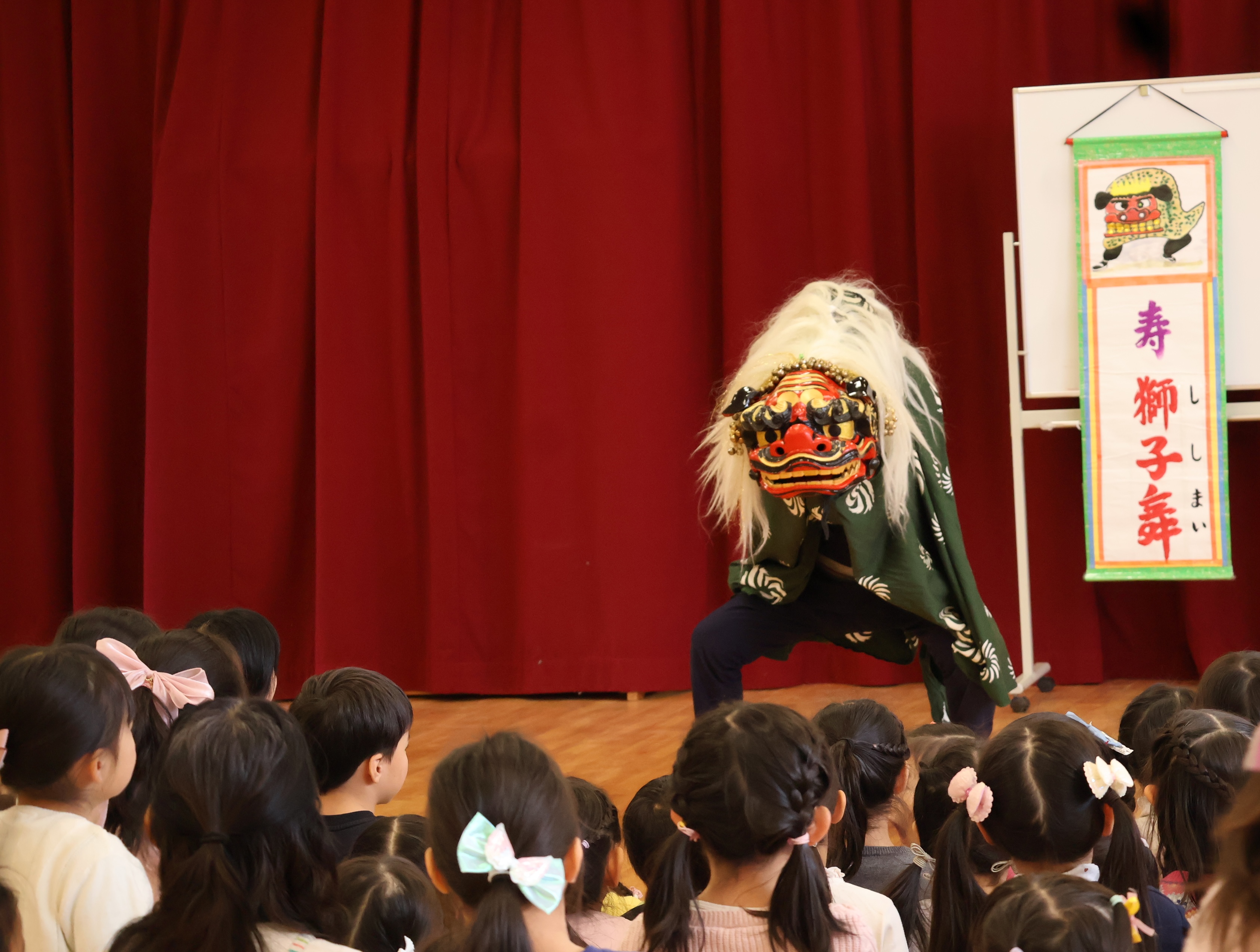「昔あそび~伝統芸能~」では、祝い唄や相撲甚句、獅子舞など、日本に受け継がれてきた伝統芸能にふれる時間となりました。リズムに合わせて声を出したり、獅子舞の迫力に驚いたりと、子どもたちは五感を使って“本物”の文化を体感していました。