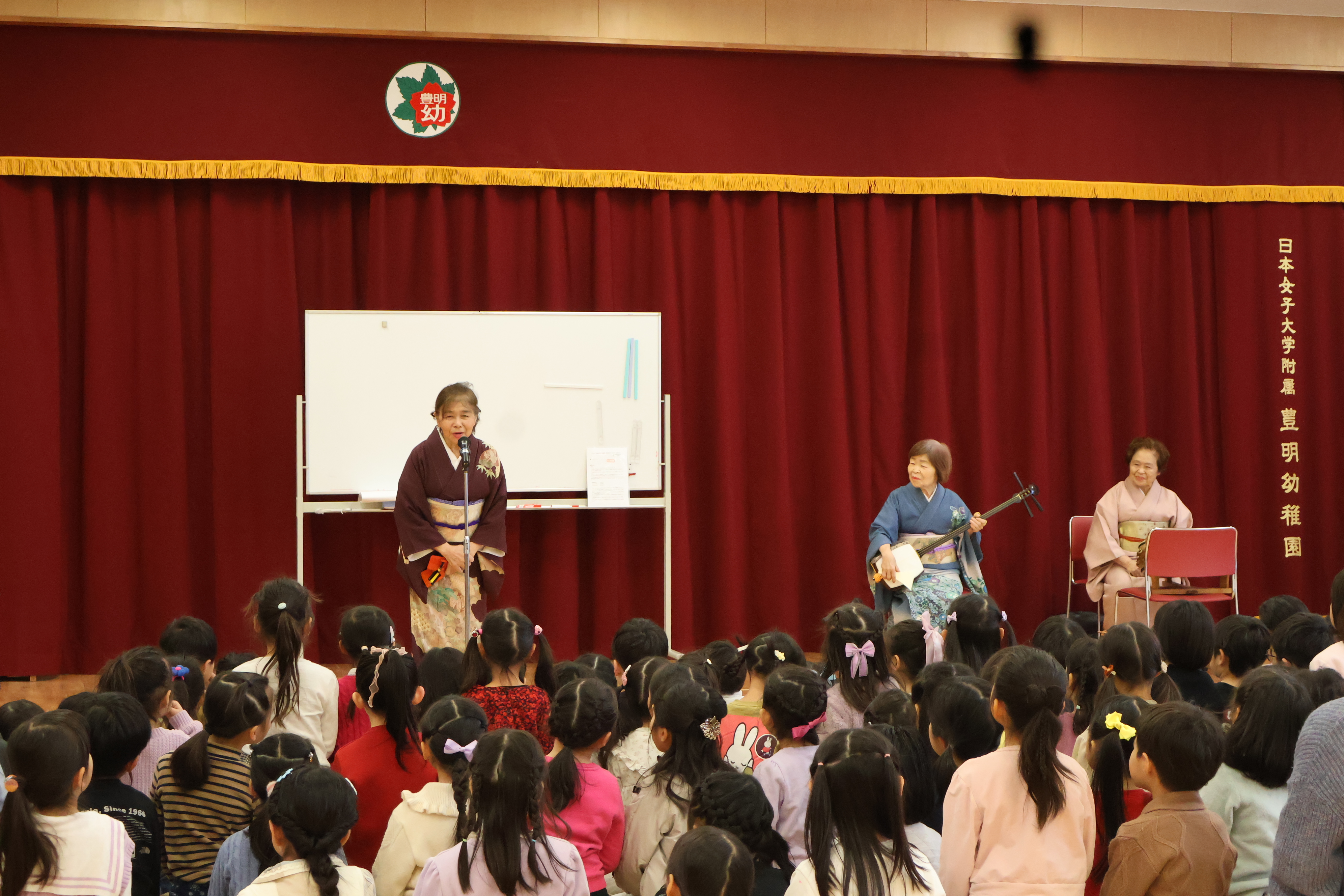 1月20日(火)、越谷伝承民謡舞保存会の皆様による「昔あそび~伝統芸能~」と、保護者ボランティアのお力をお借りした「お正月遊び」のイベントを行いました。