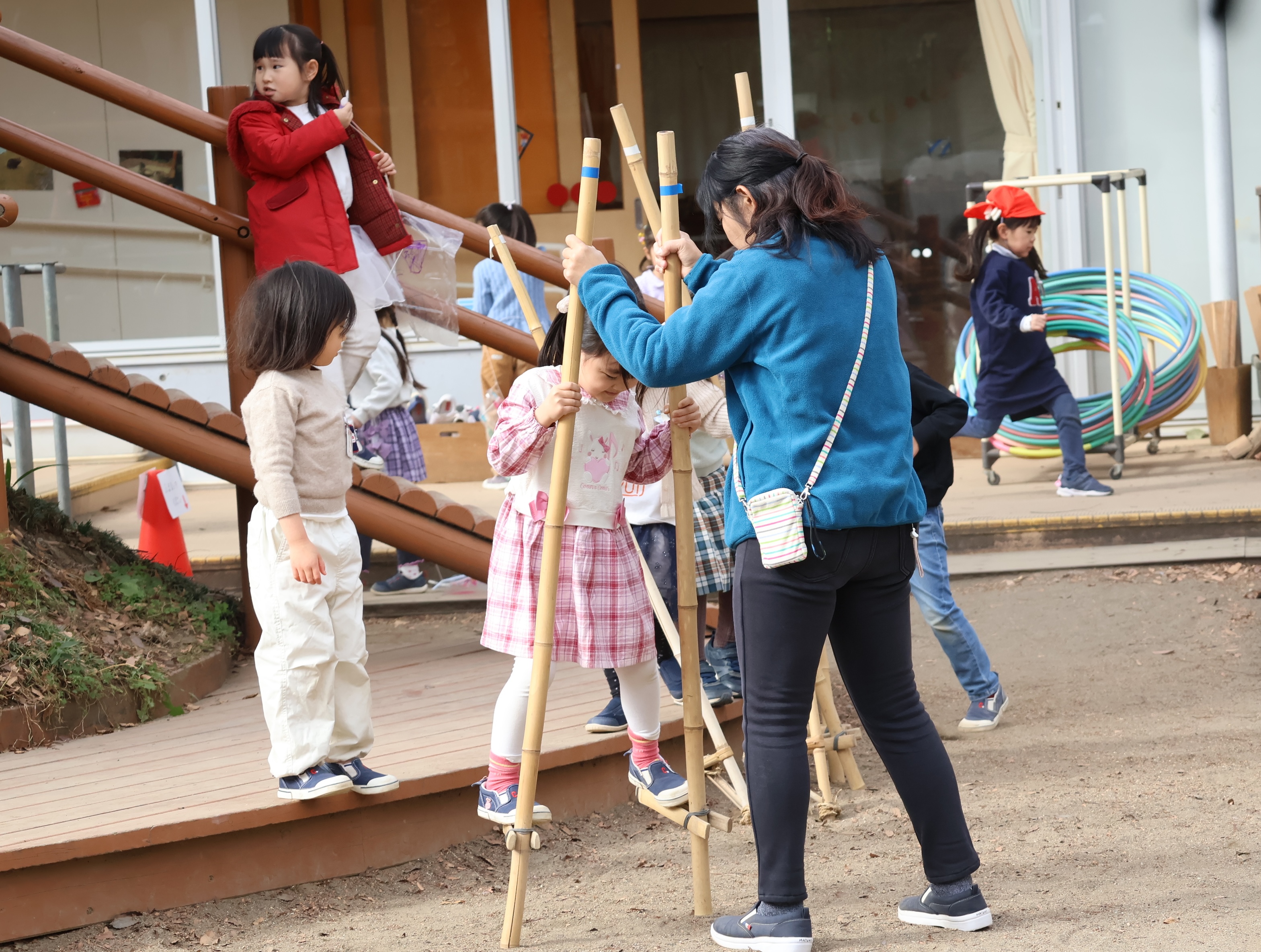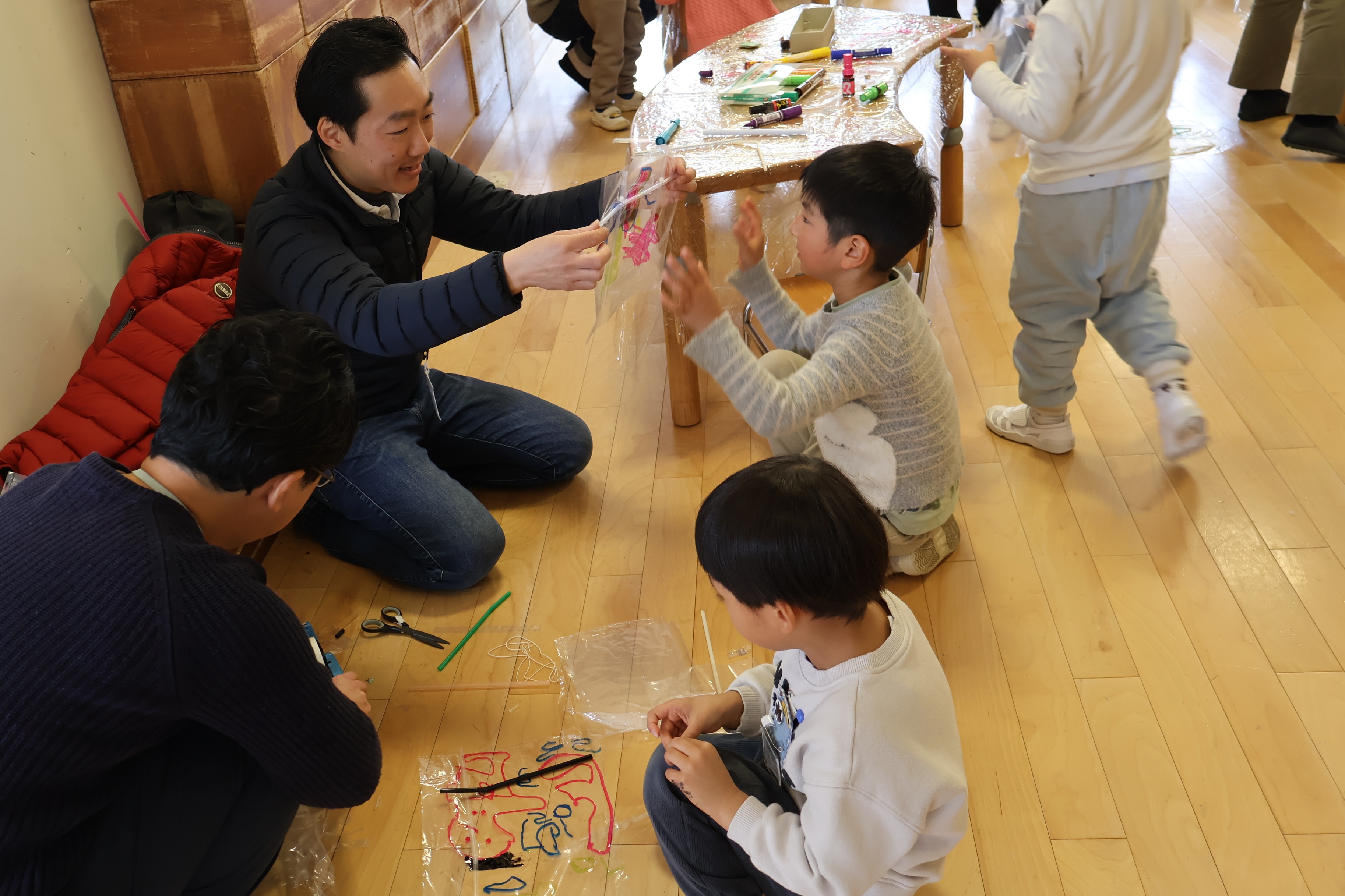 ホールでは、父親ボランティアの皆様が中心となり、竹とんぼやぶんぶんゴマ、凧づくりなど、昔ながらの遊びを子どもたちと一緒に楽しみました。
