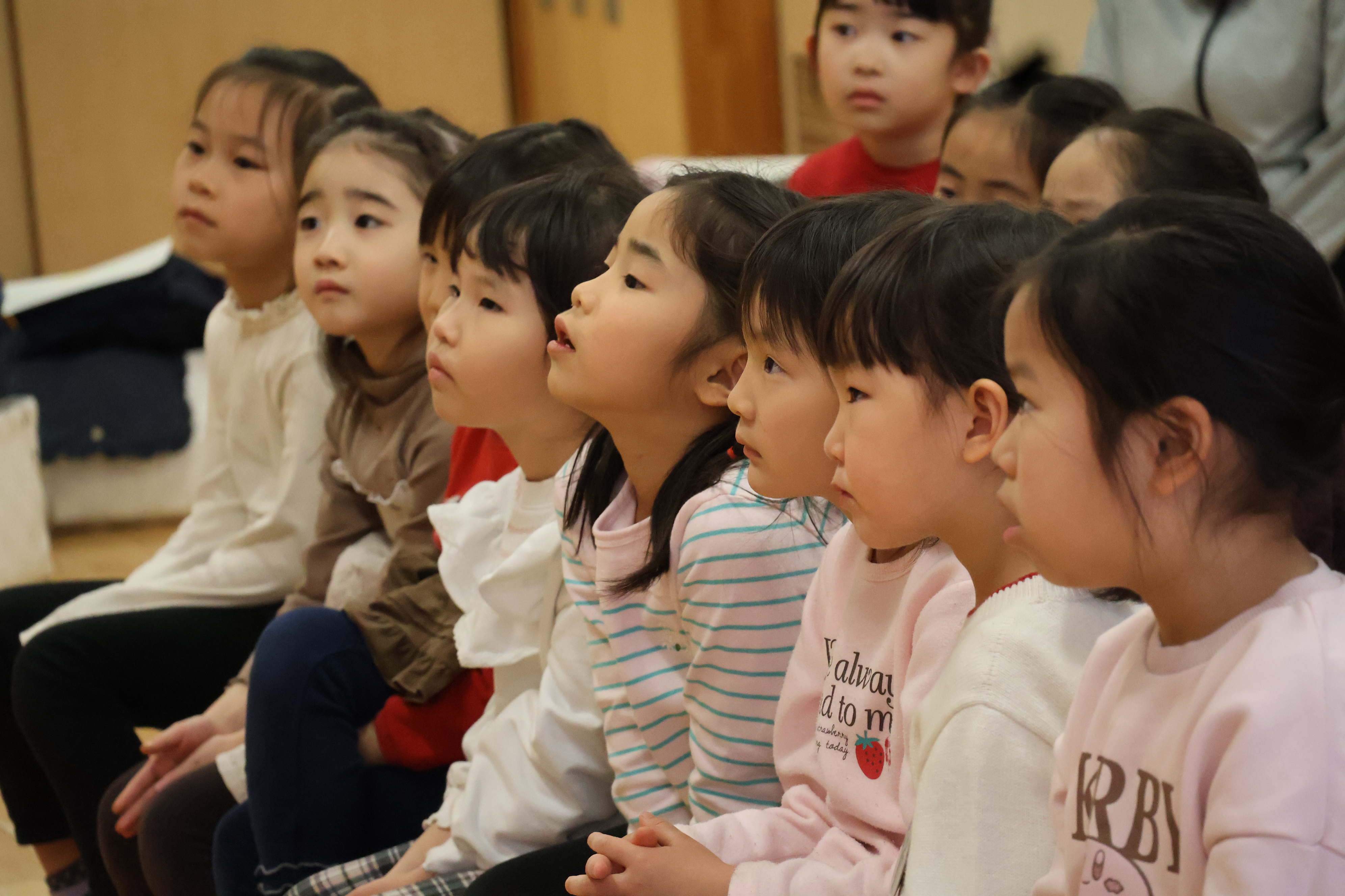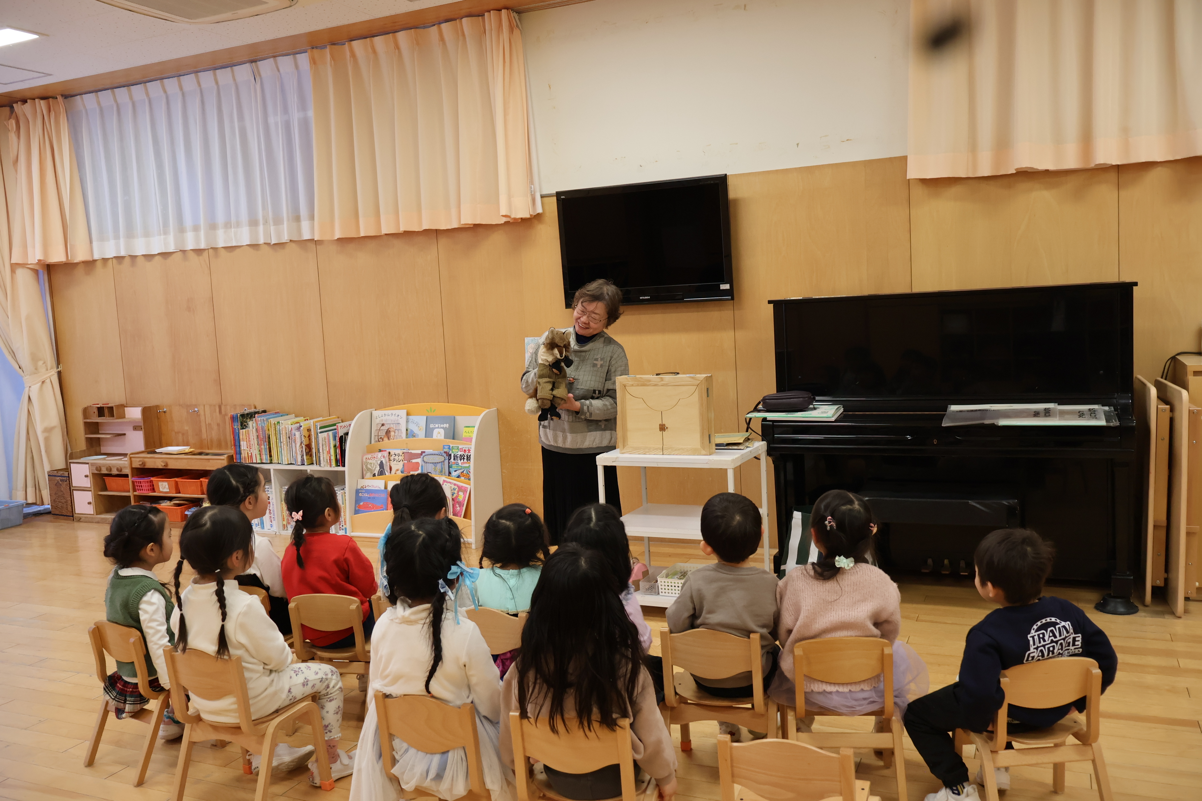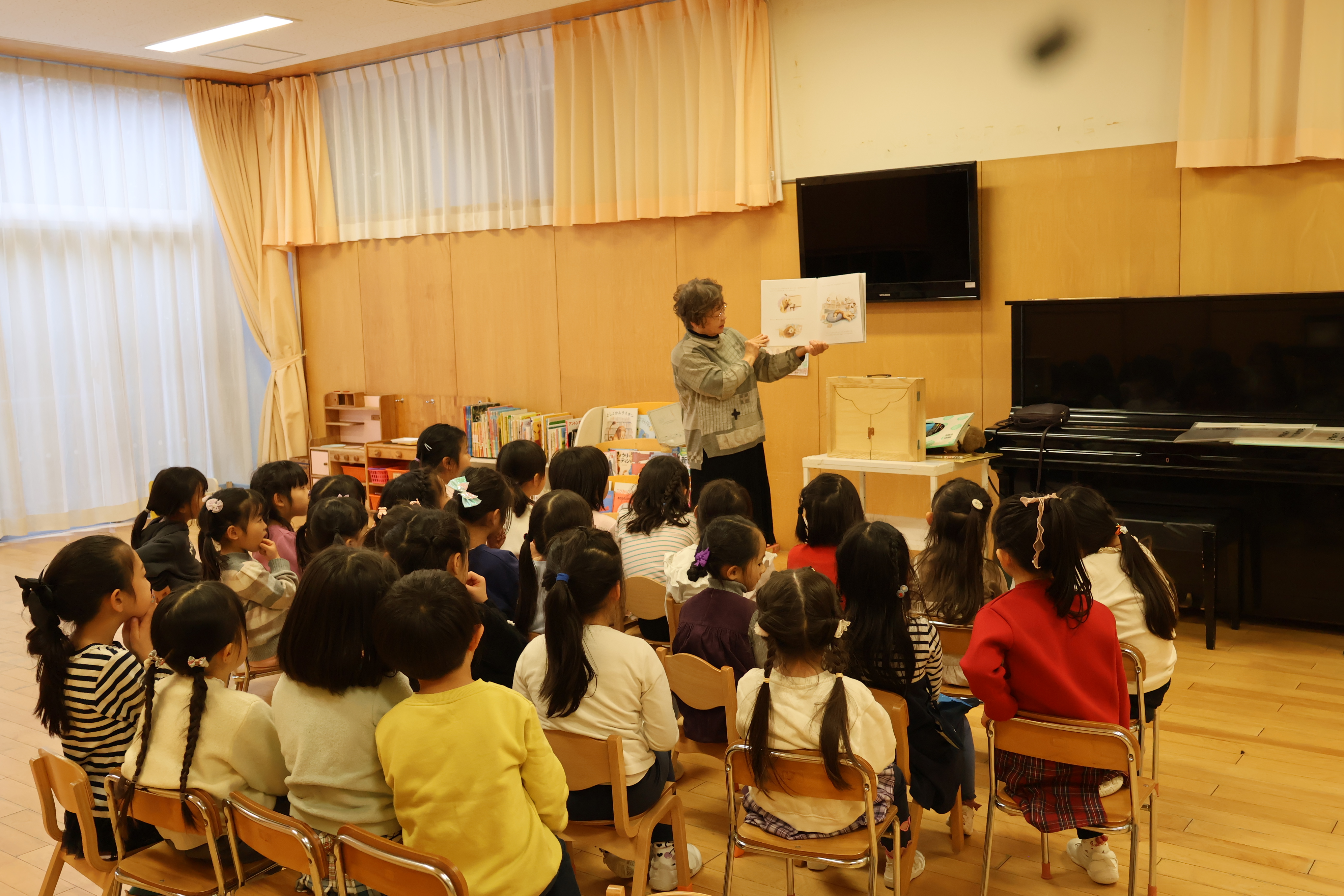登場人物になりきった先生の声色や表情に、子どもたちは自然と引き込まれ、じっと耳を澄ませながら、一つひとつの場面に見入っていました。