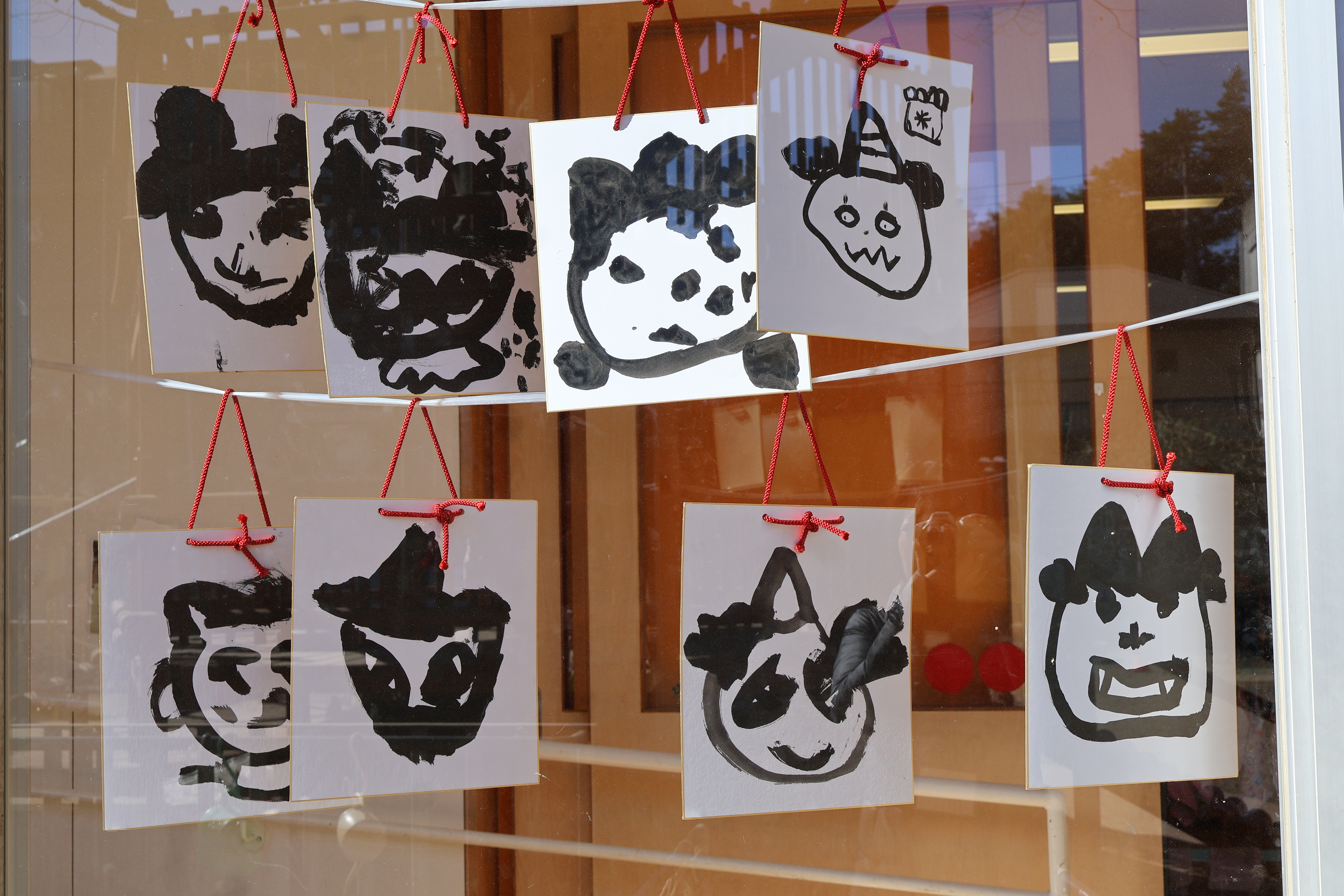 節分に向けて、年少組では鬼のお面づくり、年中組は墨で鬼の絵を描き、年長組はグループ別に大きな立体の鬼を作りました。