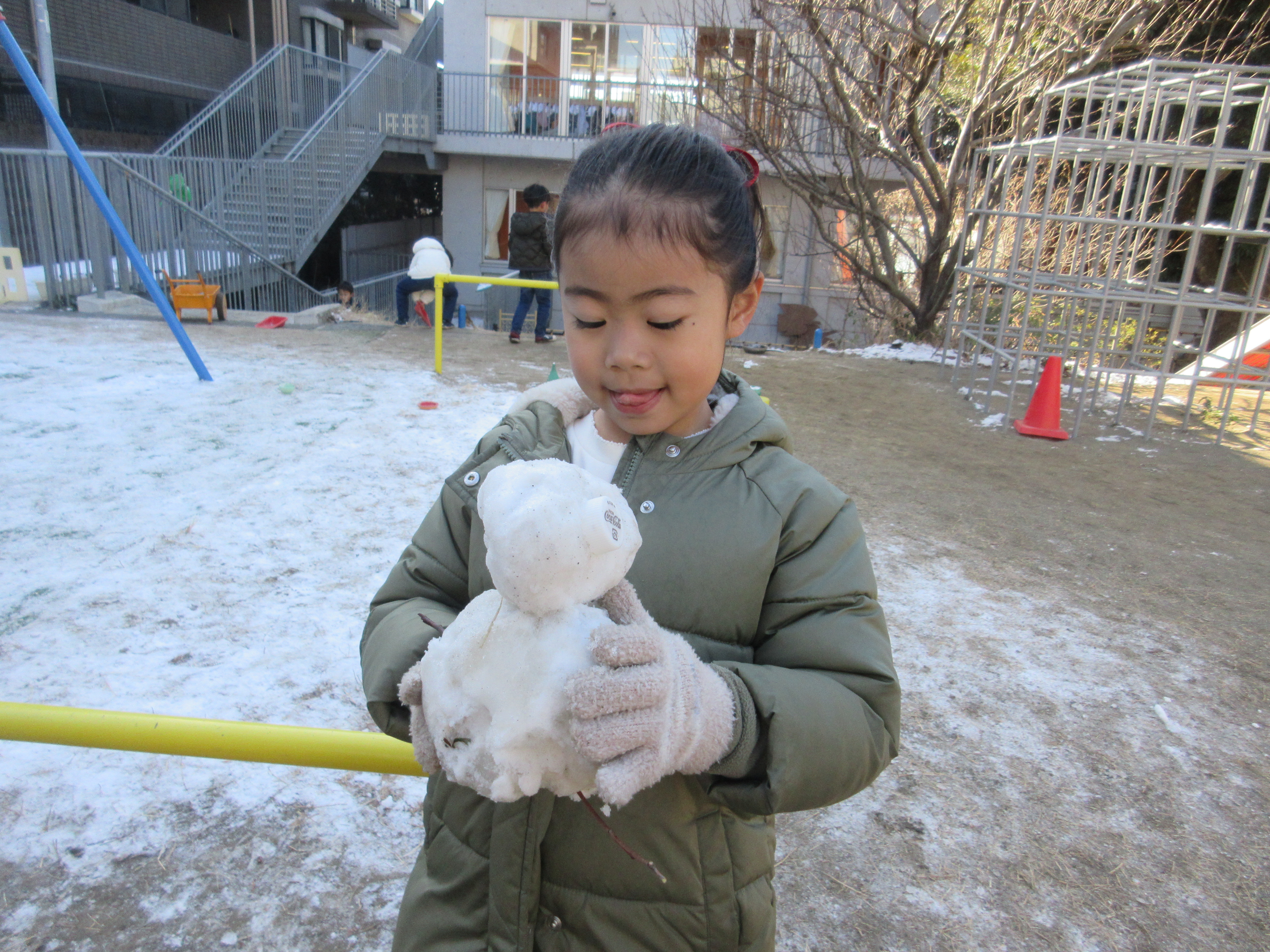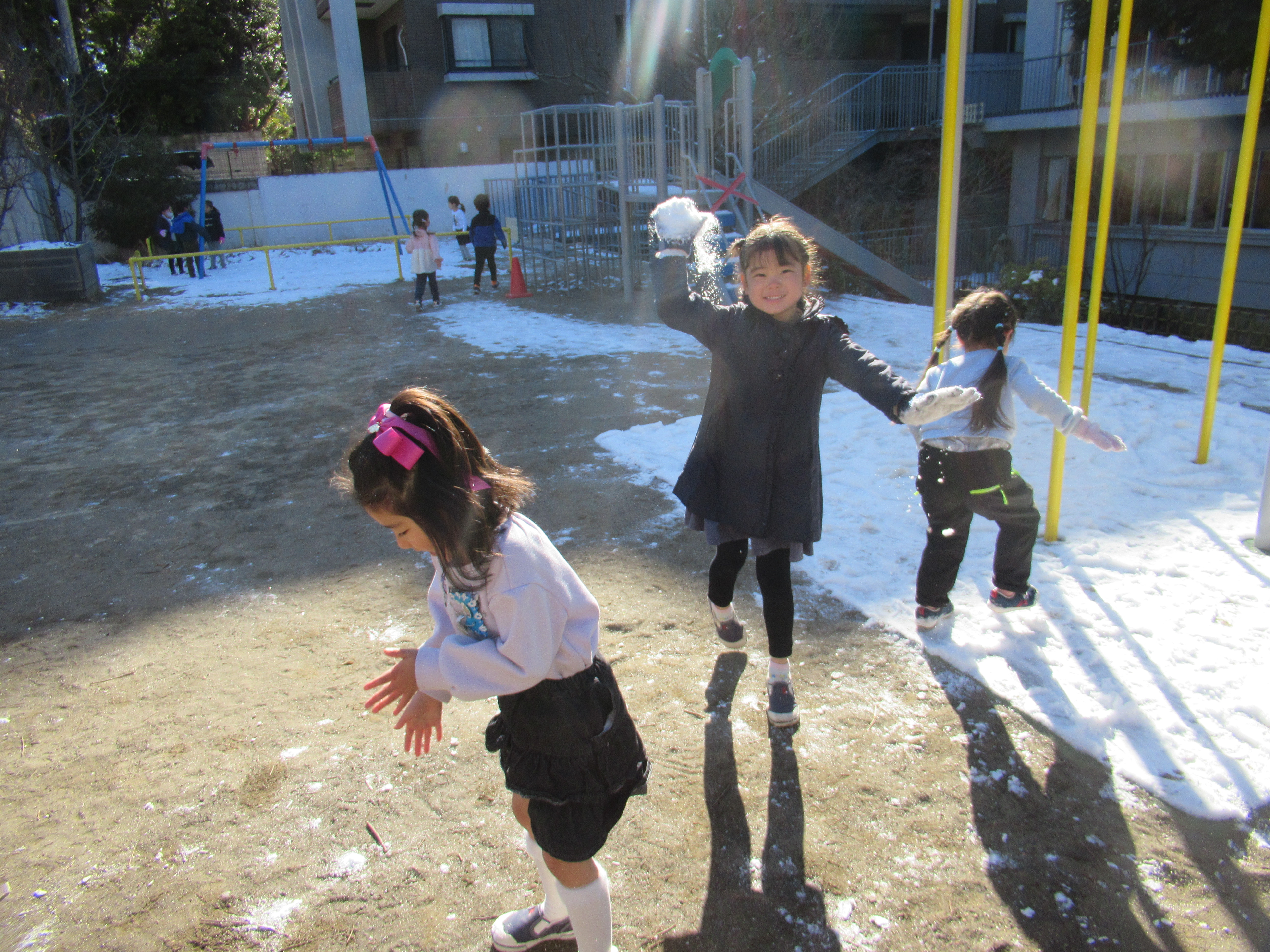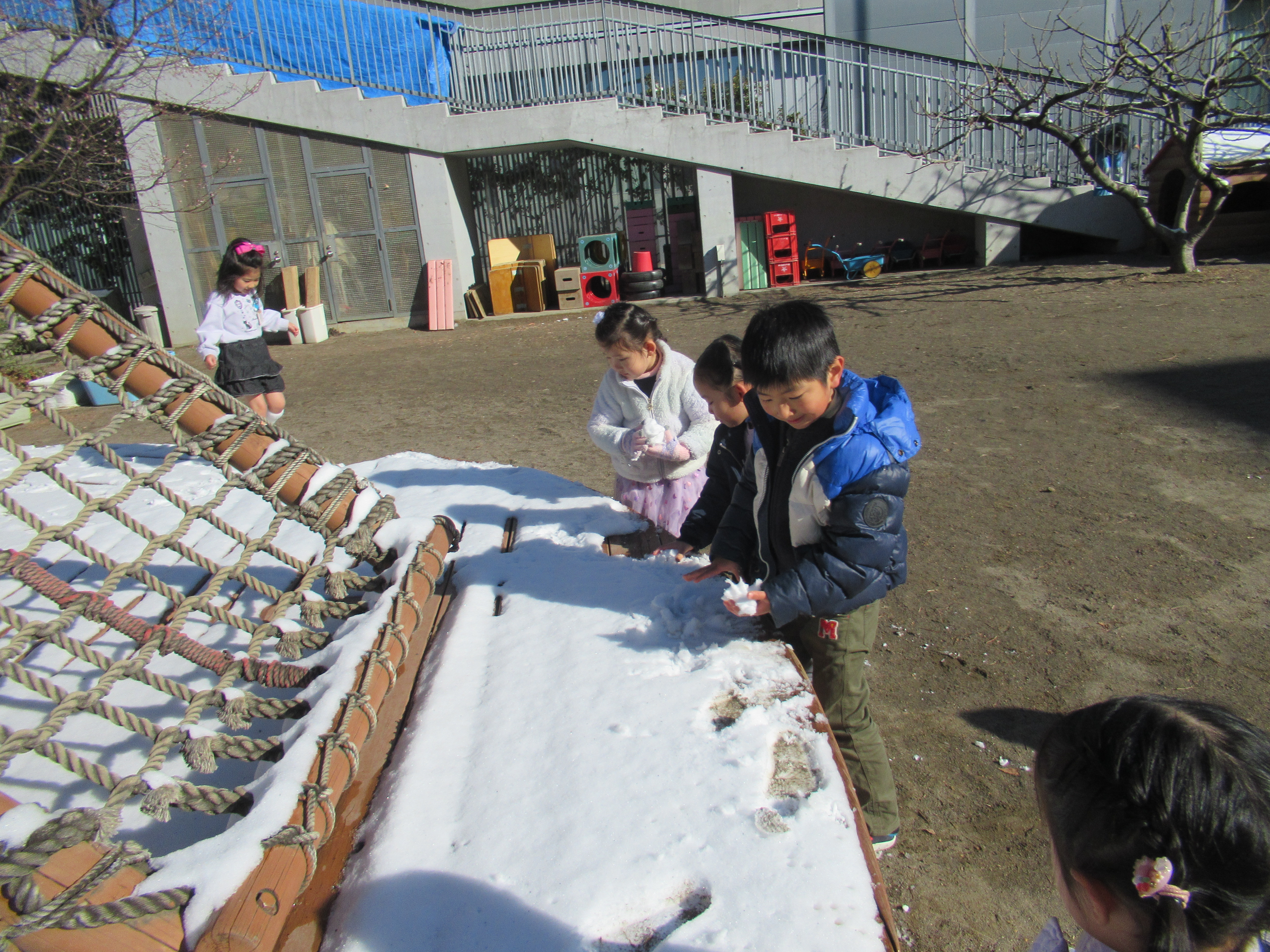 降り積もった雪を目にした子ども達は大喜び!目を輝かせながら園庭やテラスに向かって走り出していきました。