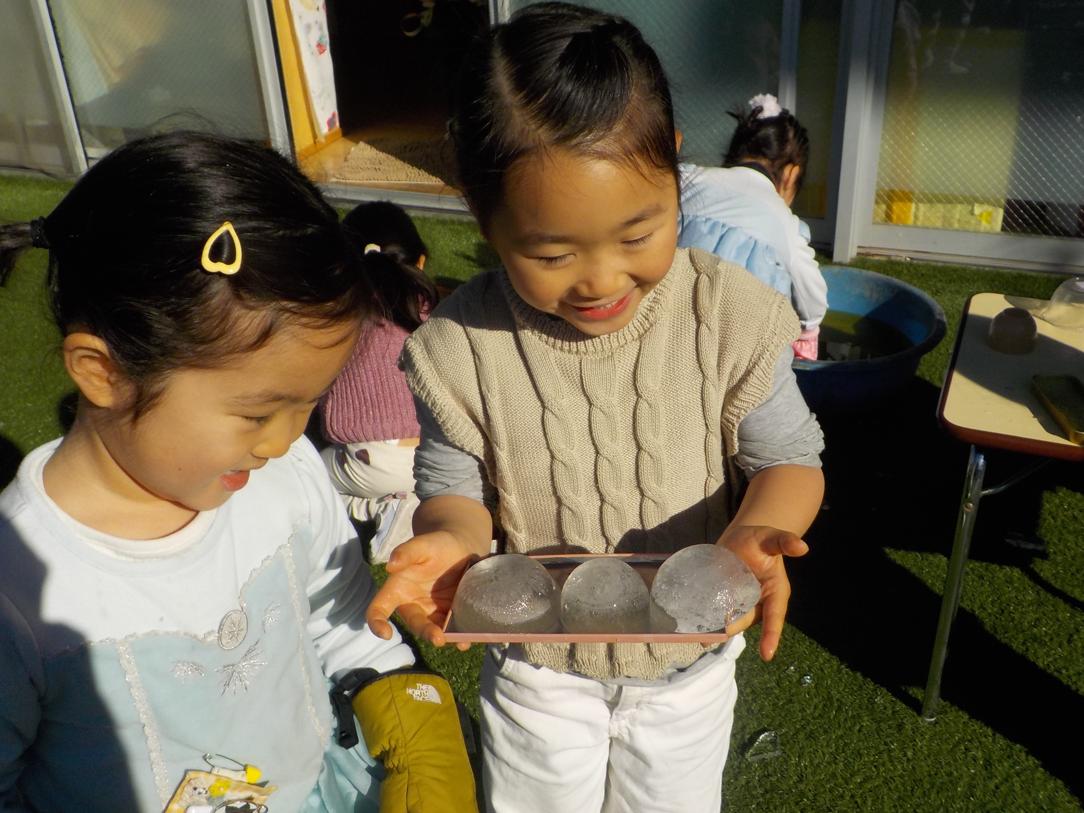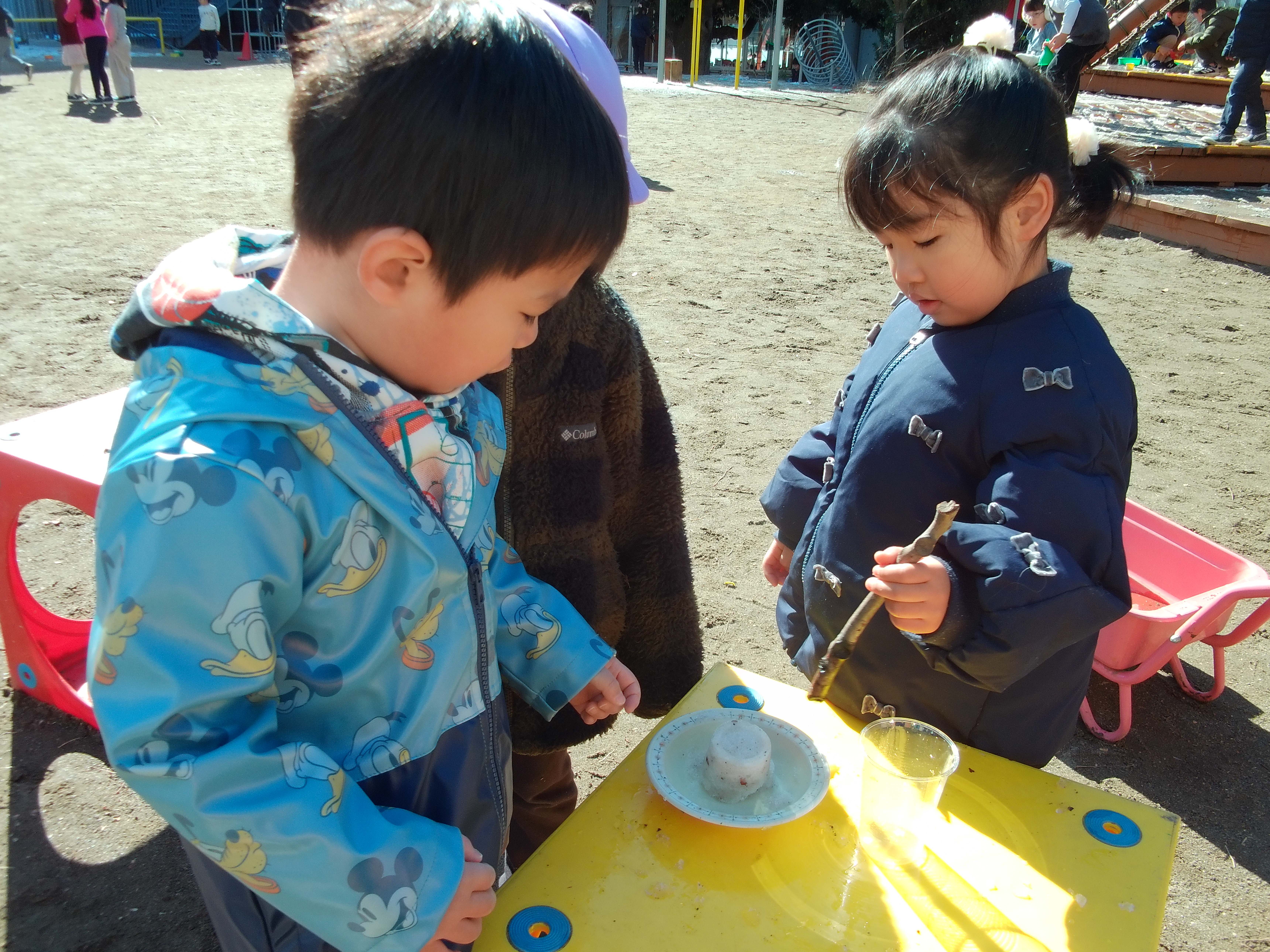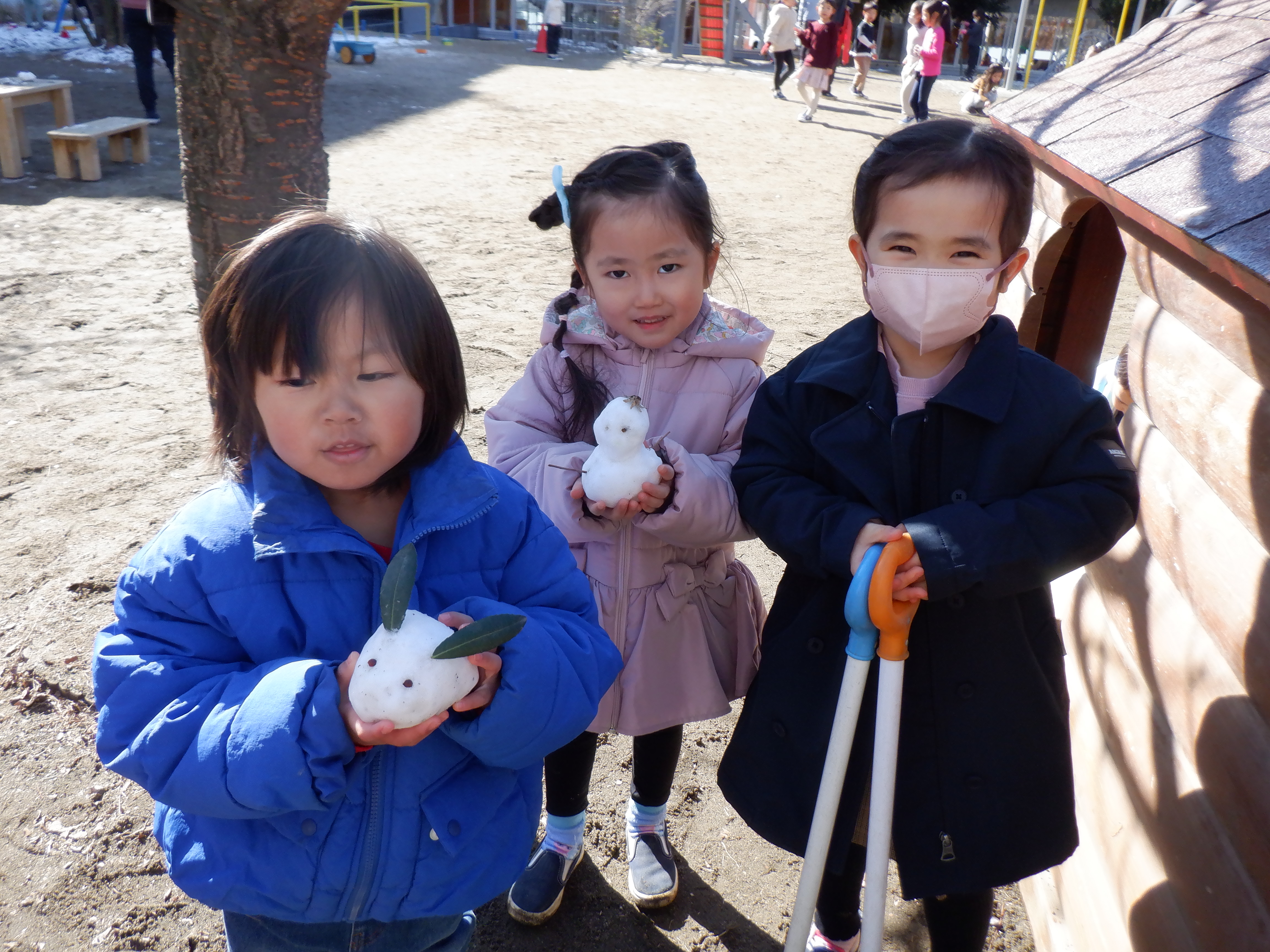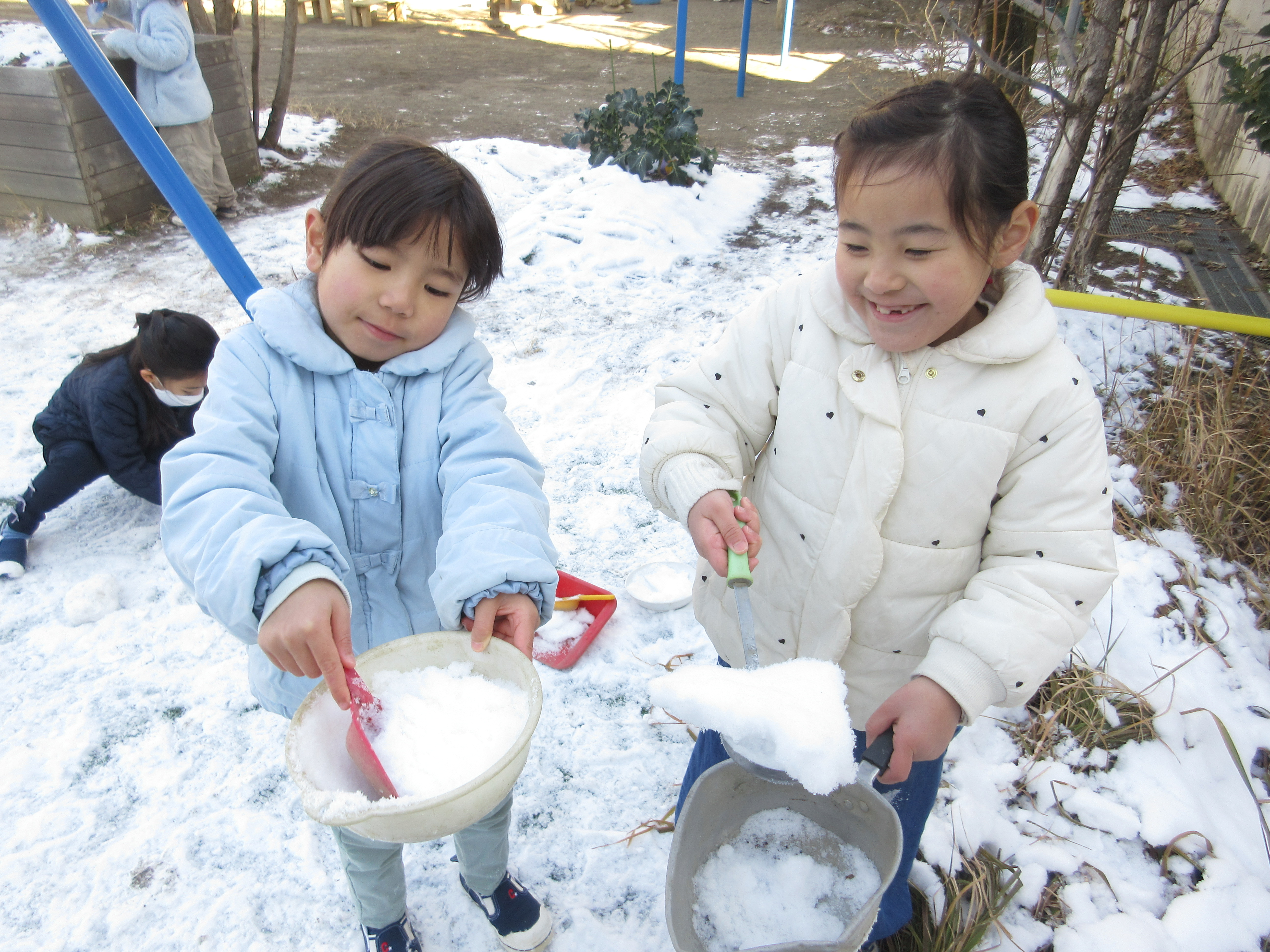雪合戦が始まったり、かき氷屋さんが開店したり、繰り返しソリ滑りをしたり、冬ならではの遊びを楽しみました。