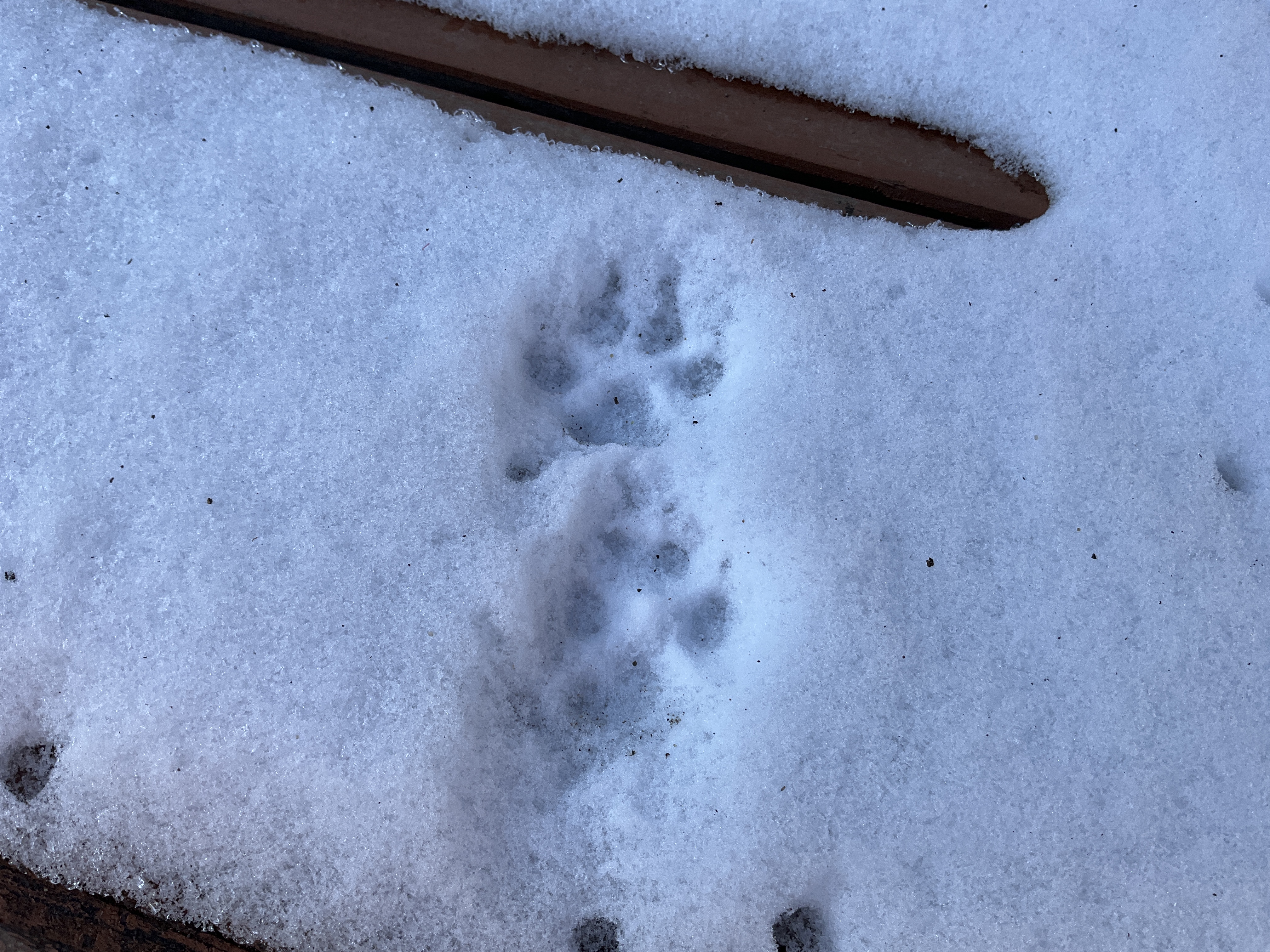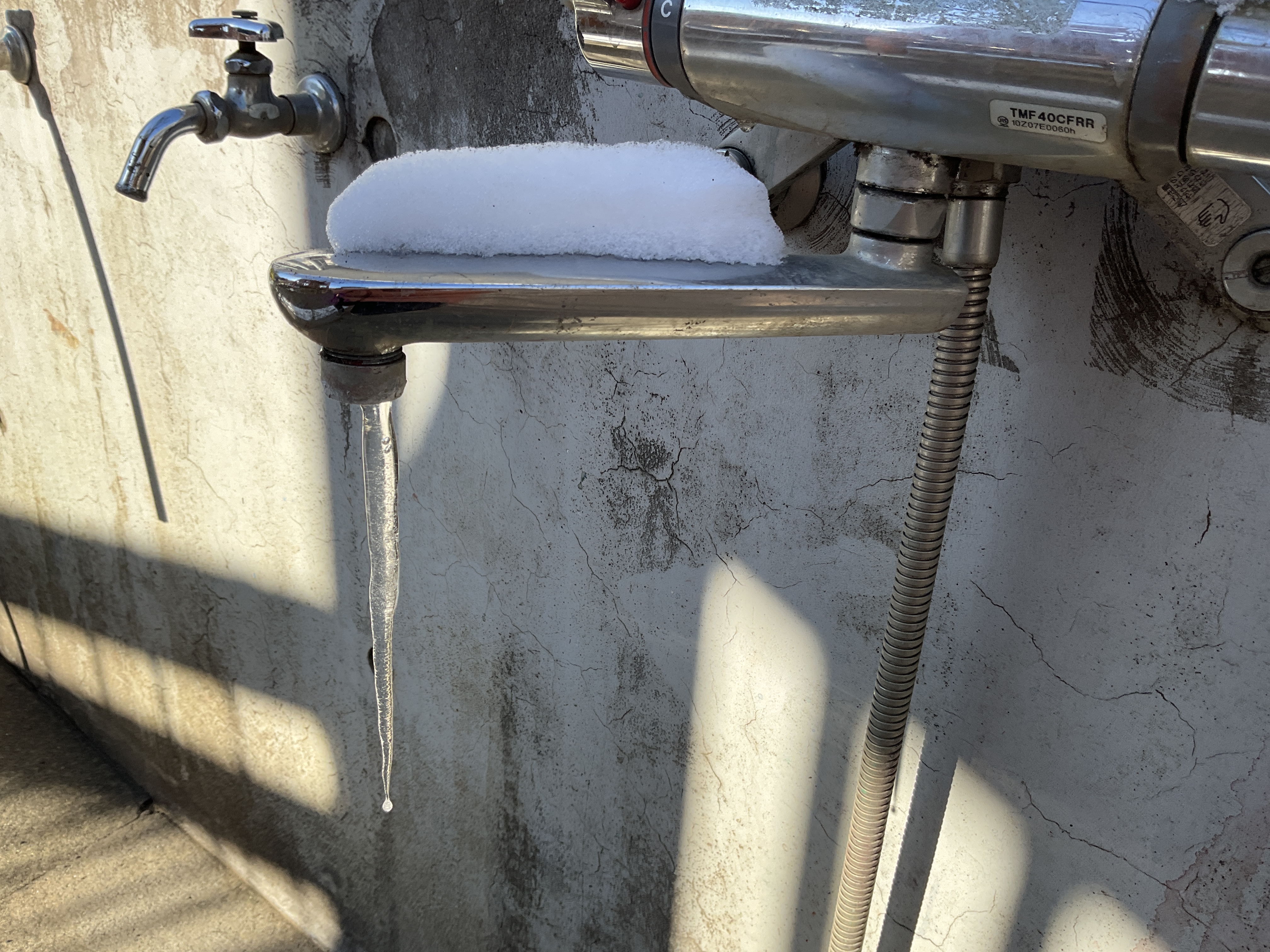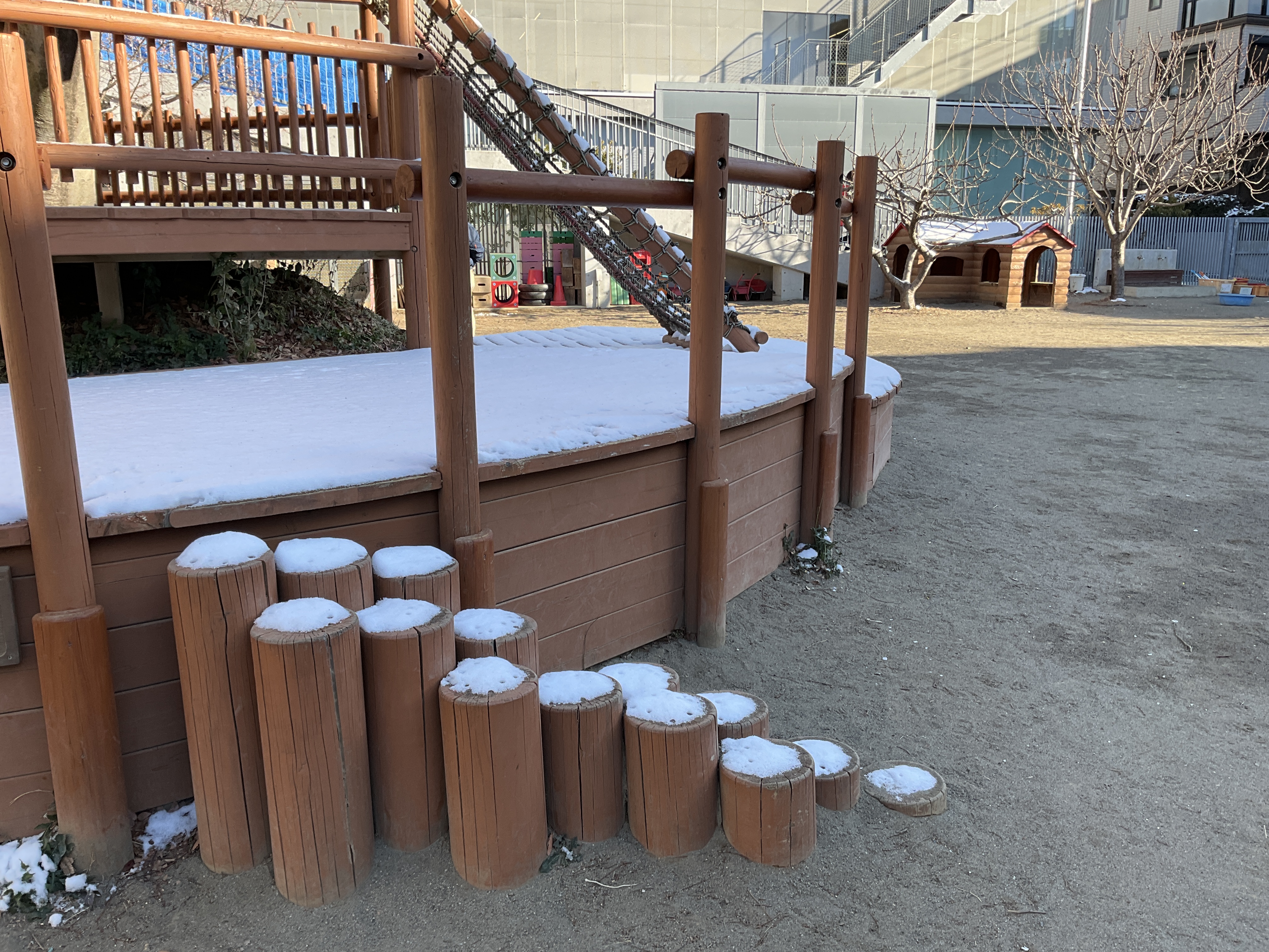 予め氷が張るように置いておいたタライやカップ等には、いつもよりも厚みのある氷ができあがり、水道には氷柱、ツリーハウスに積もった雪には動物の足跡も・・・
