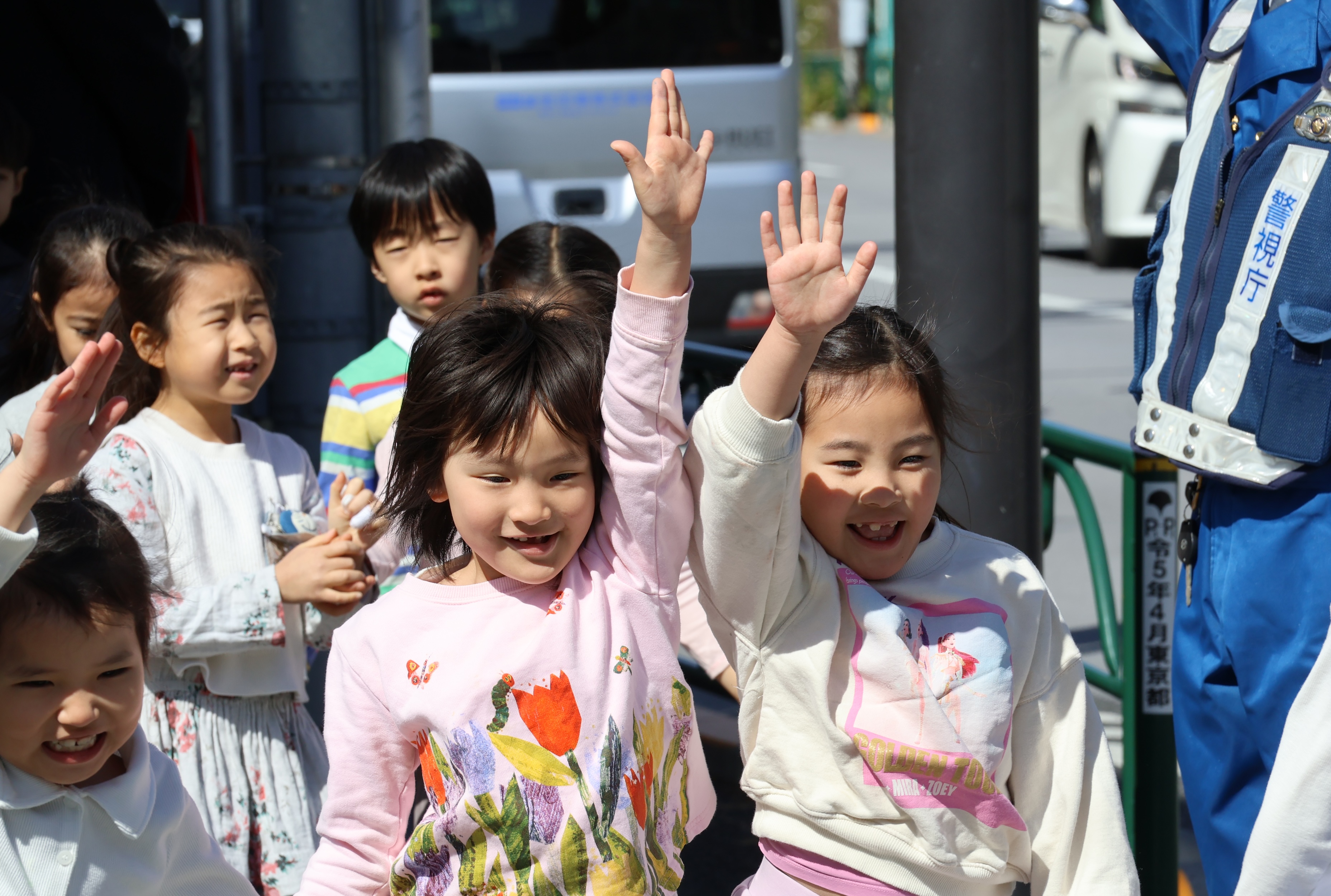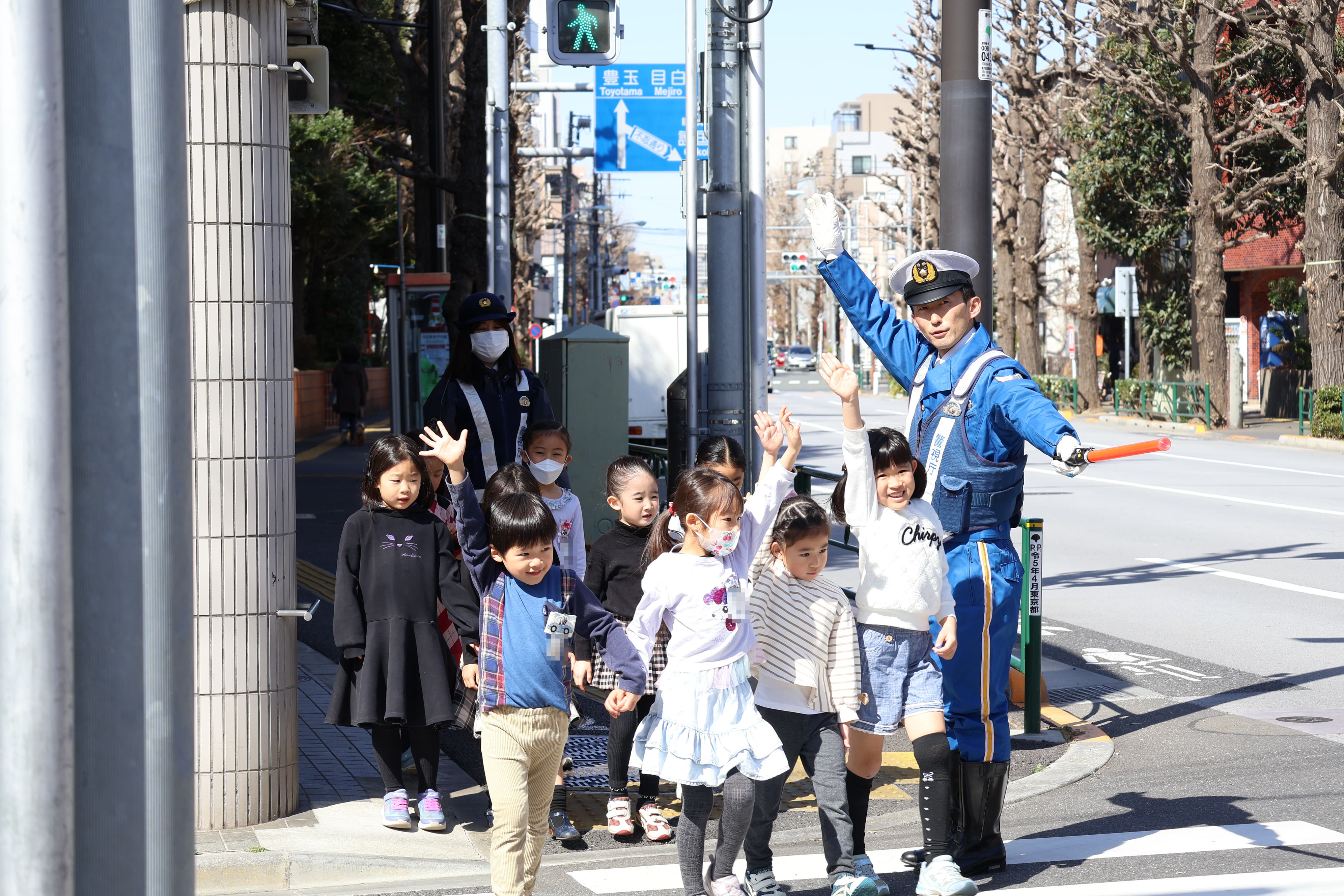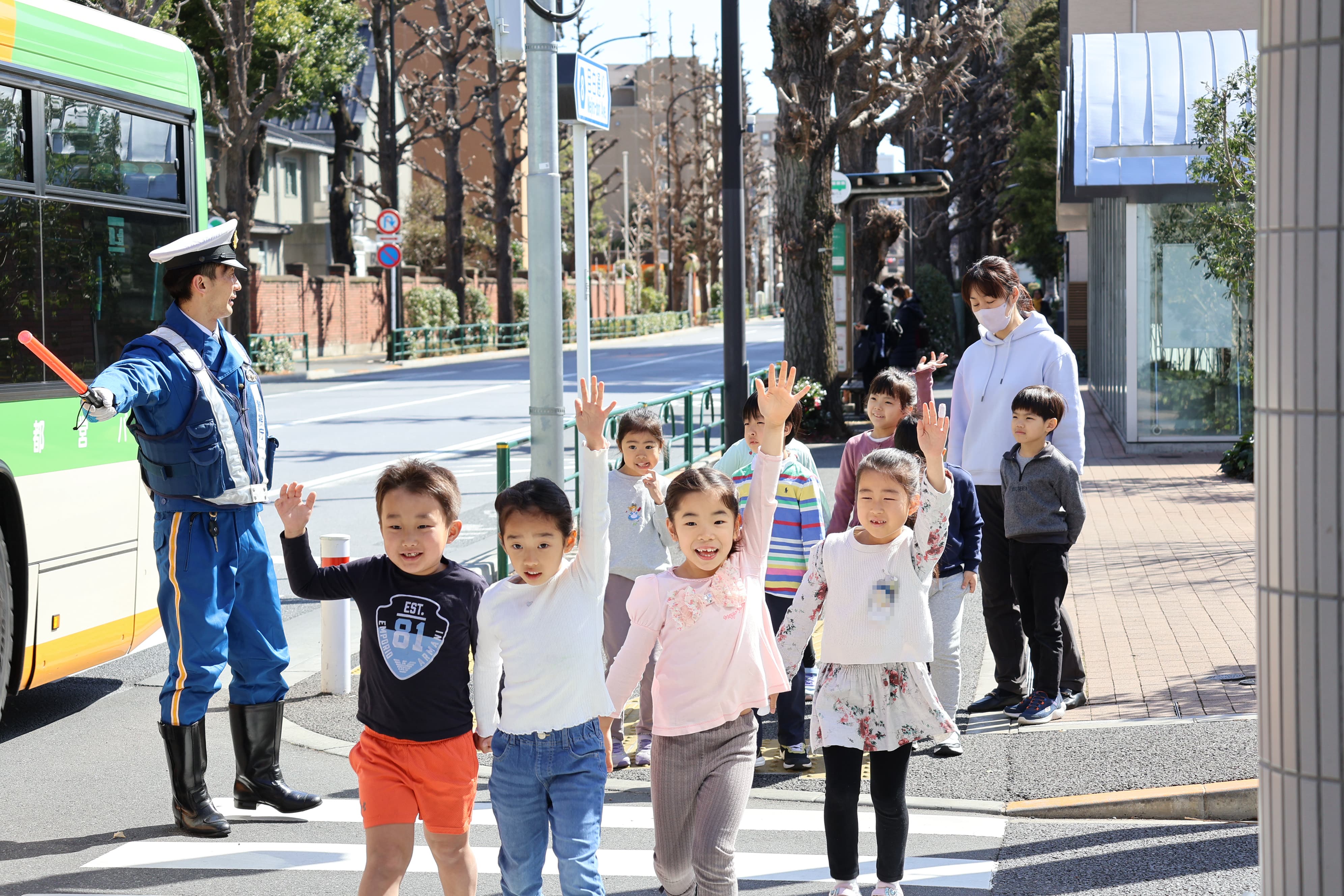 その後、実際に幼稚園前の信号まで移動し、横断歩道を渡る練習を行いました。警察の方に見守られながら、子どもたちは「右、左、右」と周囲を確認し、手を挙げて横断歩道を渡ります。小学校の門まで歩きながら、春から始まる登下校を具体的にイメージする時間にもなりました。