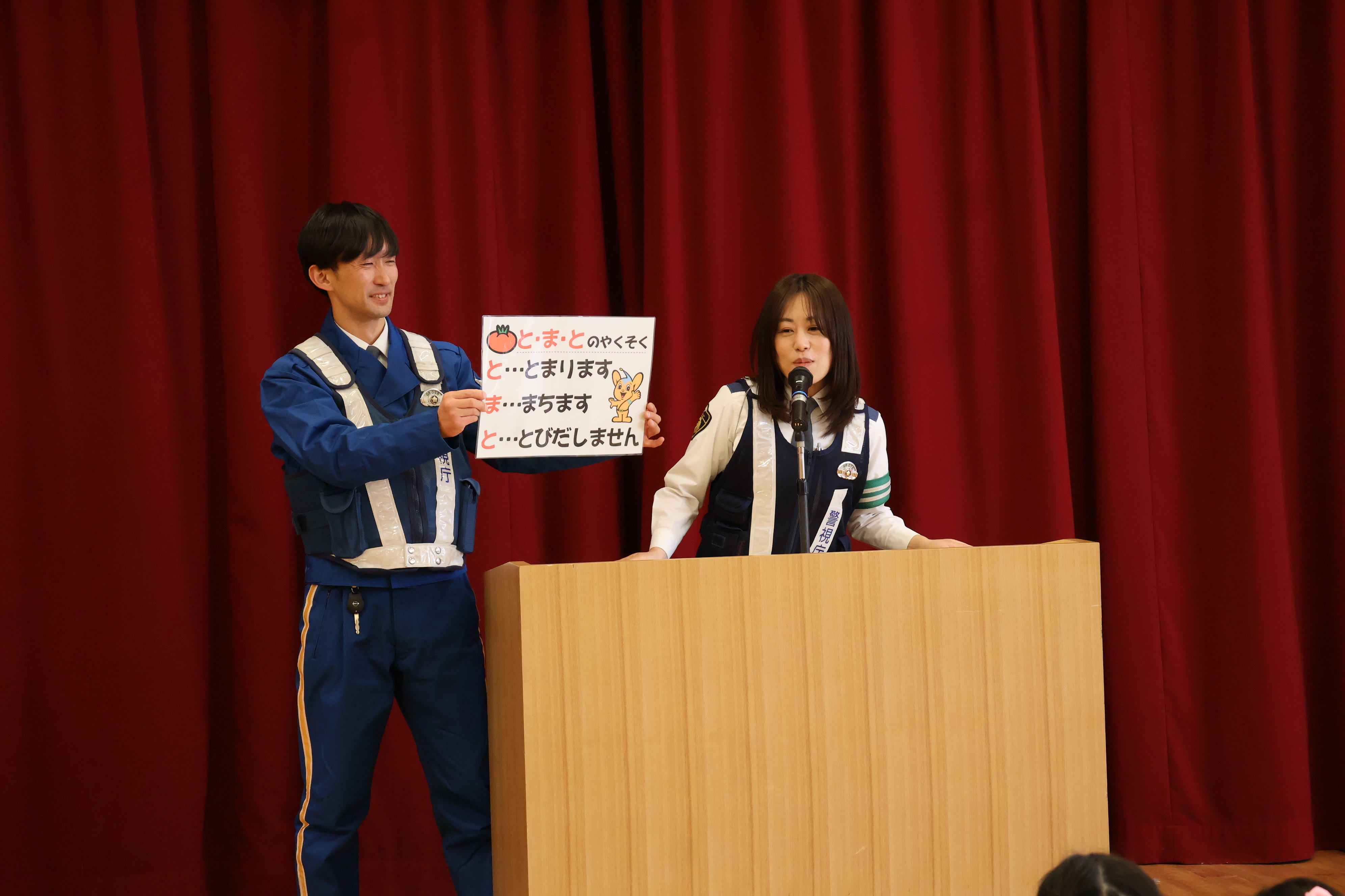 遊戯室では、交通ルールについてのお話を伺いながら、『とまとの約束』(止まる・待つ・飛び出さない)を確認しました。子どもたちは警察の方のお話に耳を傾けながら、交通安全の大切なポイントを学びました。