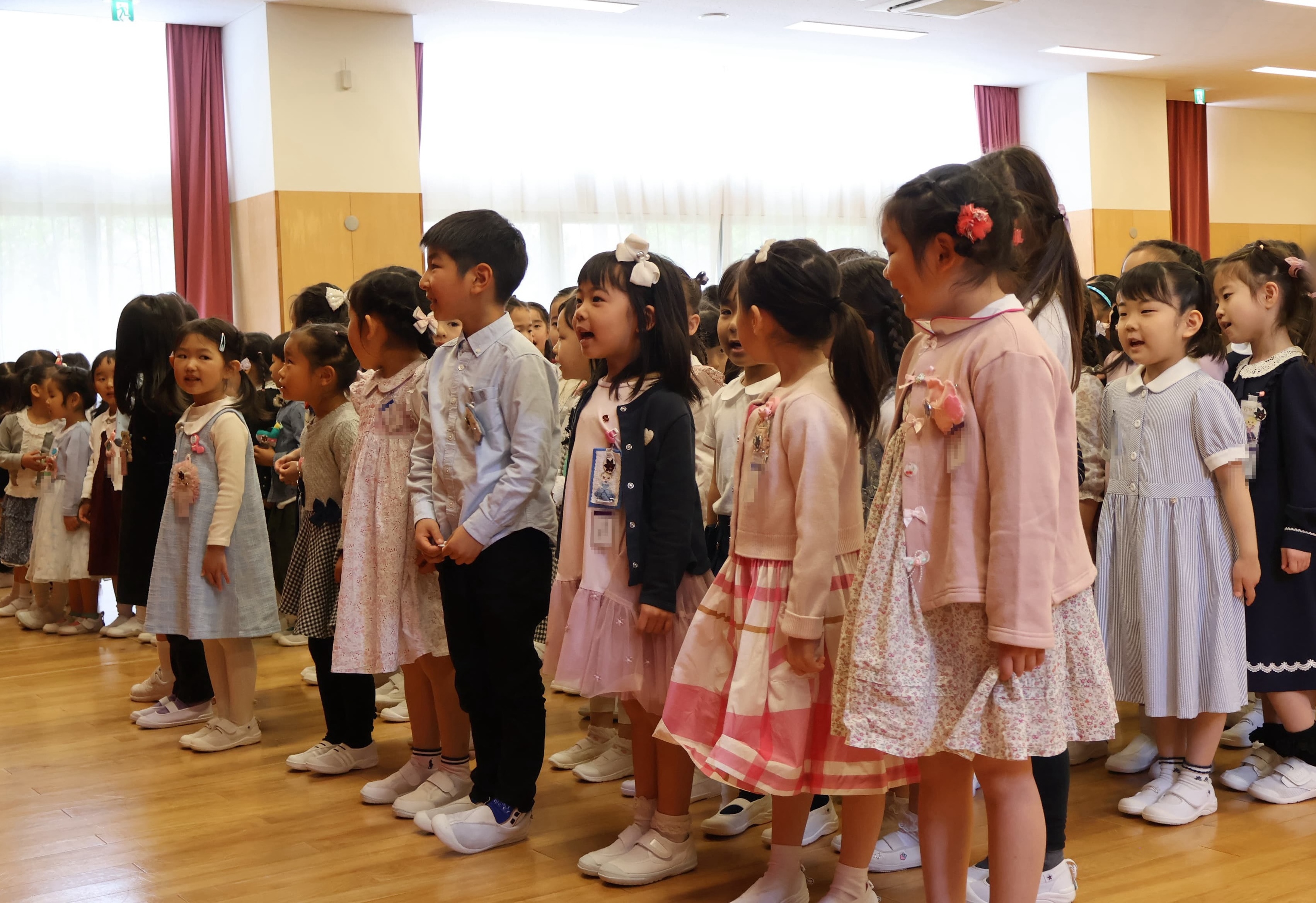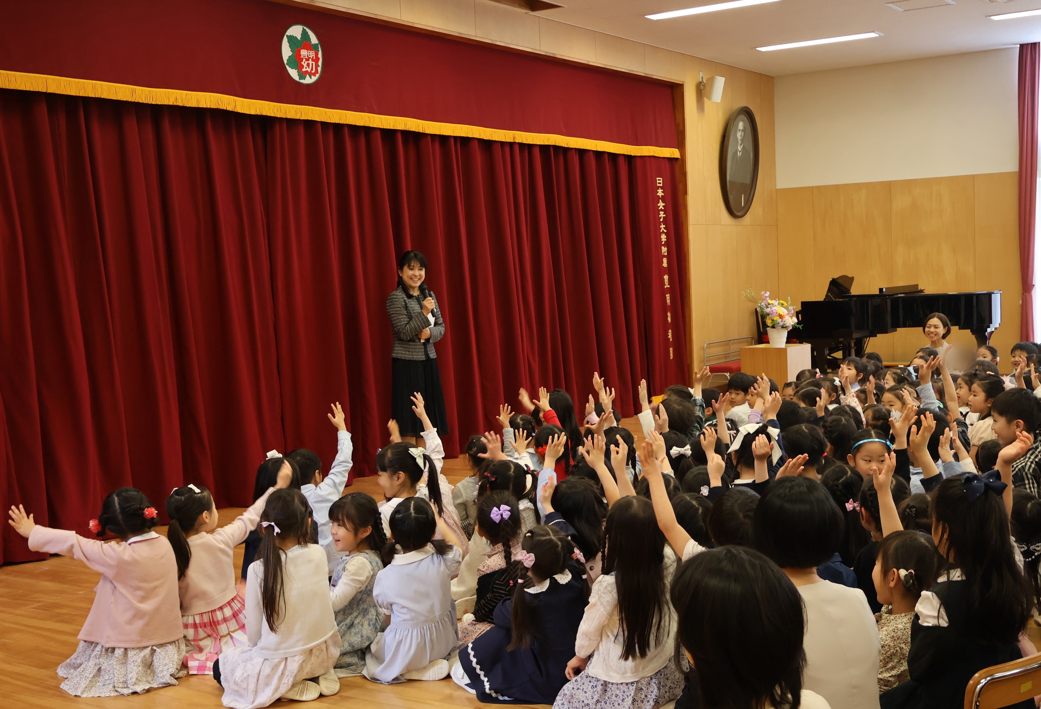 集まりの最後には「豊明幼稚園の歌」と「チューリップ」をみんなで歌い、明るく元気な歌声が広がりました。
