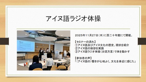 本活動では、アイヌ語を単なる「失われつつある言語」として捉えるのではなく、現代社会においていかに継承し、未来へとつないでいくかを考察することを目的としました。