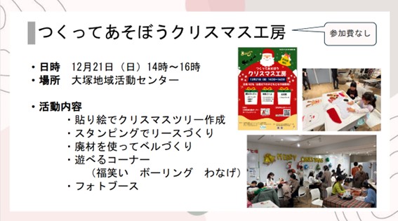 子どもたちに季節の行事を楽しむ機会を提供するだけではなく、保護者同士の交流が生まれる環境作りを行うことも目標に、10月には秋のイベント、12月にはクリスマス会の開催を企画しました。